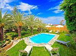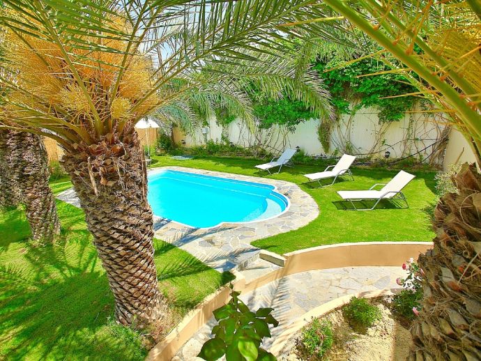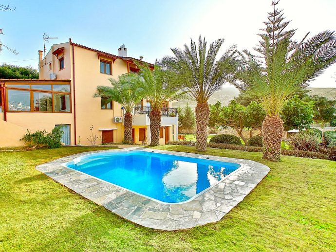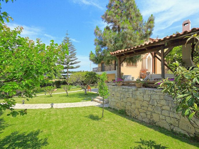 Villa Denise is a spacious holiday home with a large private pool, immaculate gardens and sea views located 800 meters from a sandy beach in the bay of Karteros. The villa is fully air-conditioned and can accommodate 10/11 guests in welcoming, traditionally furnished yet functional interiors. Distributed over 3 floors, there are 5 bedrooms, 3 bathrooms, 2 fully equipped kitchens, dining and living areas, a utility room and an outdoor gym, so a perfect choice for large families or groups of friends. The outdoor areas are truly stunning with 1000 m² of beautiful gardens with a well-maintained lawn, palm trees, scented flowers and shrubs. The private pool measures 6 x 13.5 meters and is equipped with sun loungers and illuminated at night creating a lovely holiday atmosphere and for the lovers of al-fresco dining, a large covered terrace with brick-built barbecue is provided. Villa Denise provides easy access to the sandy beaches of Karteros bay and the city of Heraklion with its wealth of history and attractions, ideal for a memorable holiday experience in Crete!