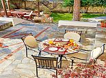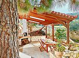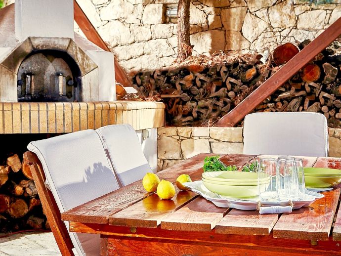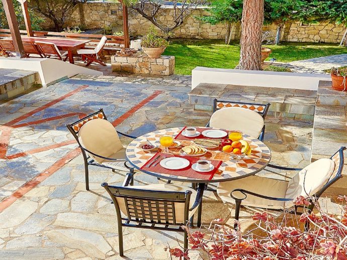 Covered terrace with brick-built barbecue and dining furniture.
