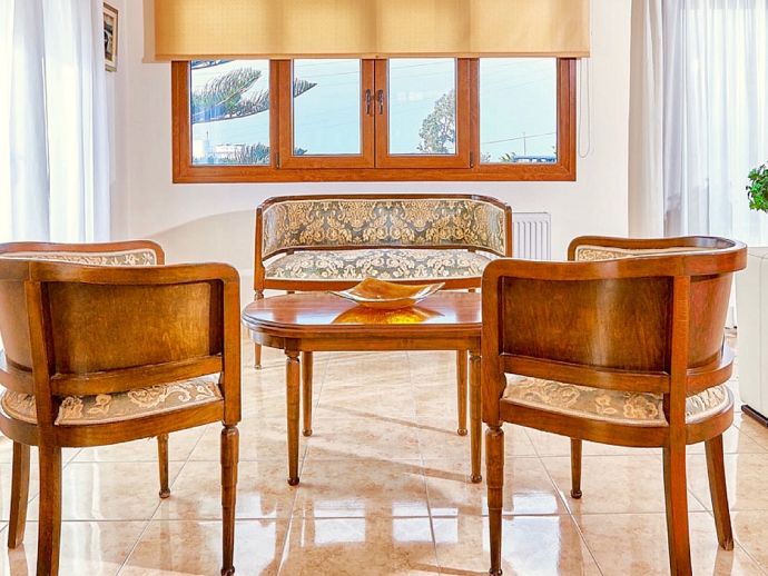 Entrance Level (Middle Floor) - Large Lounge with sofas, satellite TV, A/C and dining area, exit to the garden. Kitchen with dishwasher, 4 ceramic glass hob hotplates, microwave, electric coffee machine, crockery refrigerator, kettle, exit to the loggia/porch. Twin bedroom, A/C. Family shower room.