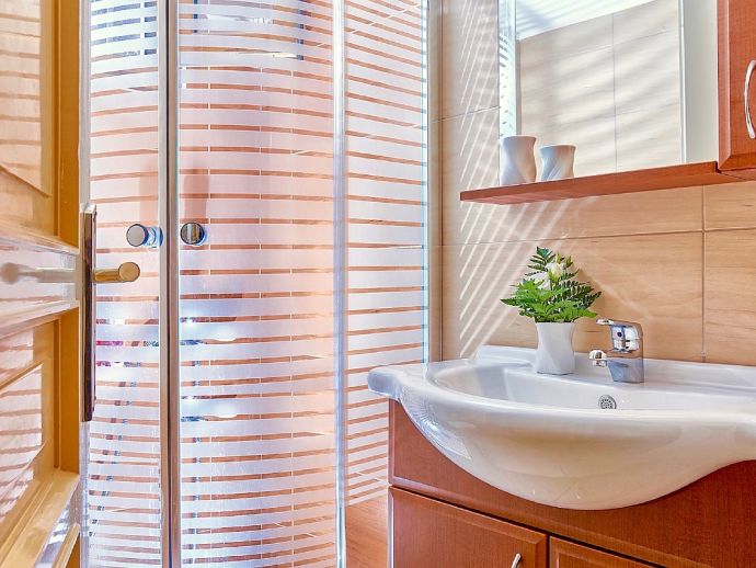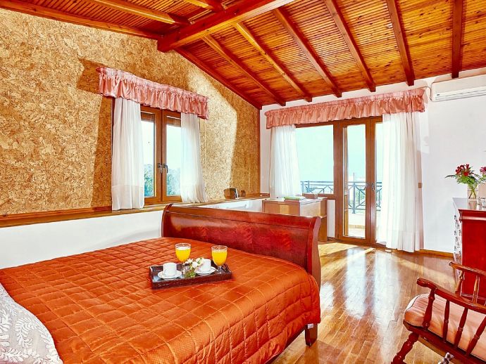 Upper Floor - Double bedroom, A/C, exit to a sea-facing balcony. Twin bedroom, A/C. Family bathroom with bathtub. Seating area with a sofa bed.