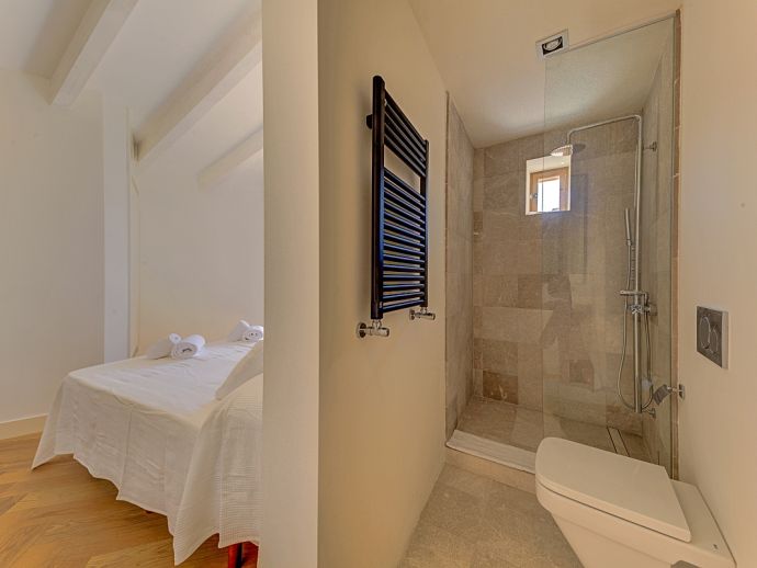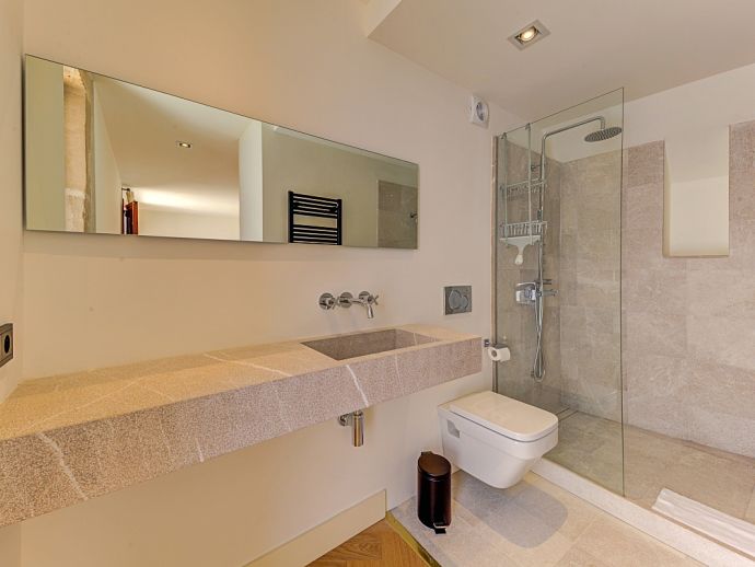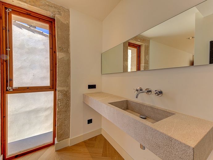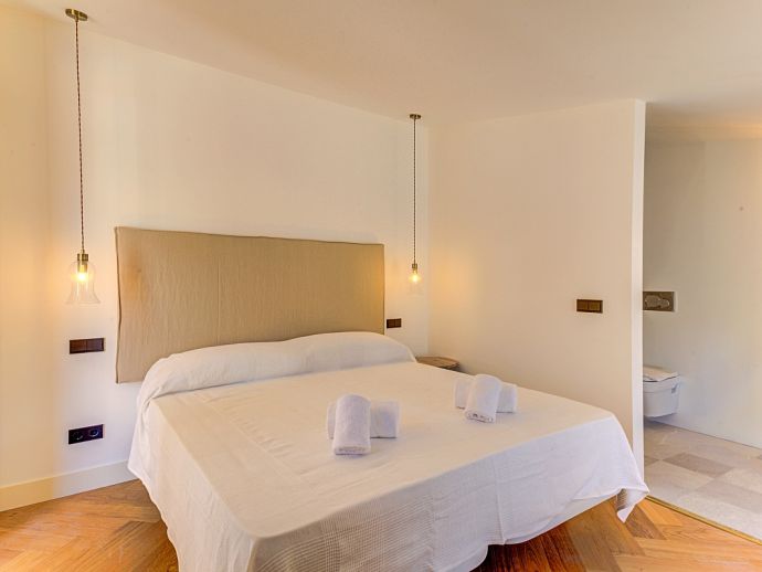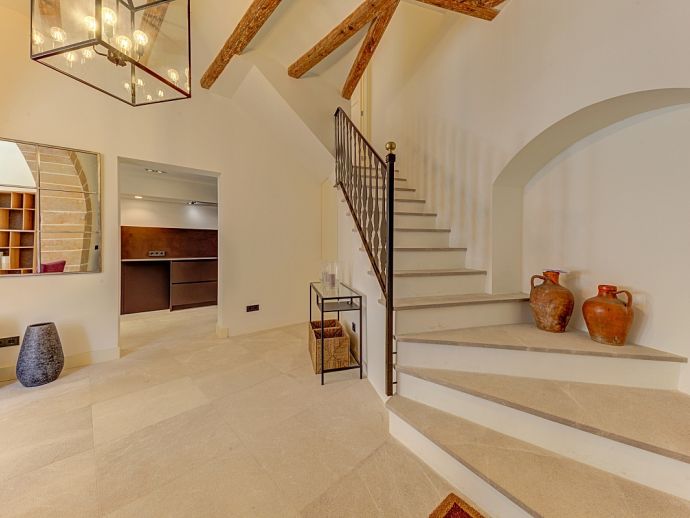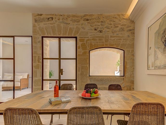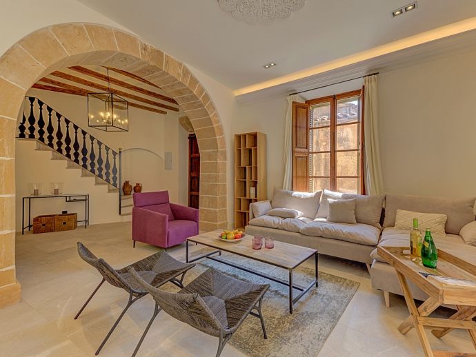 Villa Elisa with a private pool is ideally located in the heart of Pollensa old town just a few steps away from the many facilities, shops and restaurants that this ancient town has to offer. Completely rebuilt to the highest standard and furnished with taste and style this 4 bedroom townhouse can sleep up to 7 guests in sophisticated and charming interiors. During the renovation, high emphasis has been given to the arrangement of the internal space with typical features of exposed natural stone and archways mixed with modern, designer features and furnishings creating one of the finest examples of Mallorcan hospitality. The villa is set over 5 floors connected by an internal staircase, on the ground floor is an airy lounge (wi-fi internet, satellite TV, comfortable armchairs and sofas), a fully equipped kitchen (purposely built for the property), a WC and access to the outside sitting area with rattan sofas and a private plunge pool. The 4 air-conditioned bedrooms are located on the upper levels, a single with en-suite shower on the first floor, a double with a shower room on the second floor and another lovely double with an en-suite shower and access to a private terrace with sun loungers on the third floor. The master suite is housed on the fourth floor offering delightful views over the rooftops of Pollensa, it has a private shower room and a terrace furnished with a table and chairs. Outside, offers spacious terraces, sitting areas and even a private plunge pool equipped with an outdoor shower to cool down during the hottest hours, a true bonus for a centrally located townhouse. Villa Elisa's unique features and exclusive location provide a perfect holiday choice that is set to impress!