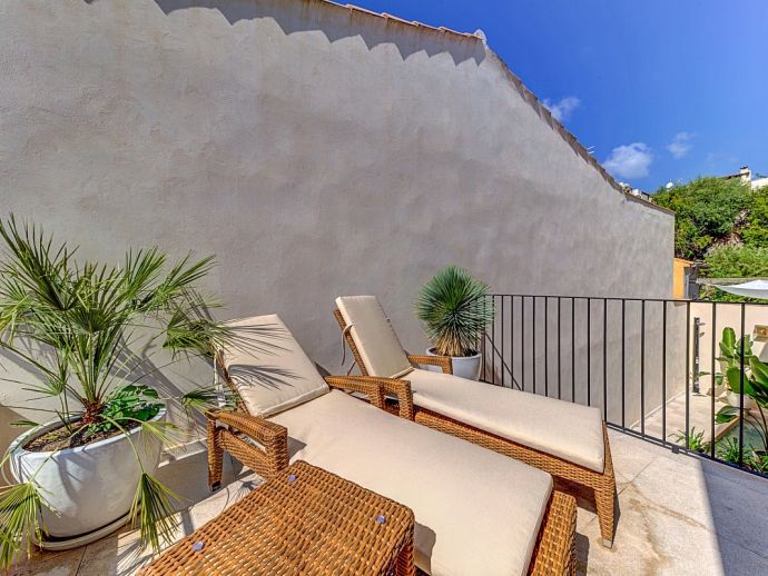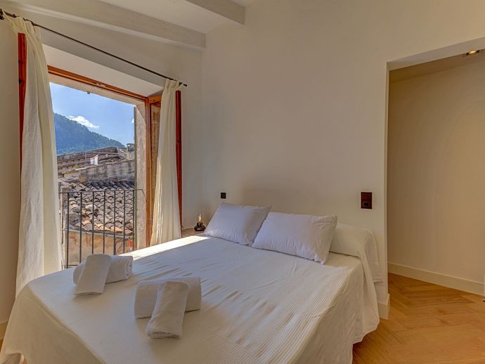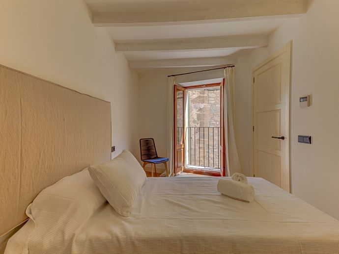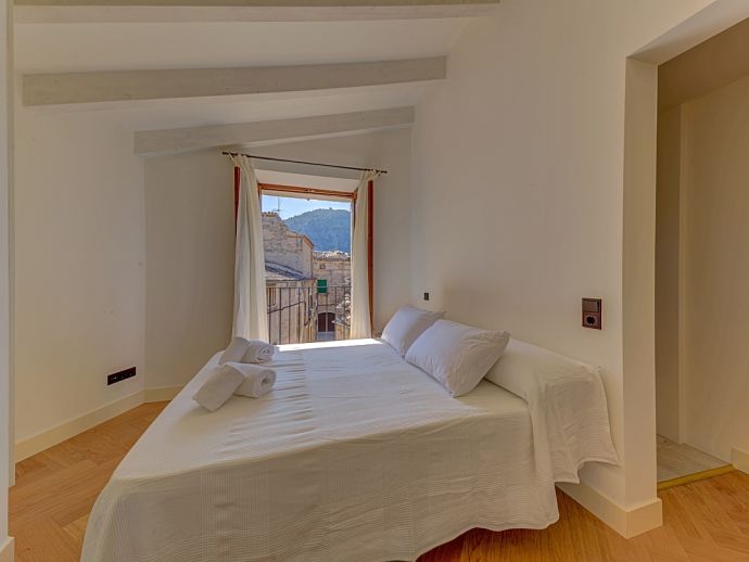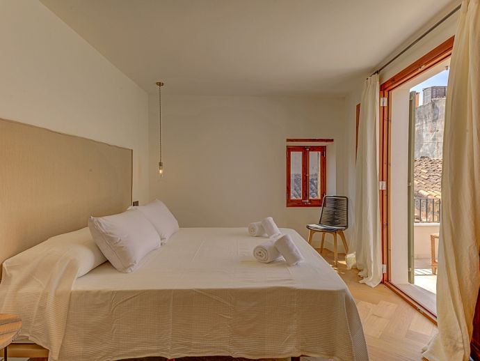 Fourth Floor - Master Bedroom: 1 x double bed, A/C, shower room, access to a private terrace with table/chairs and views across the roof-tops of Pollensa.