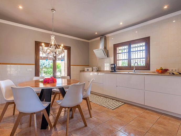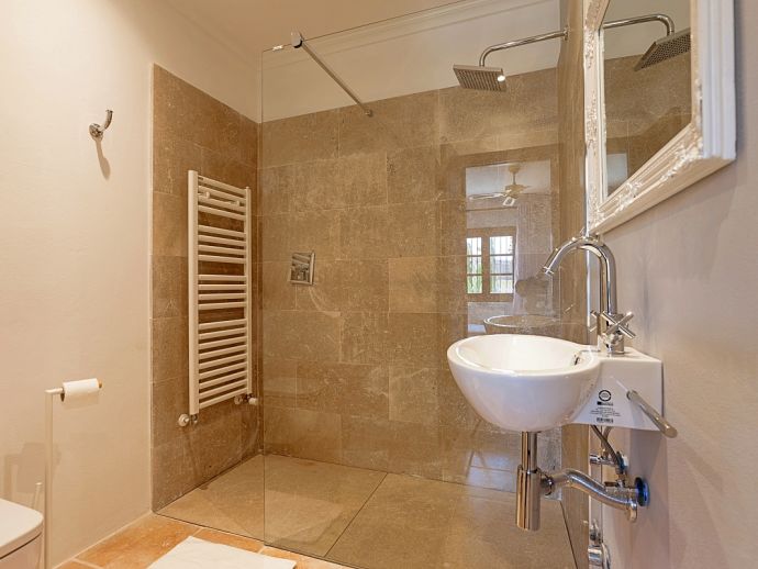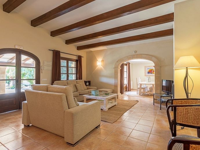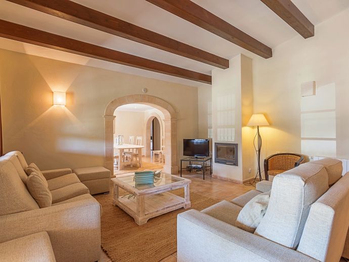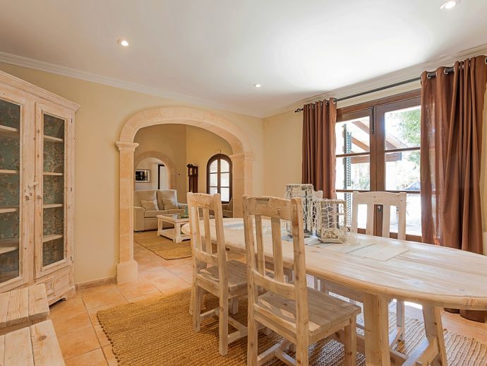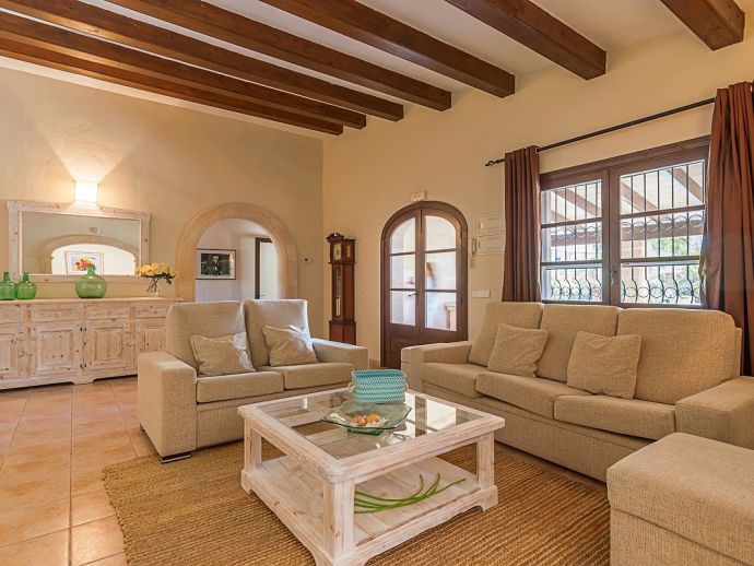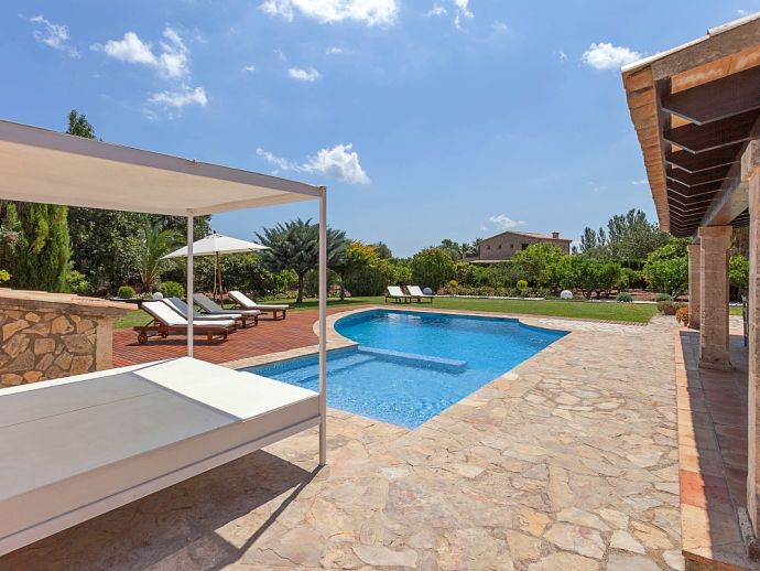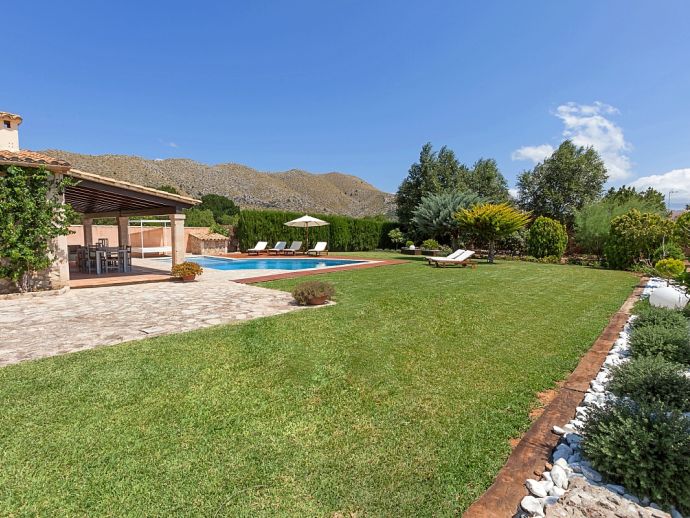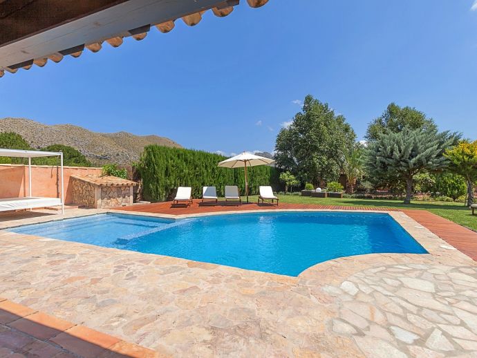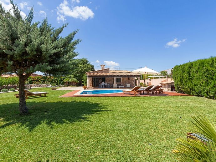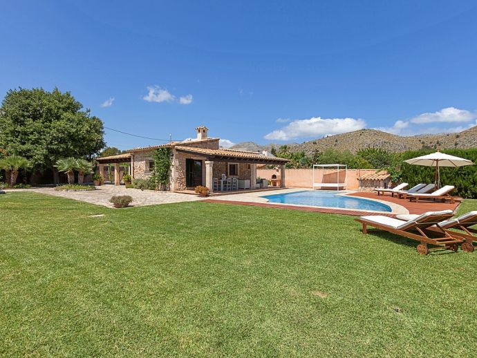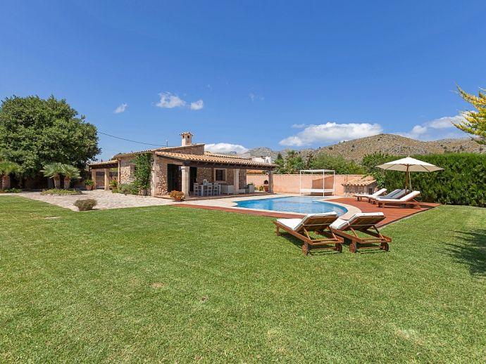 Finca Amparo is an attractive and welcoming holiday villa with extensive gardens and a private swimming pool, situated in a peaceful area yet ideally placed between the two resorts of Pollensa and Port de Pollensa. Constructed in local stone and finished to a high standard the villa accommodates 6 guests in stylish and tastefully furnished interiors that are set over one floor. The kitchen is modern and very well equipped, large patio doors lead out to the covered side terrace and front porch. The comfortable lounge and dining area are separated by a stone archway and both areas have doors to the garden. A hallway leads to the 3 air-conditioned bedrooms, a master double bedroom complete with a stylish wrought iron bed, en-suite shower room and direct access to the pool, a pretty twin bedroom with an en-suite shower room, a further twin bedroom and a separate family shower room. Outside, the private swimming pool is equipped with sun loungers/umbrellas and is well known for its unique shape and wide Roman steps allowing easy access (please note that there is a drop between the shallow and deep end of the pool). In addition to the beautifully planted enclosed gardens, there are open and covered terraces with a billiard table, table tennis, dining furniture and brick-built barbecue, perfect for alfresco dining and chilling out when the sun goes down. Finca Amparo is perfect for friends or families to enjoy outdoor living under the Mallorcan sun whilst providing good access to great beaches and ancient towns, a truly special property in a special location!