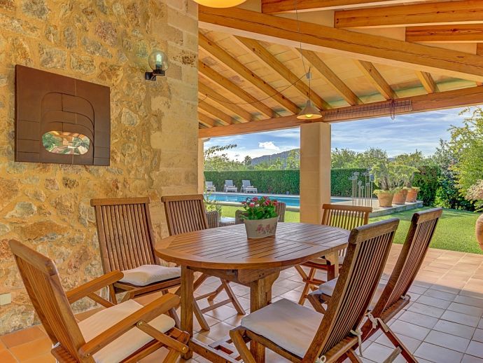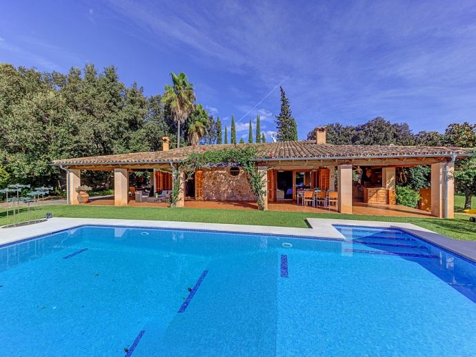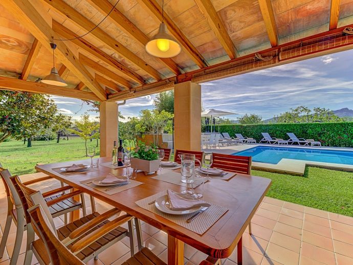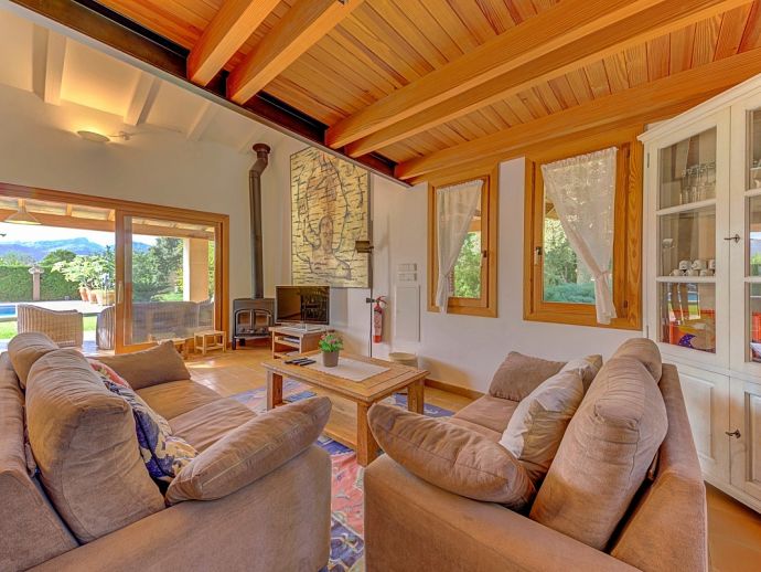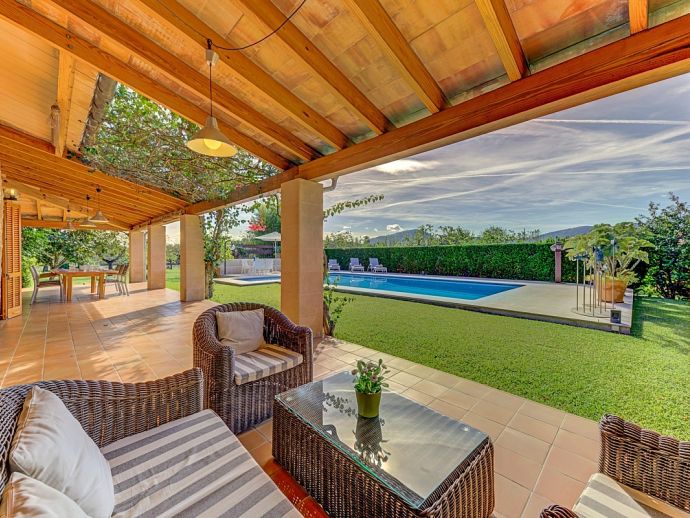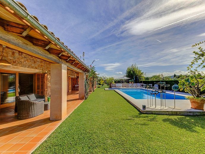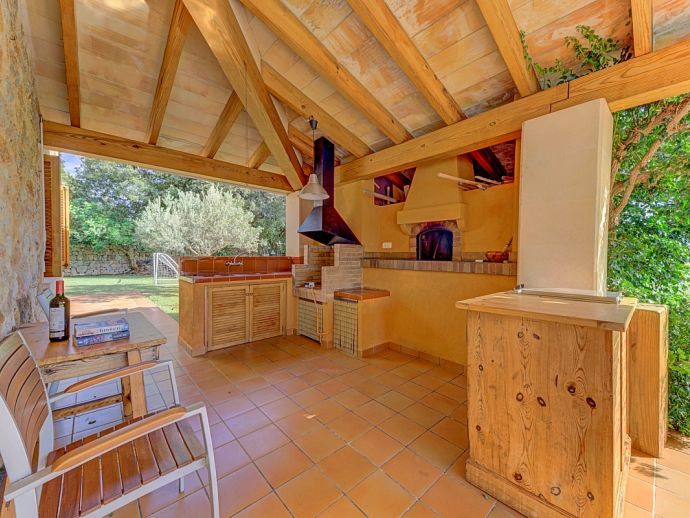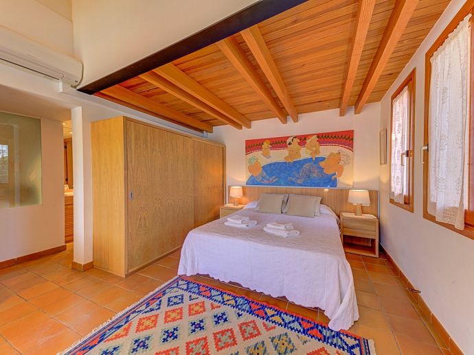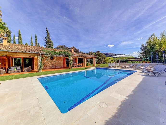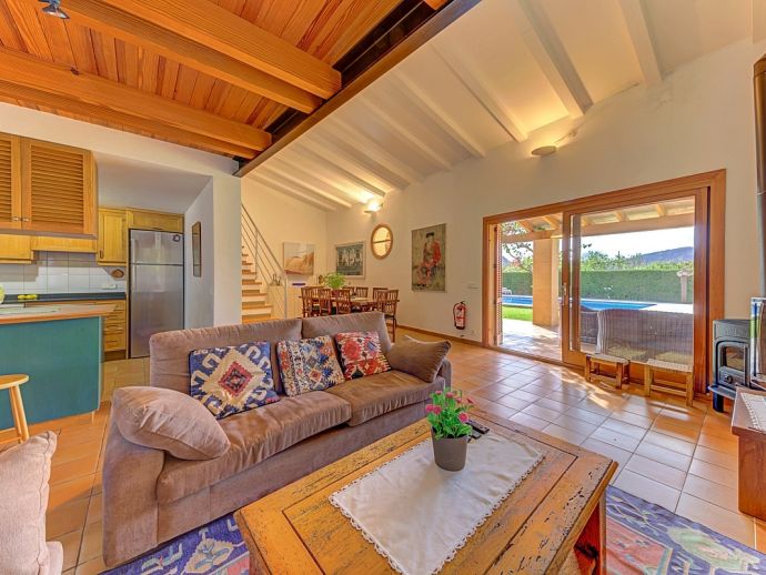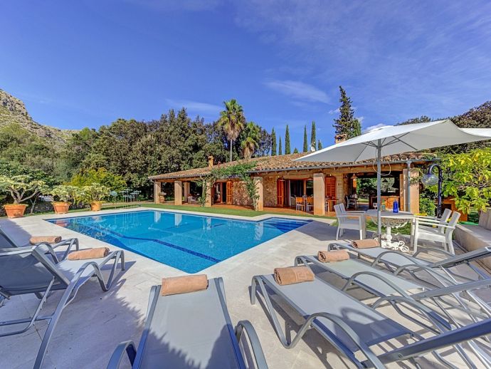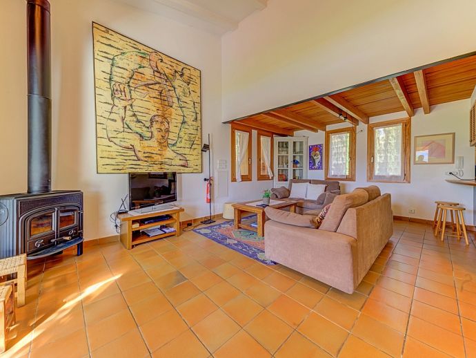 Villa Florencia is a stylish and uniquely located holiday villa with a private pool, situated at the end of a quiet cul-de-sac in the highly desirable and exclusive residential area of La Font, just a short drive from the ancient town of Pollenca and the sandy beach of Port de Pollenca. This stunning villa is surrounded by extensive gardens providing total privacy and seclusion for up to 7 guests in fully-airconditioned accommodation that is distributed over 2 floors. The owner (who runs a well-known art gallery) has furnished it with taste and style adding artworks from famous contemporary artists to the interiors and exteriors. On the ground floor is an open plan living room with an adjoining kitchen and dining area that has wide patio doors opening to the poolside terrace providing the whole area with an abundance of natural light. There are comfortable sofas, satellite TV (free channels), a contemporary wood burner, a dining table, and a kitchen that is fully equipped. A spacious master bedroom with a private bathroom is also on this floor with patio doors to the pool/garden. An internal staircase leads up to the first floor with 2 further bedrooms (1 double, 1 twin) and a family bathroom, a mezzanine level overlooking the lounge also features an extra single bed for a 7th guest (if required). Outside, this stone-built villa continues to impress with extensive manicured gardens scattered with artworks from local artists, and an inviting private pool equipped with comfortable sunbeds and parasols. A shaded furnished terrace runs all around the villa and includes a large outdoor kitchen with a built-in barbecue, this is an ideal spot for al-fresco dining and spending time relaxing whilst enjoying the true Mallorcan atmosphere and countryside. Villa Florencia is a true oasis of peace and tranquillity in a truly unique location!