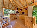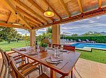 Shaded terraces run all around the villa and include lounge and dining furniture and an outdoor kitchen with a built-in barbecue.