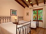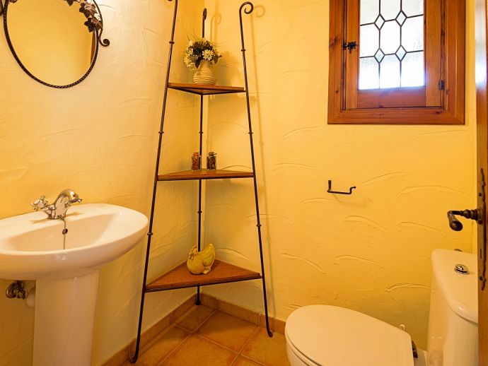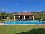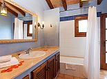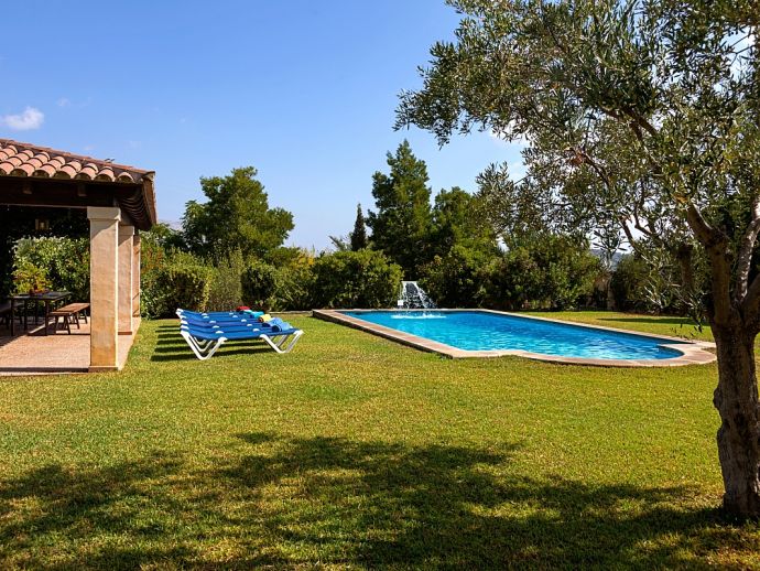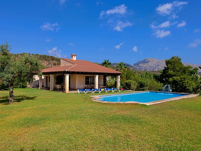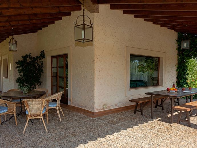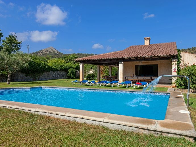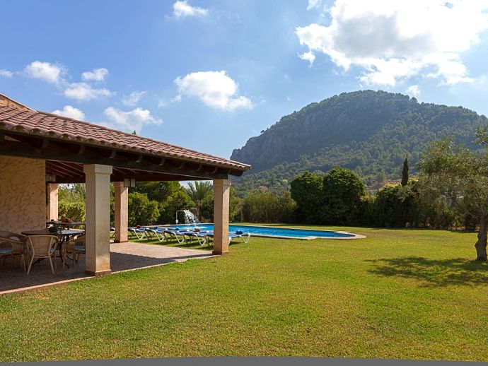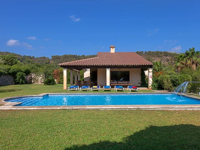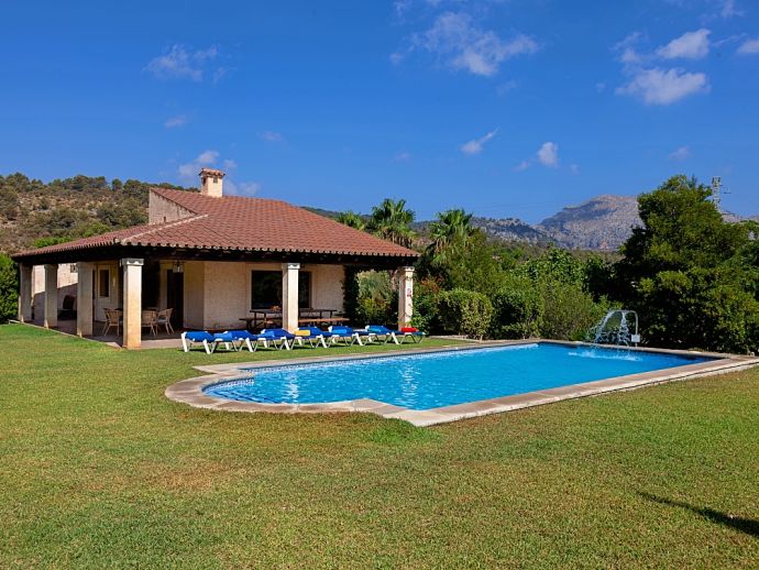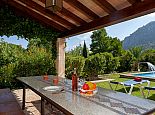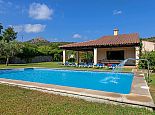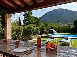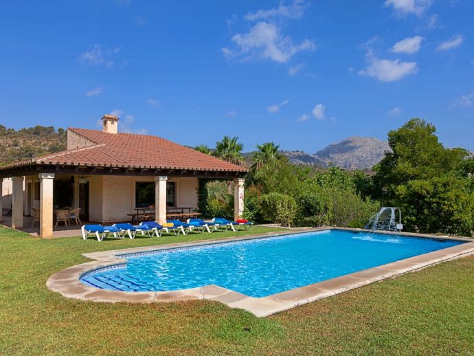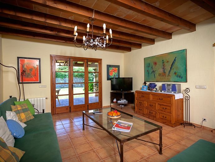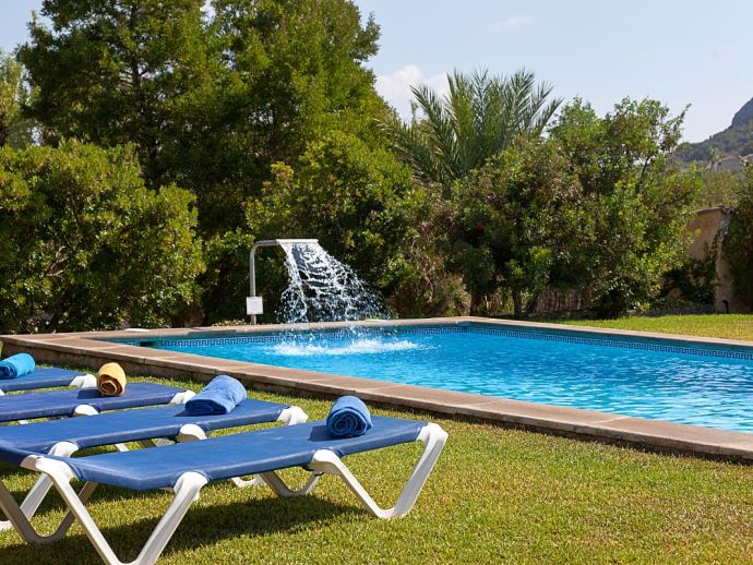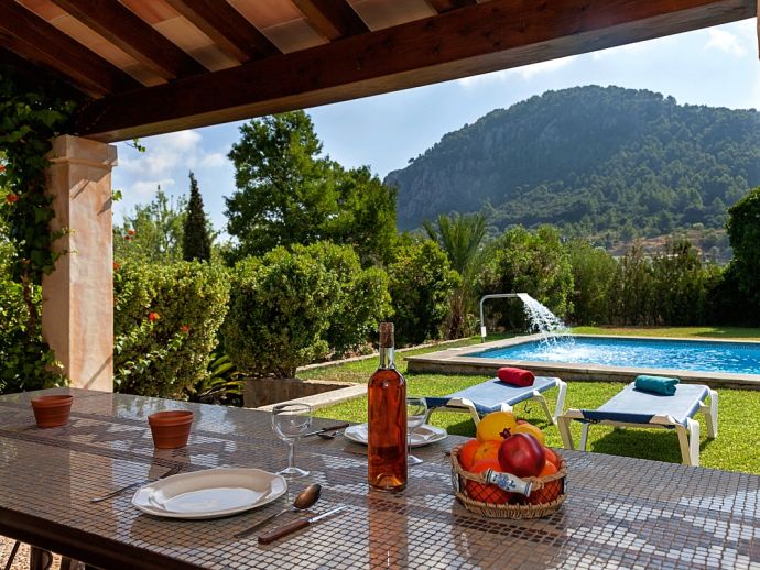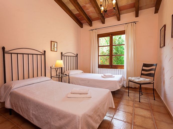 Can Bosc is a delightful stone-built villa with a private pool situated just outside the ancient town of Pollensa (800 m/15 minutes walk) that provides a quiet location with stunning views of the famous Puig de Maria. Set over one floor with 3 air-conditioned bedrooms the villa accommodates 6 guests. Inside there is a lovely mix of carefully selected rustic and contemporary furnishings, as well as many unique, handmade fixtures and fittings. The tastefully fitted kitchen is well equipped and benefits from exposed beamed ceilings, stone tiled floors and direct access out to the covered terrace, it also has a pretty wooden breakfast table and chairs. The dining room, again with beamed ceilings has a large wooden table and a typical Mallorcan chandelier, an archway with columns leads to the bright, sunny lounge featuring a huge picture window that beautifully frames the wonderful views. There is a double bedroom with traditional stone tiled floors with an en-suite bathroom and two further twin bedrooms that share a large family bathroom plus an additional guest toilet. Large glass doors lead out from the lounge to the fabulous, wrap-around covered terrace, furnished with a wicker table and chairs for relaxation, and a large table and chairs for outdoor dining. The private swimming pool is equipped with sun loungers and features a waterfall effect for further enjoyment. Can Bosc is perfect for families to enjoy outdoor living under the Mallorcan sun whilst also providing amazing views and easy access to the amenities and attractions of Old Town Pollensa!