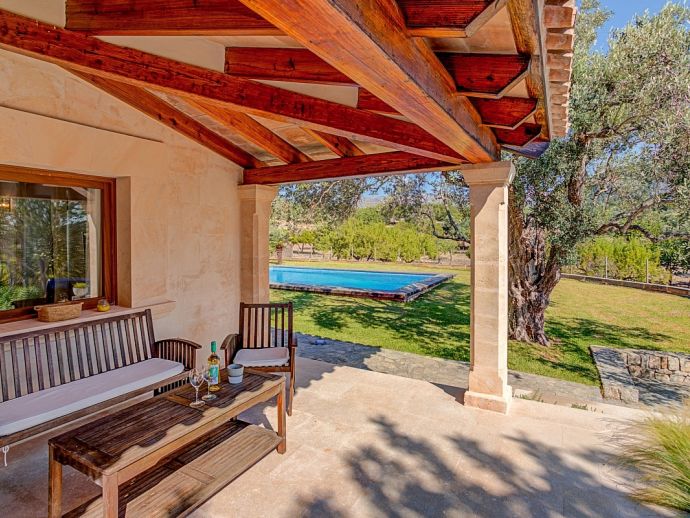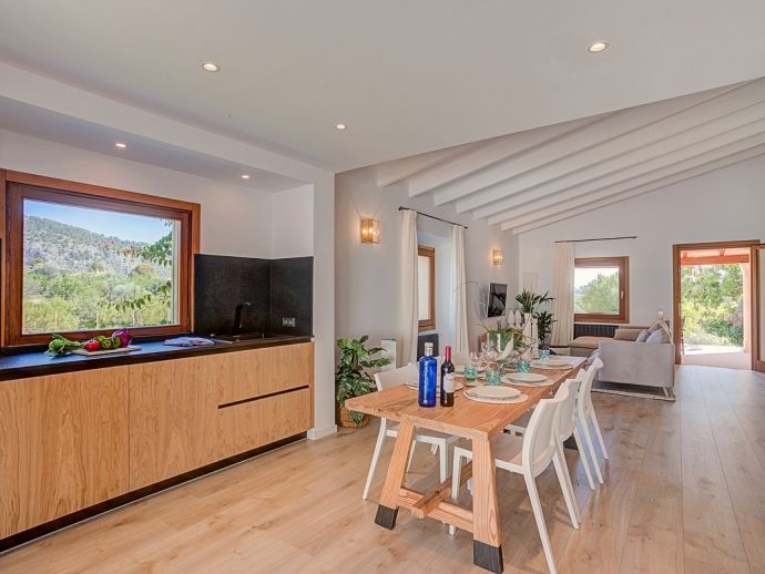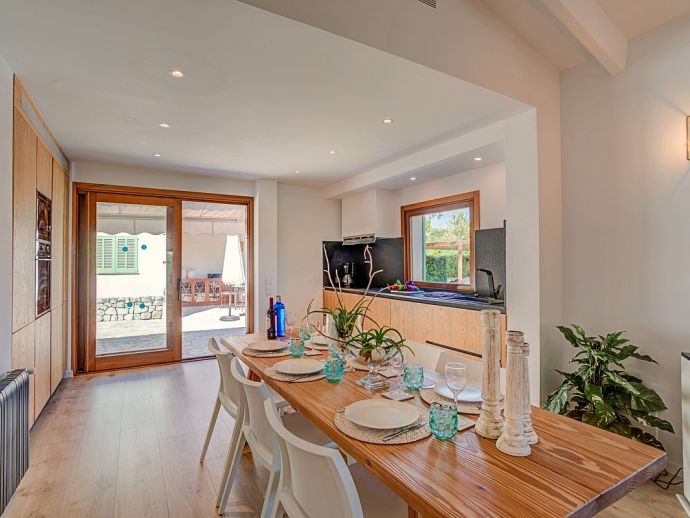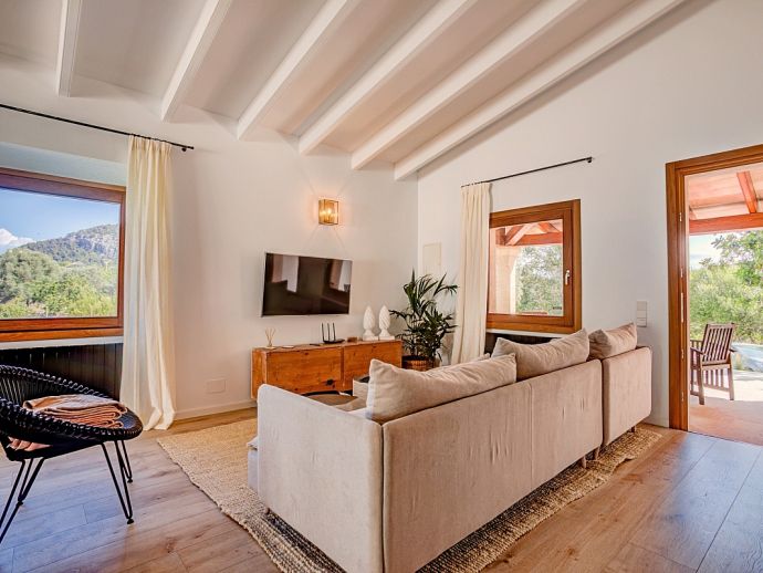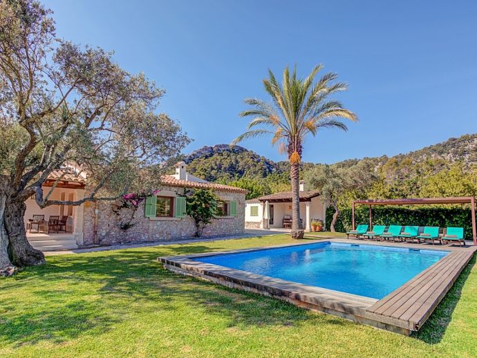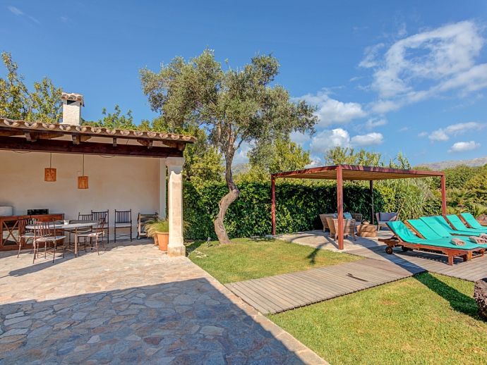 Finca Sofia is an attractive country house with extensive gardens and a large private swimming pool that comfortably accommodates 6 guests in spacious and welcoming interiors. The villa has superb views over the surrounding countryside and to the Tramuntana mountains and an excellent location 5 minutes from the Golf course and close to Pollensa old town, Alcudia and the beautiful sandy beaches of Port de Pollensa, Platja d'Alcudia and Platja de Muro which are just a short drive away (10/15 minutes). The accommodation is distributed over one floor and consists of a spacious lounge dining and kitchen, featuring attractive wooden beams, arched doorways and pretty picture windows. The lounge has been tastefully furnished and decorated using soft, neutral colours and the sofas are enriched with brightly coloured cushions. The kitchen is well equipped with a dining table/chairs and has doors leading out to a terrace with a barbecue perfect for outdoor dining. There are 3 air-conditioned and beautifully furnished bedrooms, one double with an en-suite shower room and 2 twins sharing a family shower room. Outside, the large swimming pool with wooden decking is surrounded by beautifully kept gardens, a true haven to relax to the sound of Mallorcan nature. The front covered terrace has been furnished with modern seating and dining facilities, a lovely contrast to the traditional exposed Mallorcan stone walls and for extra entertainment table tennis is provided. Finca Sofia is the perfect choice for families or friends that love outdoor living, together with the comfort of a truly special holiday home close to great beaches and ancient towns!