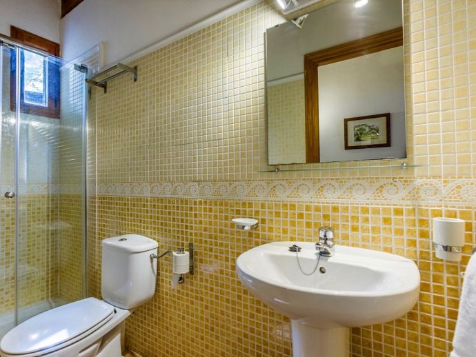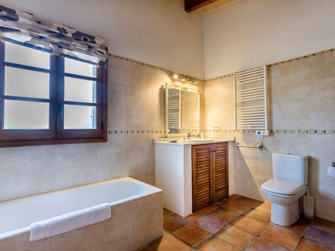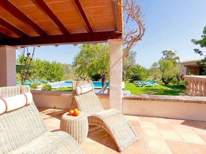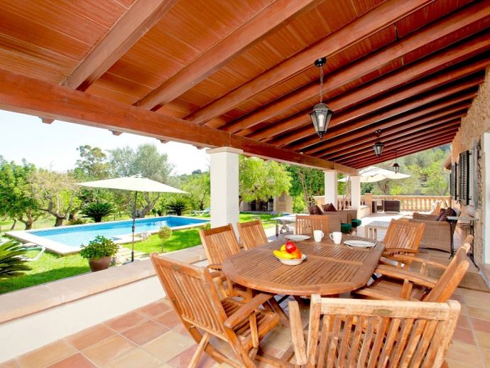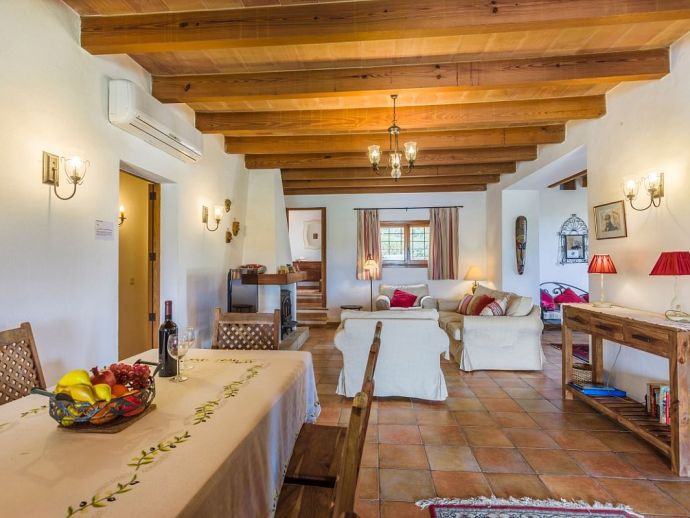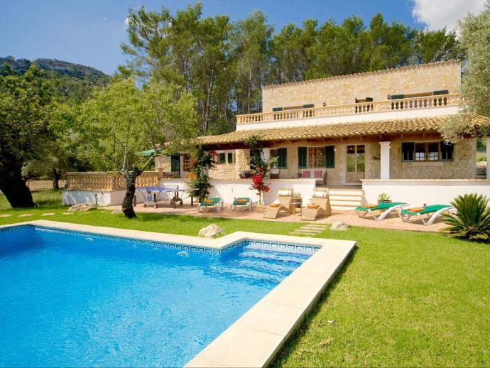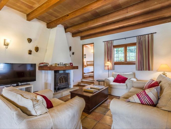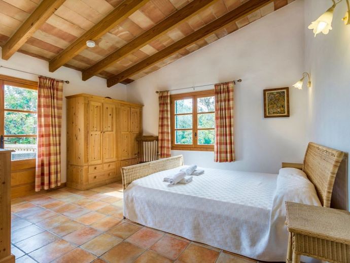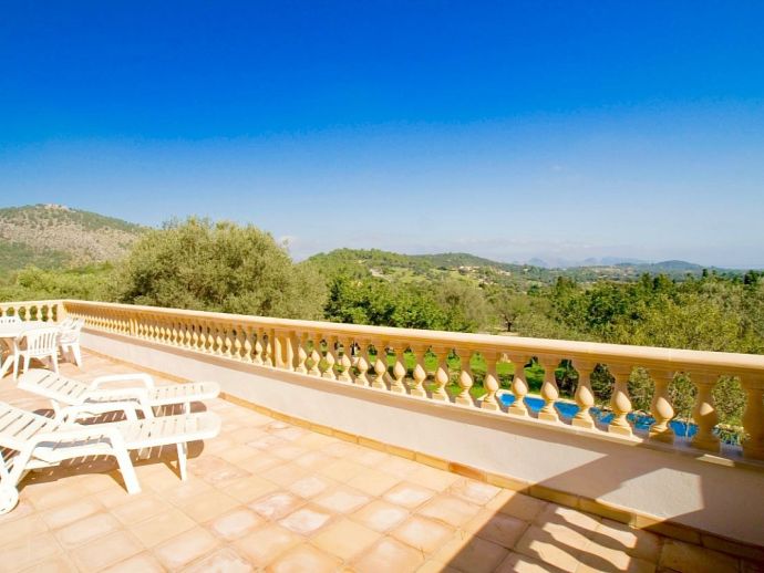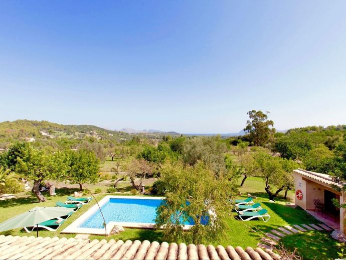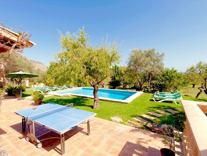 Villa Valeria is a spacious stone-built holiday home with a large garden and a private pool that comfortably accommodates 10 guests in fully air-conditioned and traditionally furnished welcoming interiors. The villa enjoys views over the surrounding countryside and has an excellent location 5 minutes from the Golf course and close to Pollensa old town, Alcudia and the beautiful sandy beaches of Port de Pollensa, Platja d'Alcudia and Platja de Muro which are just a short drive away (10/15 minutes). The accommodation is distributed over two floors and consists of an entrance hall that leads into a light and airy lounge/dining room with large sofas, fireplace, dining table/chairs and French doors that open out onto the covered terrace which overlooks the pool. There is a separate fully equipped kitchen and also 4 bedrooms on this level. A twin bedroom accessed via three steps up from the lounge and along a corridor is a further twin, a family shower room and two doubles with en-suite bathrooms (one has direct access out to the terrace). The upper floor has a fourth bathroom and a large uncovered terrace with views to the countryside which can be directly accessed from the fifth bedroom (twin beds) or the games room with a billiard table. For extra entertainment, there is table tennis in the garden, an inviting pool equipped with sun loungers and a covered barbecue terrace, perfect for alfresco entertaining. At Villa Valeria guests will be able to enjoy relaxing hours on the terraces, sunbathing and swimming surrounded by beautiful Mallorcan nature and is the perfect choice for families or friends that love outdoor living whilst being close to great beaches and ancient towns!