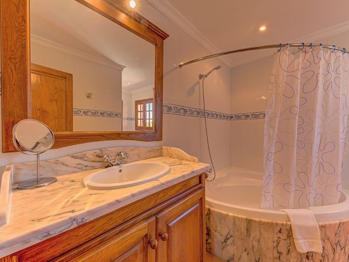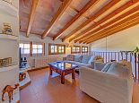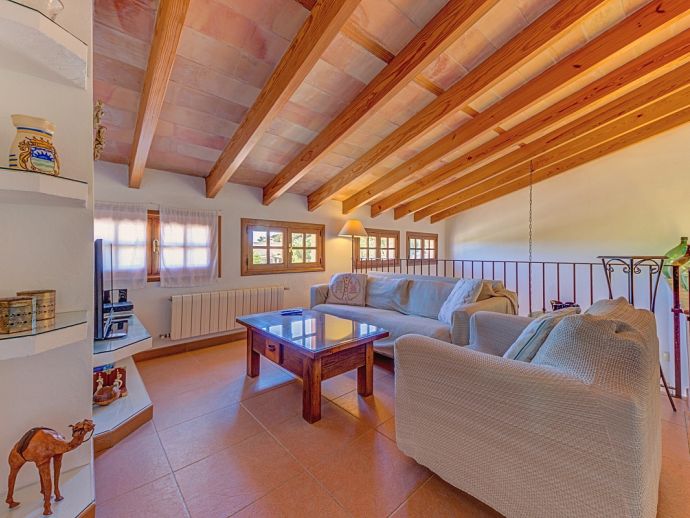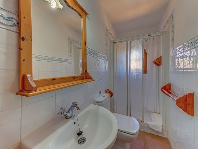 Casa Julia is a fantastic villa with a private pool, extensive gardens, panoramic mountain views in a privileged location within walking distance to Pollensa old town. The villa sleeps 6 guests in 3 air-conditioned bedrooms and has been carefully renovated retaining many of its original features to create a traditional yet sophisticated atmosphere for an unforgettable holiday. Set over 2 floors the interiors are spacious, bright and very welcoming. On the ground floor, the living and dining room has a fireplace and doors that open straight out to the covered front terrace. A separate fully equipped kitchen with an adjoining dining area also has doors to the terrace. There are two bedrooms, one master double and one twin, the master has direct access to a full bathroom with "Jack & Jill" doors to the hallway. Upstairs is a further twin bedroom that enjoys a private terrace with views to the pool and mountains, a shower room and a second comfortable lounge. Outside, the spacious gardens offer a playground for children as well as lots of well-kept lawns. Shrubs surround the magnificent private pool area with a sun terrace, loungers, table tennis, shower and a generously sized L-shape pool with Roman steps. For those who enjoy al-fresco dining, there is a purpose-built barbecue area with an outdoor kitchen and terraces that