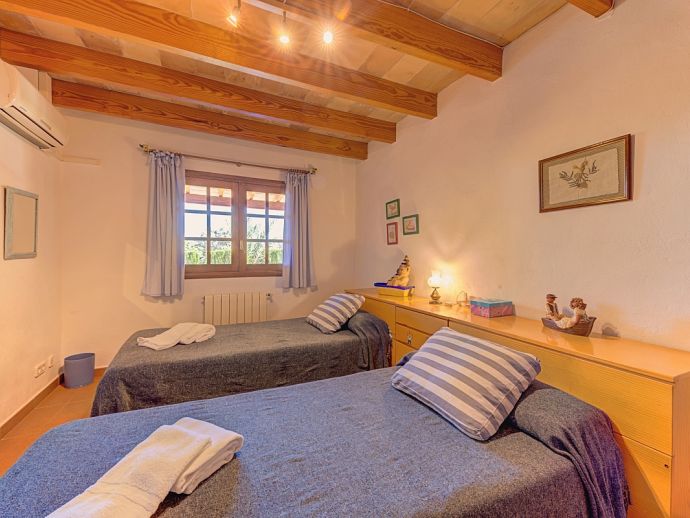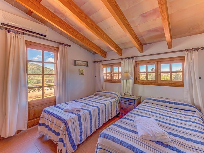 Bedroom: 2 x single beds, A/C, fitted wardrobes, direct access to a private sun terrace with views to the pool and mountains.