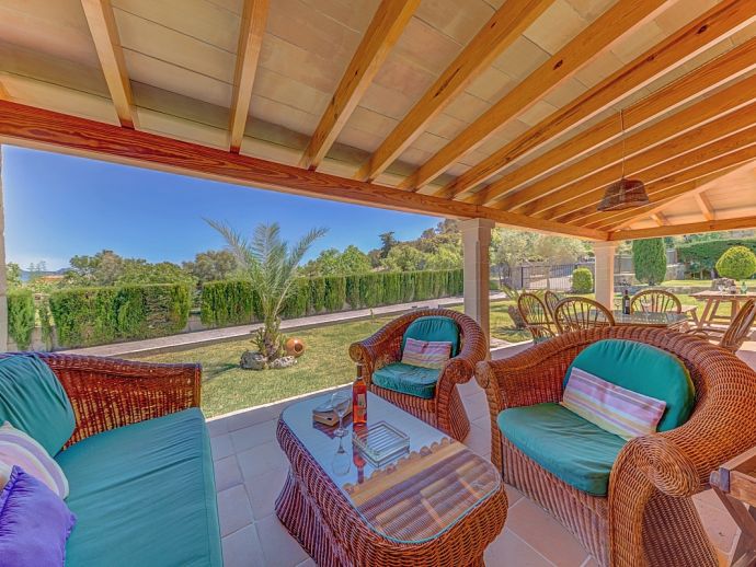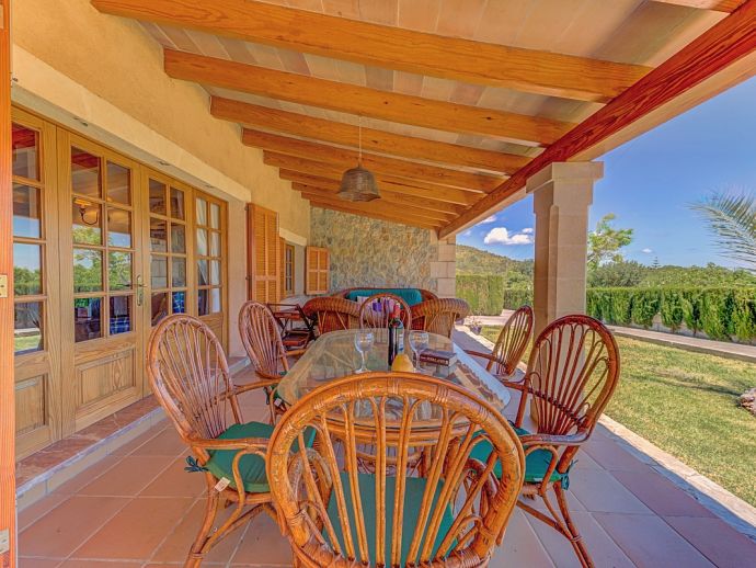Covered terrace with garden lounge furniture and dining table and chairs.