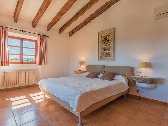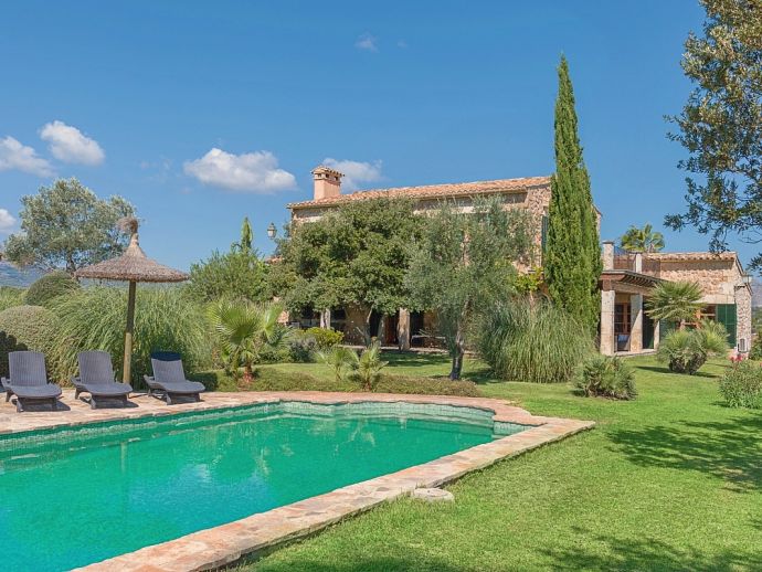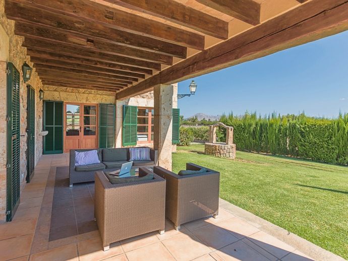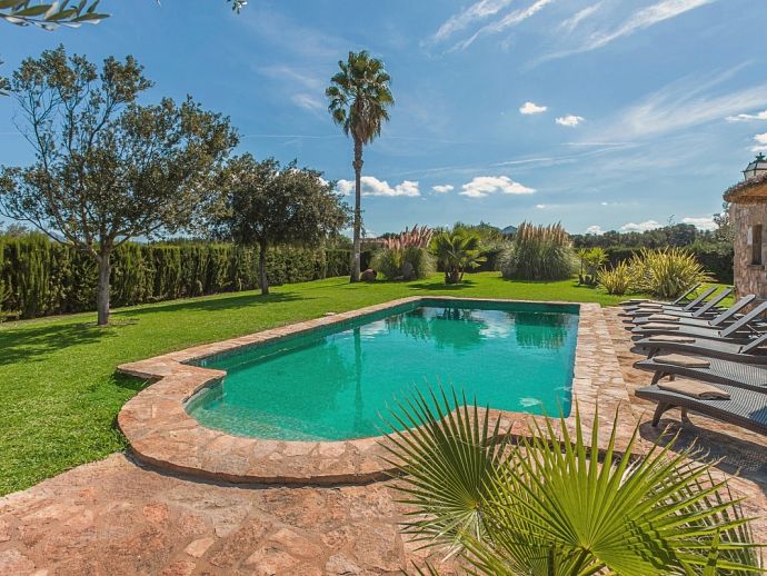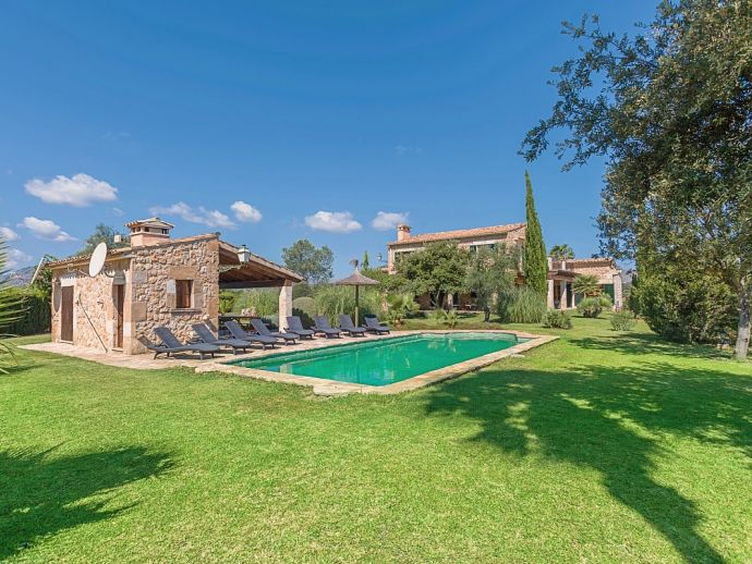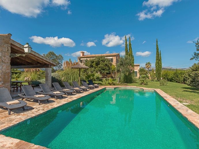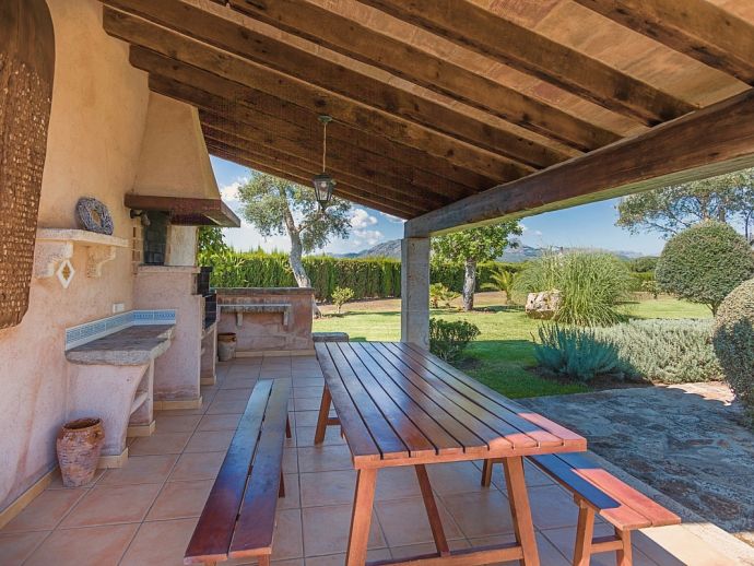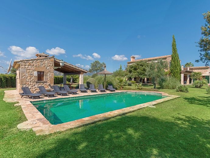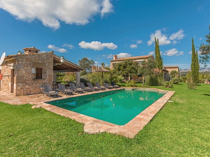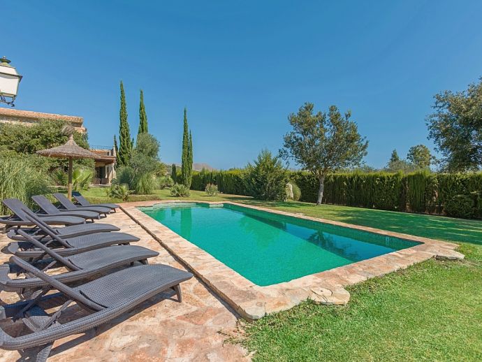 Finca Pilar is a large Mallorcan villa, full of traditional character and surrounded by stunning gardens with a private swimming pool. Perfect for outdoor living and al-fresco dining, this property also offers beautiful views over the surrounding countryside and an excellent location, 10 minutes from the Golf course, close to Pollensa old town, Alcudia and the beautiful sandy beaches of Port de Pollensa, Platja d'Alcudia and Platja de Muro which are just a short drive away (10/15 minutes). This stone-built villa sleeps 8 guests in 4 air-conditioned bedrooms and is furnished with taste and style making wide use of traditional elements and modern comforts. When entering the villa you are greeted by an impressive double-height entrance hall and staircase. Directly opposite is a large living space, a lounge, a dining area and a kitchen with beamed ceilings, whitewashed walls and archways that define the different areas. The lounge has a feature fireplace, satellite TV, comfortable sofas and a dining table/chairs. The fully equipped kitchen has retained a rustic charm whilst integrating all modern conveniences and appliances. Doors lead out to a covered terrace that wraps around the villa. Also on this floor is a guest toilet, utility room and double bedroom with access to the garden/terrace and an en-suite bathroom. On the first floor are 3 further bedrooms, two twin bedrooms which share a family shower room and a master double bedroom with en-suite bathroom and access to a large roof terrace with fantastic views. Outside, the charming Mallorcan stone exterior of Finca Pilar is paired with Cypress trees and Mediterranean shrubs across wide green gardens with a dazzling landscape as a backdrop, the beauty should be experienced. There is a mix of open and covered terraces with seating areas, together with an amazing covered barbecue area by the poolside - an excellent spot for dining al-fresco and the gorgeous private pool is ideal to cool down or just relax poolside on one of the comfortable sunbeds. This truly stunning villa provides an oasis of peace and tranquillity for families or friends with an added bonus of being close to amenities, stunning beaches, traditional villages and ancient towns!