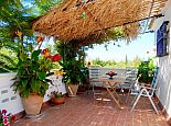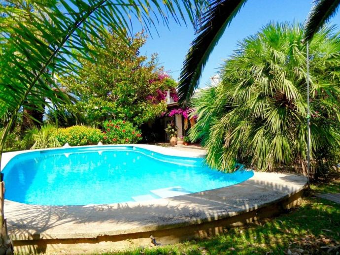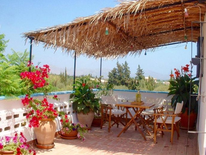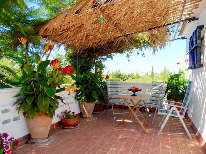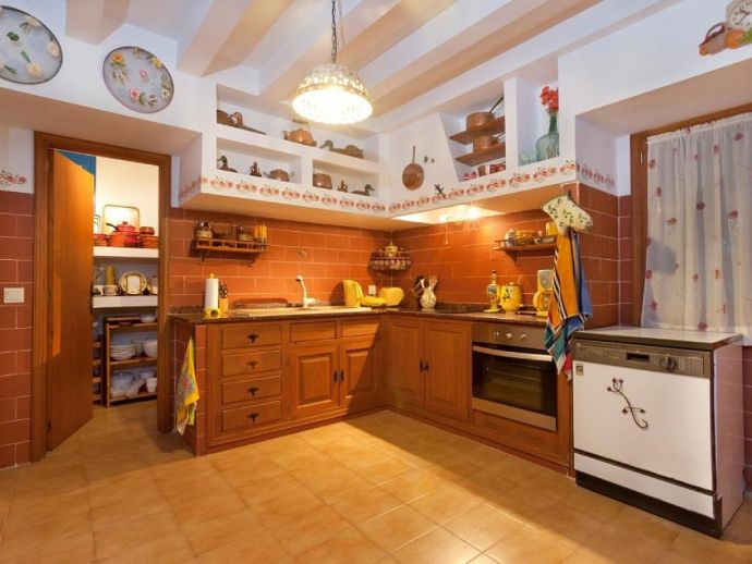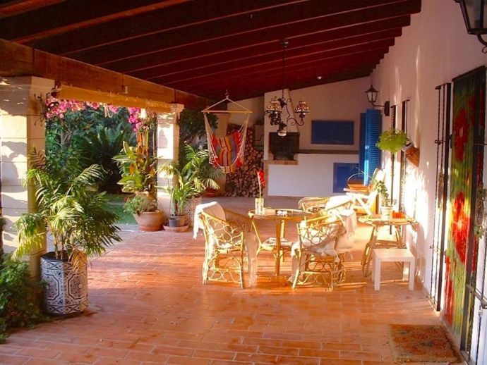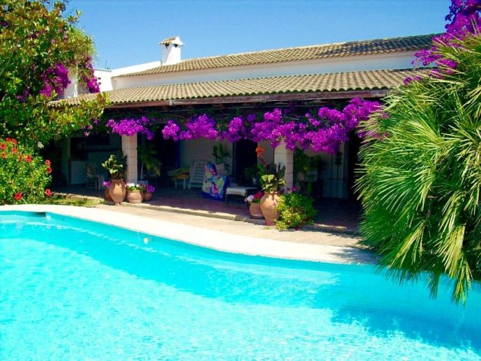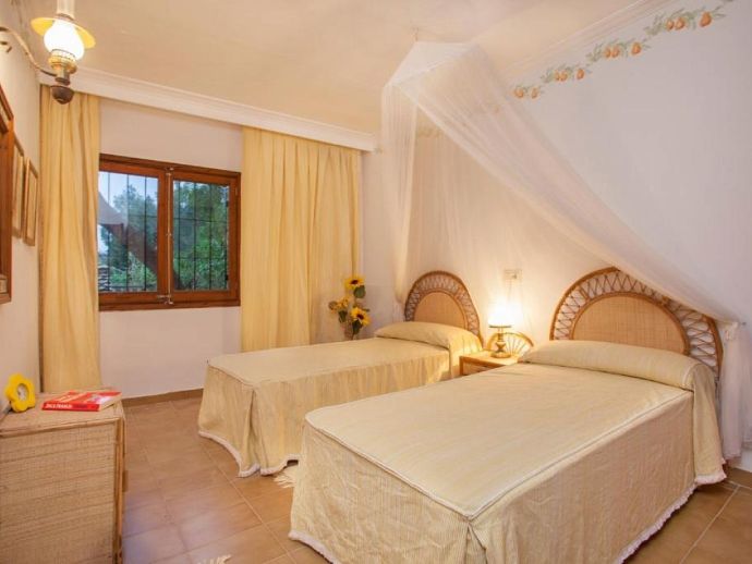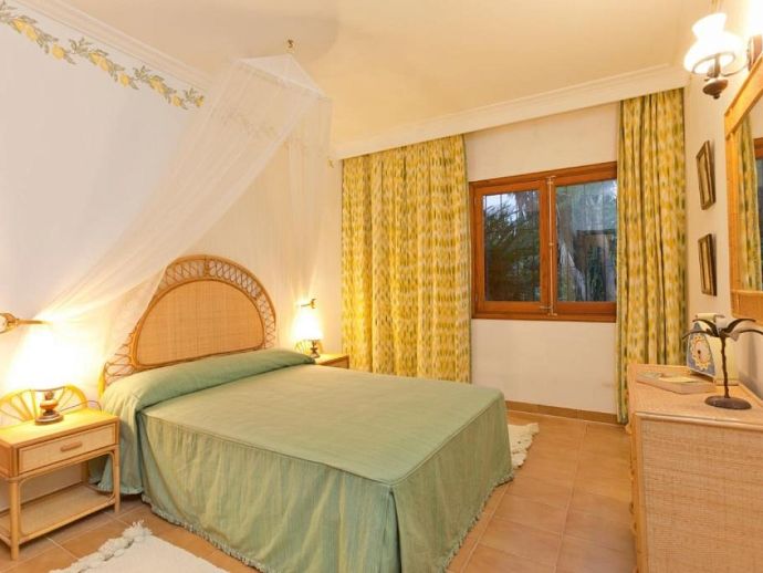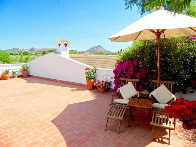 Casa Emily is an attractive, 2-bedroom country villa with a private pool and a roof/sun terrace providing 360-degree views of the mountains, countryside and bay. The villa has a great location in a peaceful area yet within easy reach of old town Pollensa, Pollensa golf course, Alcudia (10 mins) and a great choice of beautiful sandy beaches (15/20 mins). A gated driveway leads to a long covered terrace with comfy seating areas and tables plus a built-in barbecue, perfect for dining al fresco or simply relaxing. The large kidney-shaped pool is well situated next to a shower room and surrounded by a pretty garden full of mature trees, flowers, shrubs and many palm trees. A gate leads to the lovely vegetable patch, an orchard and a wild area – a perfect place for a picnic and guests are invited to help themselves to pick up any fruit along the way. Inside, there is a spacious, traditional kitchen fitted with fully modern appliances and marble worktops, a walk-in pantry and a separate utility room with a washing machine and additional fridge. A charming Mallorcan style lounge/dining room and a hallway leading to a double bedroom with en-suite shower, a twin room and a family bathroom. Both bedrooms have delightful views over the garden. A flight of stairs leads up to an enormous sun terrace with panoramic views, it's a magical place to watch the sunrise over the bay, tan in the sunshine during the day, then watch the sun go down over the mountains – all in complete privacy. Casa Emily is perfect for a small family or couples who enjoy outdoor living and relaxing in a peaceful setting whilst still being close to fantastic restaurants, stunning beaches and ancient towns!