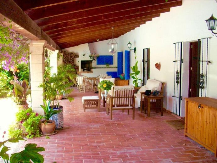 Long covered terrace with comfy seating areas, tables and a built-in barbecue.