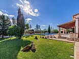 Gate entry and driveway leading to extensive gardens, laid to lawn and planted with Mediterranean trees, olive trees, palm trees, flowers and shrubs with countryside views.