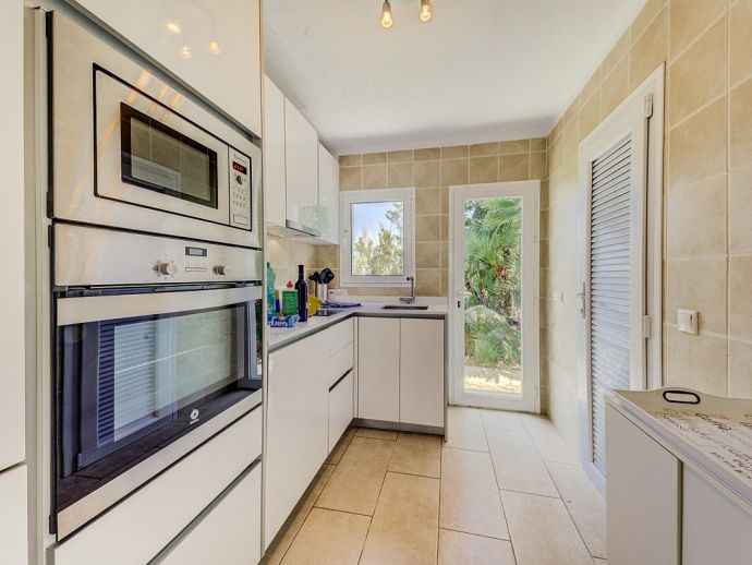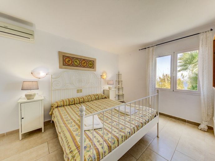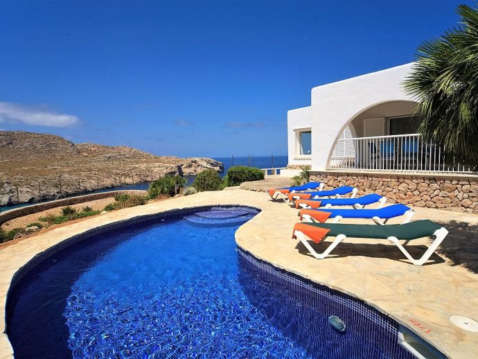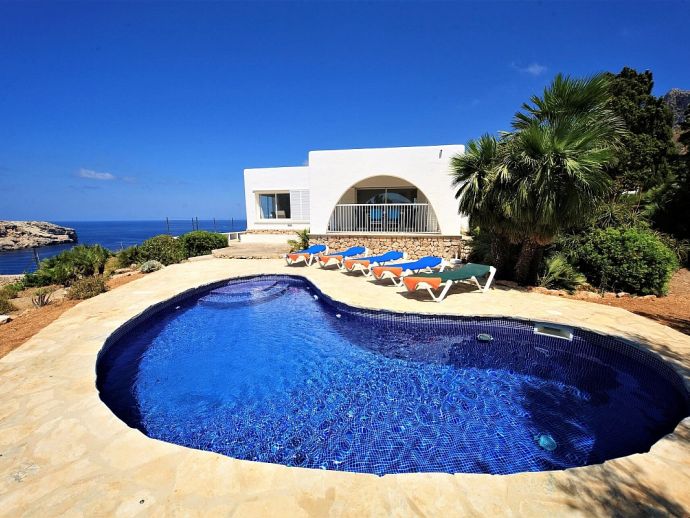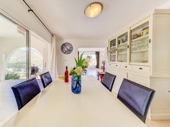 Villa Vista with a private pool has an excellent location just above the unspoiled Cala San Vicente offering panoramic views across the bays, to the sea and mountains. This white-washed villa is set across one floor and sleeps 6 guests in 3 air-conditioned bedrooms. There is a double, a twin, a single room with bunks-beds and 2 shared bathrooms. The kitchen is well equipped and has a walk-in pantry and the L-shaped lounge/dining room is tastefully furnished in neutral shades of cream and browns and has a feature wood-burner fireplace and large picture windows, perfectly framing the views. From the dining area, glass doors open out to a covered terrace with a glass table and chairs for outside dining. A few steps down lead to an inviting kidney-shaped swimming pool with loungers, an idyllic spot for relaxing in the sun. A little further round from here is the first terrace look-out point where you can enjoy uninterrupted, full 180º views of the mountains as they end and the sea begins. To the other side of the property is another look-out terrace this time with bench seating and views out to sea, a place to daydream as you watch the small sailing boats pass by. Villa Vista is an ideal haven for families/friends who are seeking a relaxing atmosphere and beautiful unspoiled scenery which can be enjoyed both day and night!