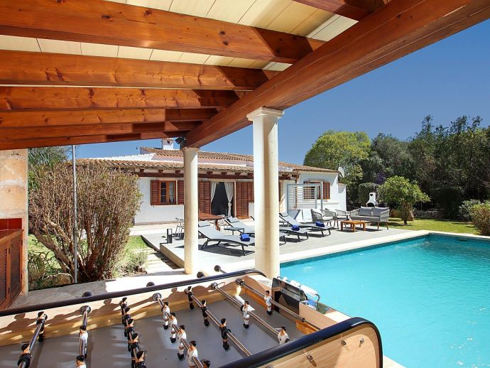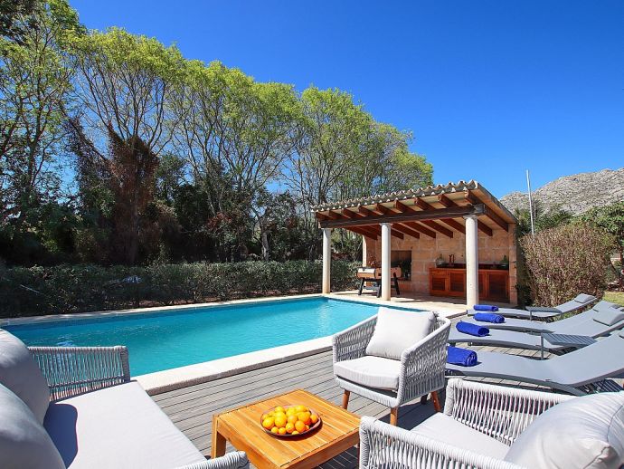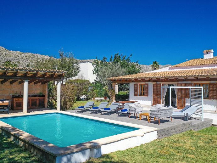 Casa Alvaro is a recently renovated two-bedroom villa with a private pool that offers a very convenient location just 25 minutes walk to the old town of Pollenca and less than 10 minutes drive to the beach resort of Port de Pollenca. Set over one floor, the property has been extensively restored in 2024 with brand-new shower rooms, a modern kitchen, plush furnishings and new flooring throughout. Upon arrival, you'll be greeted by a private driveway leading to ample parking for two cars. Step into a haven of relaxation, where multiple outdoor areas await your leisure. Engage in lively games of table tennis, savour al fresco dining under the covered patio, or soak up the Mediterranean sun on the new decked area with with modern sunbeds and lounge furniture that surrounds the sparkling pool. A barbecue and a handy exterior bathroom further enhance your outdoor experience. Step inside to a spacious open-plan living and dining area, where contemporary furnishings set the stage for unforgettable gatherings. Sink into plush seating in the main sitting area. A separate sofa and large flatscreen Smart TV area provide a cosy retreat for movie nights and quiet moments and a fully equipped kitchen, complete with a breakfast table and chairs, ensures effortless meal preparation. Two bedrooms offer ample space for relaxation and rejuvenation. The twin bedroom, accessible from the main sitting room, with direct views of the pool. The master bedroom, located at the rear of the house, has a double bed, a sofa bed (suitable for a child) and en-suite bathroom. Air-conditioning is now provided in both bedrooms, the lounge and the kitchen. Casa Alvaro is situated in a pretty countryside setting offering a peaceful oasis that is close to the town of Pollenca with charming boutiques, an array of tapas bars, restaurants and a vibrant weekly market.