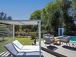 New decking area (added for 2025) equipped with modern sun loungers, outdoor dining and lounge furniture.