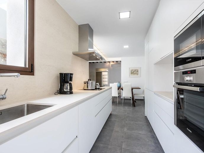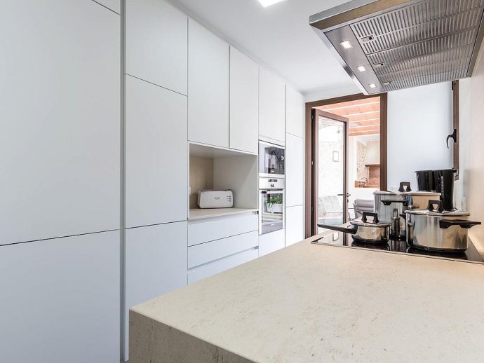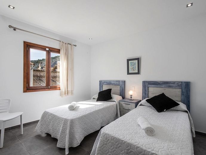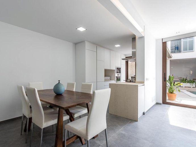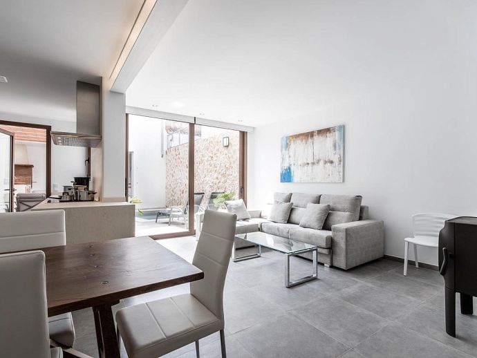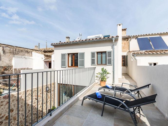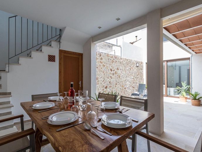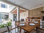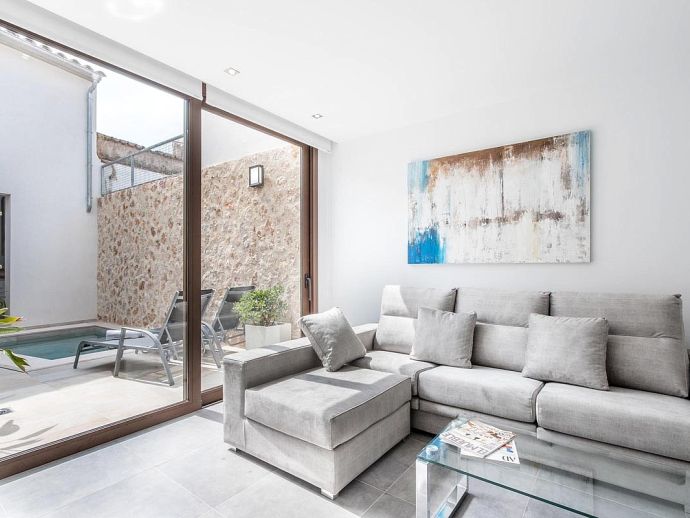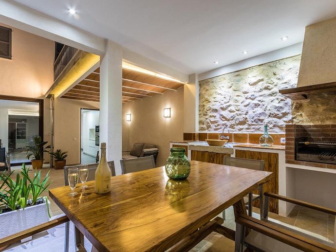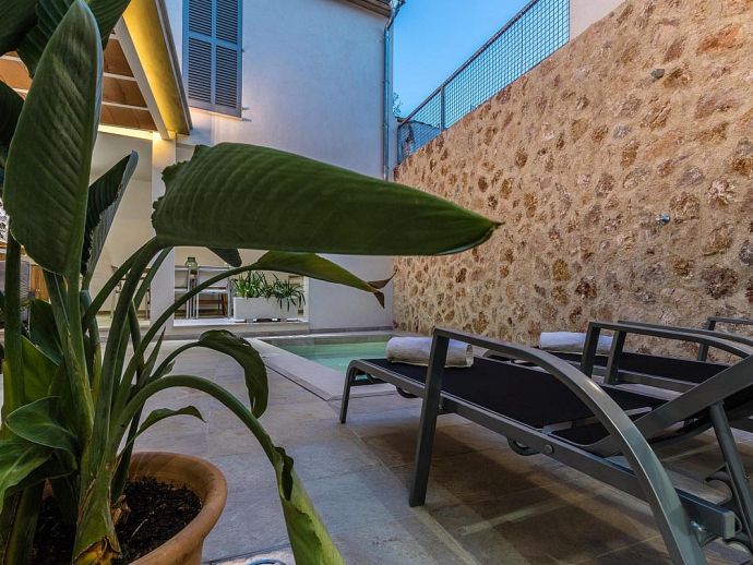 Casa Arnau is a stylish townhouse with an enclosed courtyard, a small private pool and an alfresco dining area situated in the heart of old town Pollensa’s historic quarter and just a 5 minutes walk from the fantastic main square lined with pavement cafe bars, restaurants and shops. The house sleeps 6 guests and has been lovingly refurbished using only the best quality materials, fixtures and fittings. The interiors are fully air-conditioned and a delightful mix of the old character features beautifully blended with modern facilities and appliances. On entering the property, there is a spacious beamed hallway with a marble staircase to the 3 bedrooms on the upper floor, one double with an en-suite shower room and two twins that share a separate shower room. There is a further shower room on the ground floor along with a light and airy open-plan living space incorporating a fully equipped modern kitchen (ceramic hob, electric oven, integrated microwave, dishwasher, large fridge/freezer, etc) a lovely dining table for 6 and a comfortable corner seating area. From here, glass sliding doors open out to a private internal courtyard terrace, where you'll find sun loungers and a small plunge pool, perfect for cooling off after a day in the sun. The owners' attention to detail and dedication to the guest experience continues with a superb covered alfresco dining area, a brick-built barbecue, lounge seating by the pool and steps to a first-floor terrace with space for two loungers to take in the sunshine, overlooking the pool below and the rooftops of Pollensa beyond. Casa Arnau's unique features and exclusive location make it a holiday home that is set to impress!