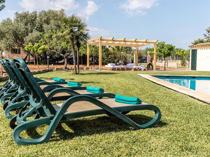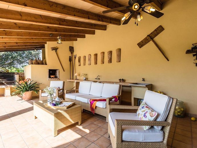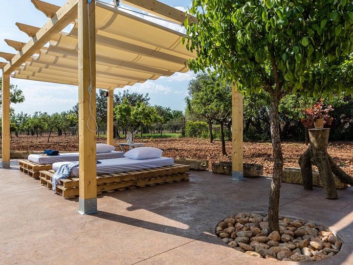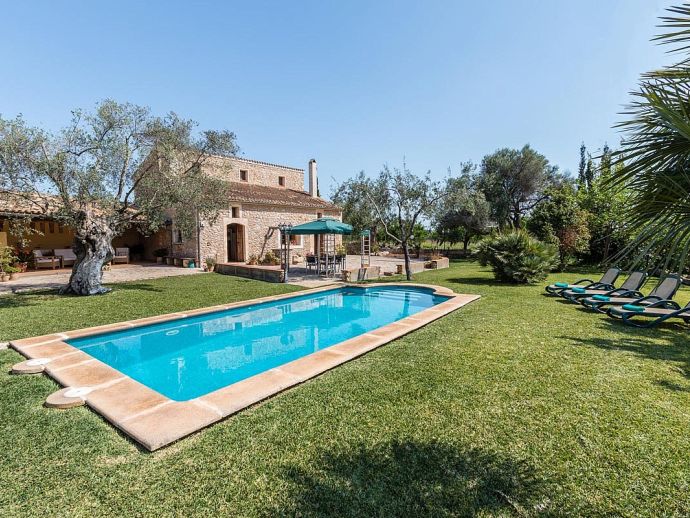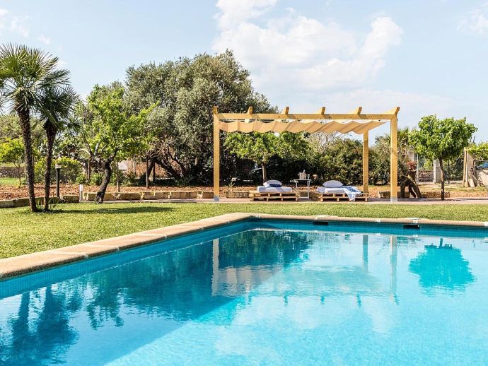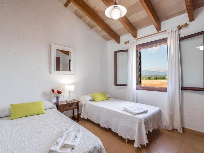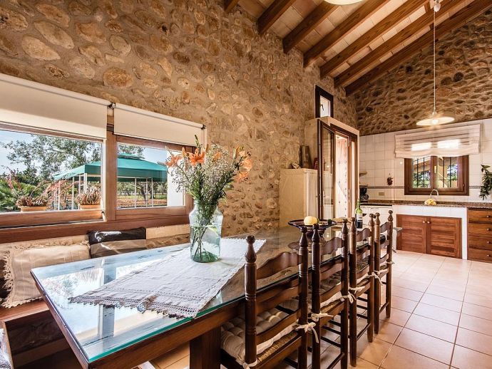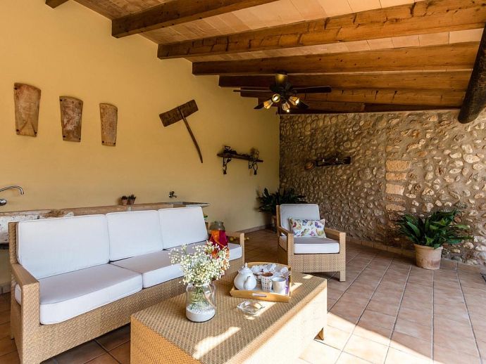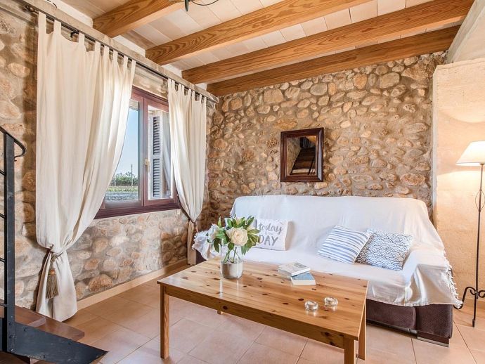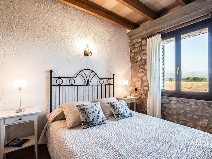 Can Aroa with a private pool is a charming stone-built house located in the peaceful, rural area of Búger, halfway between the villages of Búger and Sa Pobla. This two-storey property has been lovingly restored with great style whilst maintaining the old and rural character, wooden beam ceilings, tiled floors and beautiful exposed stone walls. The ground floor consists of a cosy lounge with satellite TV, DVD player, a wood-burner and comfortable sofas. A spacious fully equipped kitchen with a dining table/chairs and fitted with modern appliances. A double bedroom and a bathroom. There are 2 further bedrooms upstairs, a double and a twin, both have lovely views towards the village of Búger and share a family bathroom. The house is set in mature gardens with an inviting private pool with Roman steps which is surrounded by plenty of lawn areas, so great for families with children. There are sun loungers and chill-out areas as well as a fabulous covered terrace with a built-in barbecue, large wooden table and benches, perfect for grilled meals al fresco. Can Arora offers a peaceful retreat for a relaxing holiday and is ideal for those who want to escape the main tourist areas and discover authentic rural Mallorca!