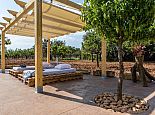 Sun loungers, Bali beds, Covered patio area with dining furniture.