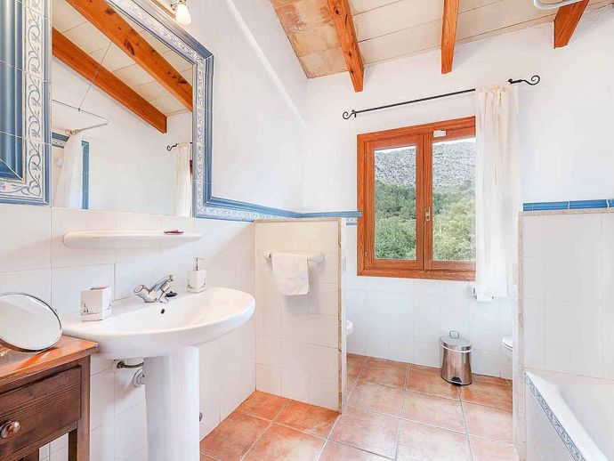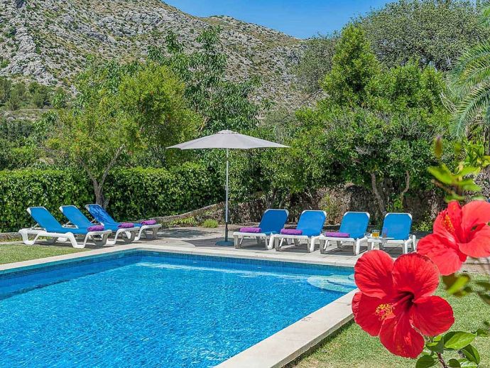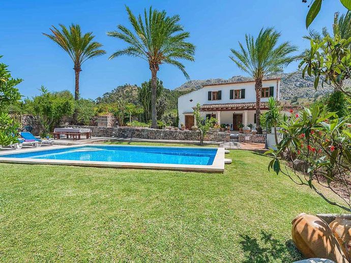 Casa Francisca with a private pool is a stunning 4-bedroom country farmhouse with an enviable location. Set in the foothills of the Tramuntana region offering beautiful all-round views yet just a 5-minute drive to Cala San Vicente with a splendid beach, three small bays and crystal clear waters. The house is for 8 guests and has been beautifully renovated in an authentic country farmhouse style, accentuated by elements like honey-hued ceiling beams, whitewashed walls, stone-tiled flooring and wrought iron chandeliers. Enter the villa via wooden doors into a cosy lounge, there is a dining area and a separate fully equipped kitchen with a breakfast table. The 4 bedrooms are air-conditioned, light and bright with colourful quilts and there are three pristine bathrooms for guests to share. The garden is divine with swaying palms, lush greenery and flowering bushes, a huge cactus grows at the side of the property and terracotta urns are dotted throughout the garden. The mosaic-tiled pool is perfect for the whole family to have fun in and there are plenty of places to pull up a sun lounger. Extending out from the house is a shady terrace furnished for al fresco dining and a brick-built barbecue for grilled meals. Casa Francisca is private, luxurious and peaceful, an ideal haven for families/friends to create happy memories and enjoy relaxing holidays in a picturesque and unspoiled area of Mallorca!