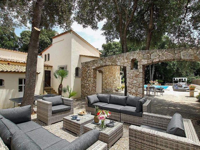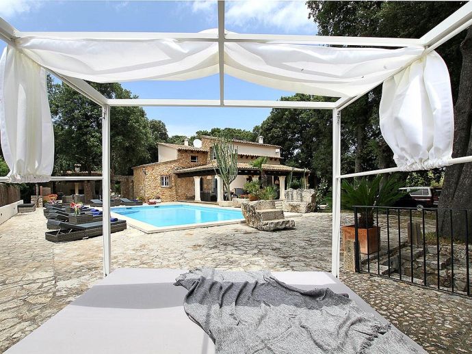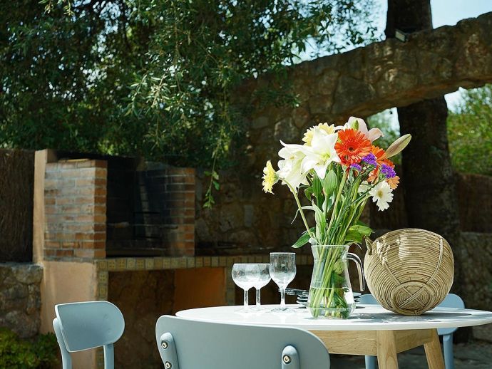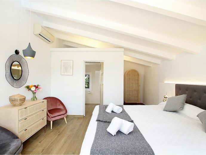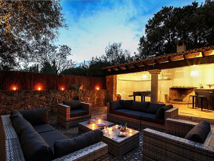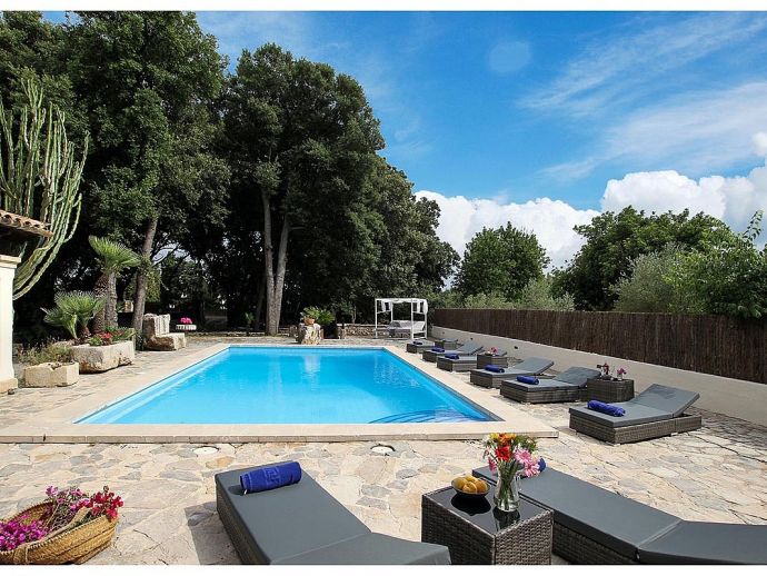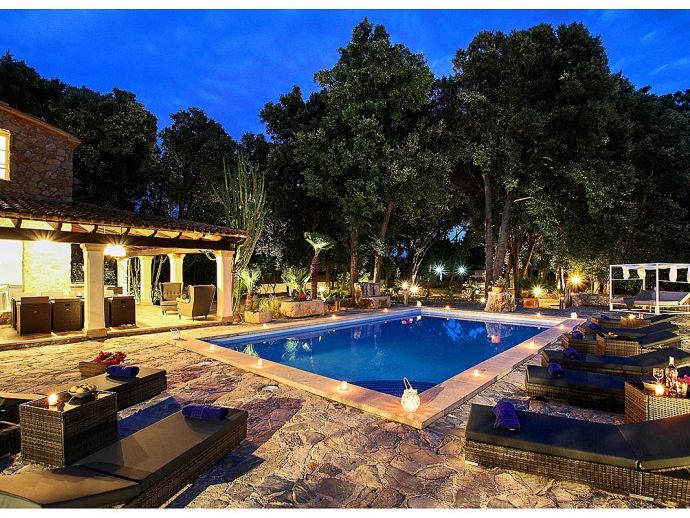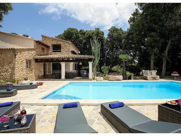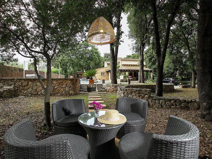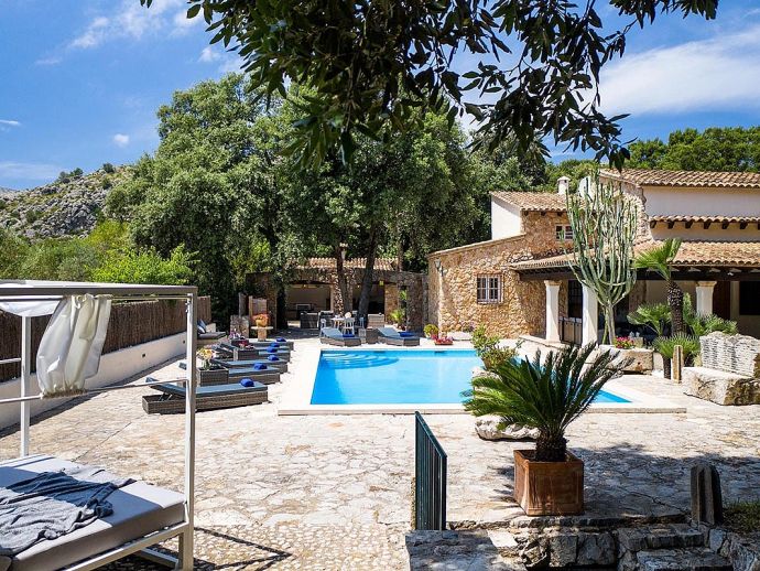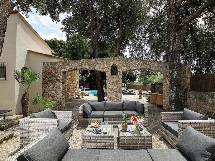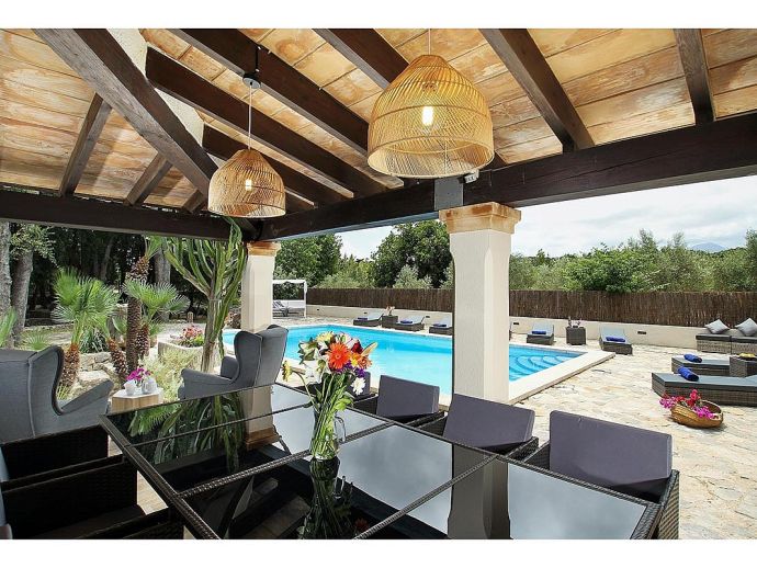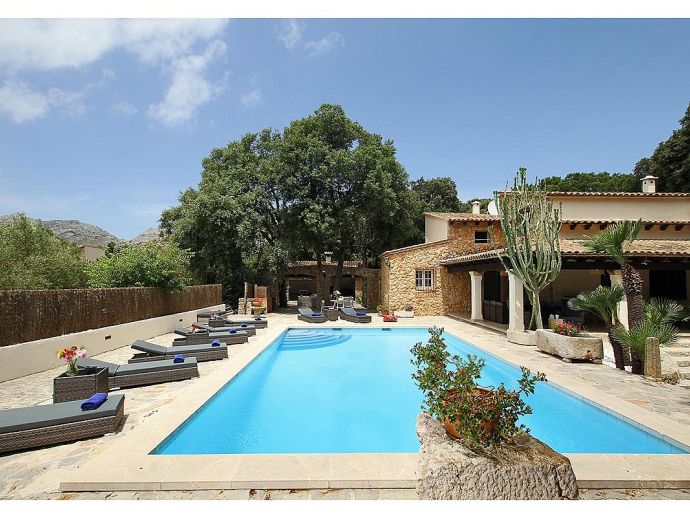Casa Beltran with a private pool is a stunning Mallorcan Stone House that has been lovingly restored, offering charming interiors, wonderful views, an idyllic setting and a convenient location. Set within a beautiful oak forest between the resorts of Pollenca, Port de Pollenca and Cala San Vicente means you can be in the heart of the old town or relaxing on one of the fantastic beaches in less than a 10-minute drive. The house sleeps up to 8 guests and has been carefully renovated retaining the character with added modern comforts. Among the most important improvements made are new interior flooring, renovation of bathrooms, air-conditioning in bedrooms and the installation of modern lighting to both the interior and exterior creating various atmospheres to enjoy day and night. Entering the house from the front terrace leads into a welcoming and stylish living room with comfortable sofas where you can enjoy a movie on the impressive 65-inch television, a Smart TV with wireless internet connection so that guests can sign in to their accounts and enjoy Amazon, Netflix, etc. An arch through to a hallway connects to the kitchen, the outside covered terrace and some of the sleeping accommodation. The kitchen is light, modern and fully equipped with appliances as well as a dining area with a table/chairs for 8. On this level, there are two of the four bedrooms; a double with a full en-suite bathroom, a twin and a second renovated bathroom complete the ground floor. On the upper floor, you will find two further bedrooms; a double with an en-suite shower room and another twin. The double room offers beautiful views of the Puig de Maria and Puig Tomir mountains. Outside continues to impress with several spaces and rest areas to enjoy different ambients including a platform with garden furniture in the shade of the oak trees. A private pool of more than 50 m² has roman steps and the large sun terrace that surrounds it has plenty of sun loungers and a Balinese day bed, perfect for lazy days in the sun. The front terrace is set up for alfresco dining and for grilled meals a brick-built barbecue is provided. Passing through the double-arched stone wall you enter the chillout area, with various seating and comforting shade during the day, there is a handy shower room, w/c and a covered terrace with a small bar, table football, table tennis. This area is beautifully lit at night and a great place to enjoy memorable evenings with family/friends. Casa Beltran provides a peaceful retreat for relaxing holidays in an idyllic setting whilst being close to amenities, restaurants, sandy beaches and attractions. A special property in a special location!.