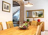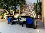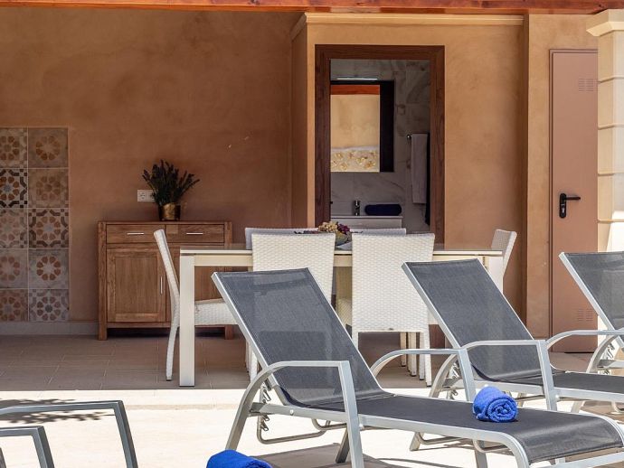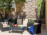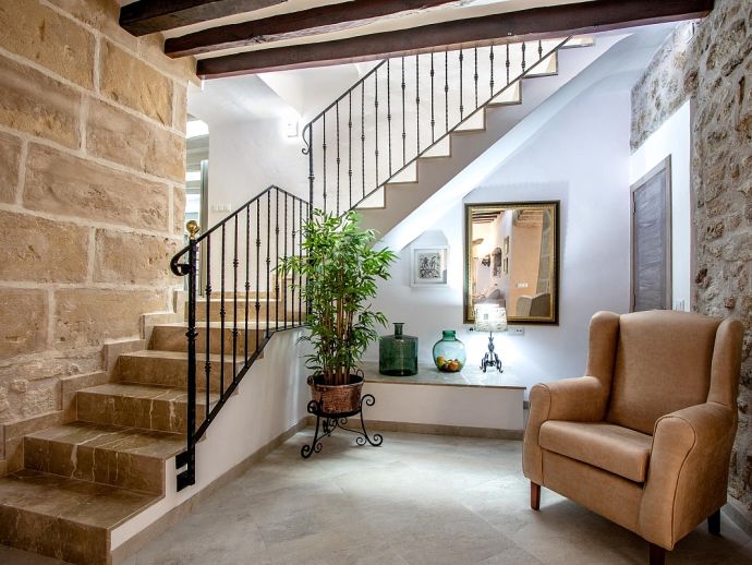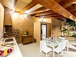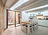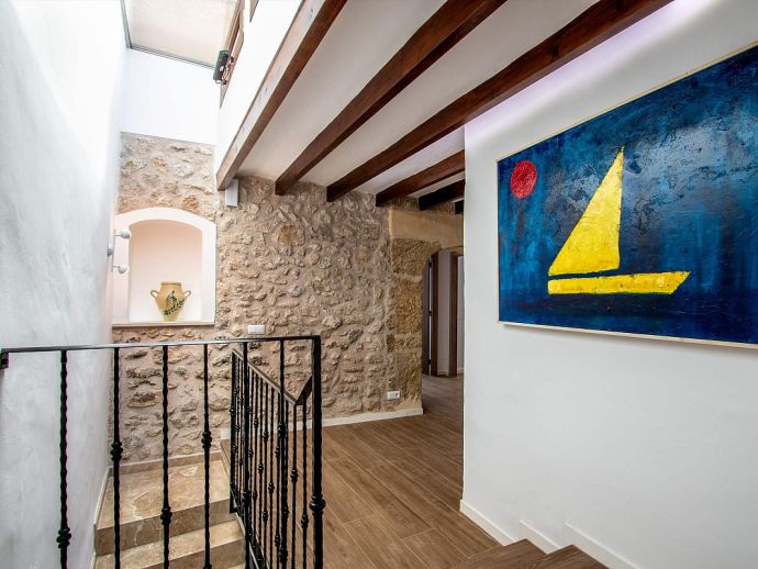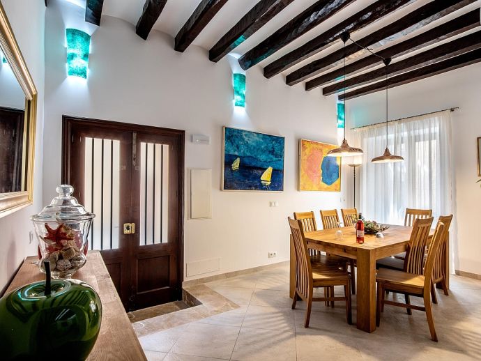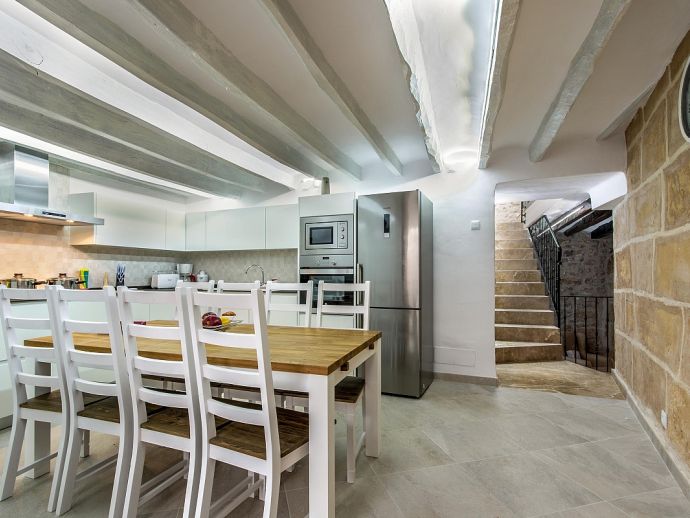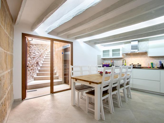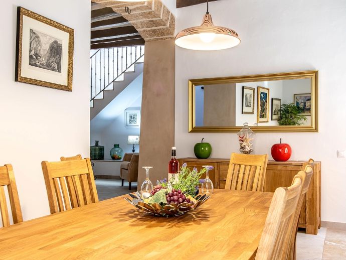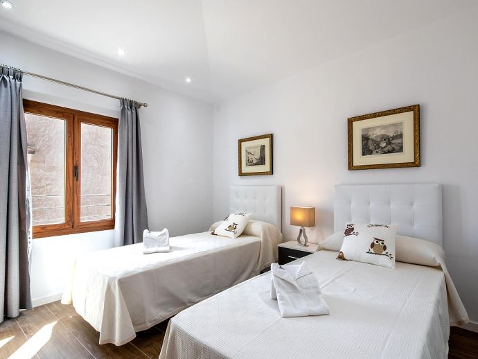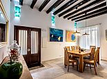 Casa Almudena is a stylish townhouse with a private pool, large terrace and a fabulous alfresco dining area that is situated in the heart of old town Pollenca’s historic quarter and just a few minutes walk from the fantastic main square lined with pavement cafe bars, restaurants and shops. The house sleeps 8 guests and has been lovingly refurbished using only the best quality materials, fixtures and fittings. The interiors are over split levels, fully air-conditioned and a delightful mix of the old character features beautifully blended with modern facilities and appliances. On entering, there is a dining area and a separate large lounge with comfortable sofas, flat-screen, satellite TV and DVD player. Steps lead down to a lovely and modern fitted kitchen, fully equipped with ceramic hob, electric oven, microwave, dishwasher, fridge/freezer, a table and chairs to use during breakfast time and a storeroom with lots of space. The kitchen has access to the swimming pool area and terraces. The 4 bedrooms are on the upper levels, they comprise of two twin bedrooms that share a bathroom and two doubles with en-suite bathrooms. The master double has direct access not only to the pool area but also to an upper terrace that enjoys very beautiful views over the town of Pollenca and to the bay of Port de Pollenca. The pool area is unusually large for a townhouse and very well designed, it has an elegant swimming pool with roman steps, surrounded by a stone terrace that is beautifully lit at night. There is a poolside shower, a sun terrace with plenty of sunbeds, an exterior toilet, and a fantastic covered outdoor kitchen equipped with microwave, dishwasher, sink, fridge/freezer, built-in barbecue and great exterior furniture, perfect for grilled meals and al fresco dining. Casa Almudena is an impressive holiday home with unique features and an exclusive location and is not one to be missed!
