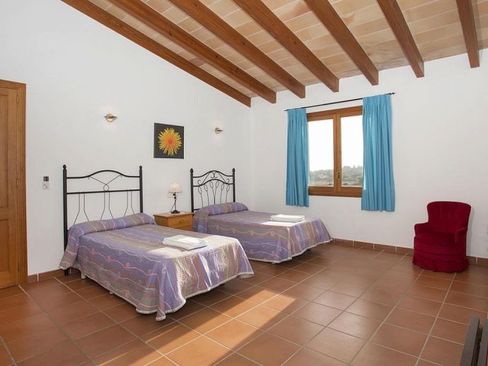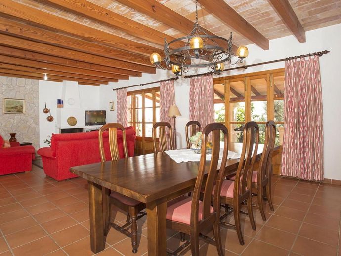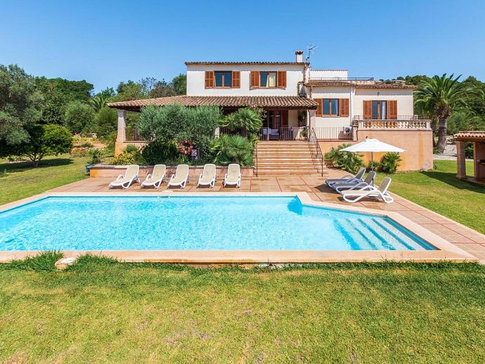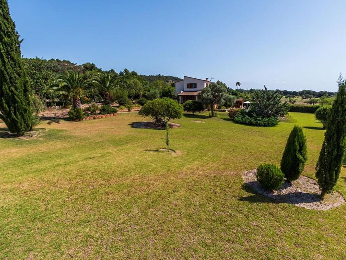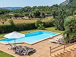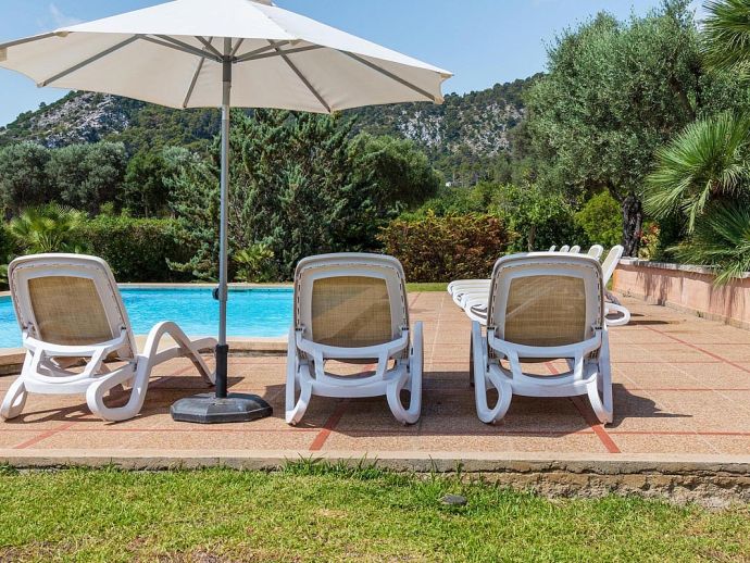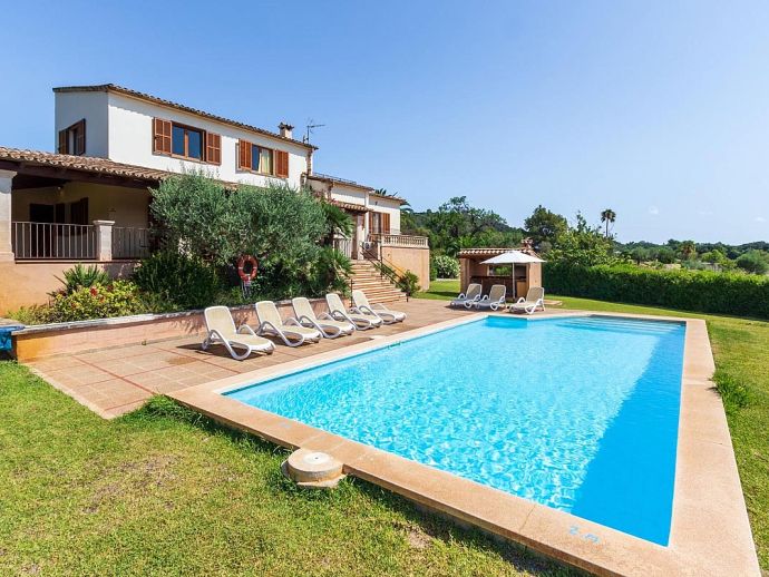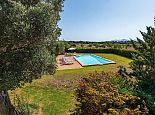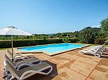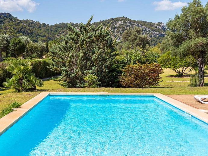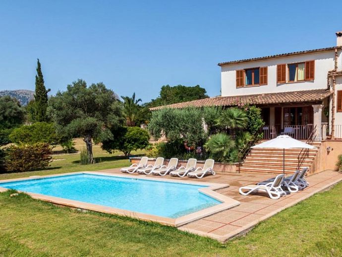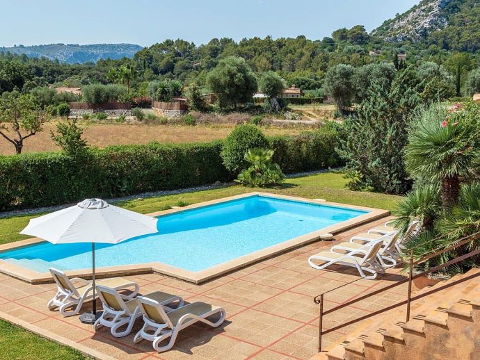 Casa Magalie with a private pool and a large garden is a 4-bedroom villa for 8 guests with an idyllic setting and a convenient location. Situated just 3 minutes from Pollenca golf course, less than 10 minutes drive to Pollenca old town and 15 minutes to Alcudia and the beautiful sandy beaches of Port de Pollenca, Platja d'Alcudia and Platja de Muro. The house has lovely views across the countryside, golf course, hills and pine forests to the mountains and the Monastery on top of the Puig de Maria. The interiors are typically Mallorcan in style with beamed ceilings, tiled floors and traditional furnishings that are distributed over 3 levels. On the ground level, there is a fully equipped kitchen with a breakfast table, a utility room with a pantry, a shower room and a lounge/dining room with an open fireplace, satellite TV, DVD player and access to the large L-shaped covered terrace. Stairs from the hall lead to the next level with a master bedroom, a twin bedroom and a bathroom. Both bedrooms have lovely views and the master has the added benefit of a private balcony. Continuing up the staircase to the third level, there is a further bathroom, two twin bedrooms and a landing area with beautiful views over the golf course and to the Monastery on top of the Puig de Maria. All bedrooms are air-conditioned/heated and have built-in wardrobes. Outside, the shady furnished terrace is a great place to relax and it's also gated to the steps leading down to the enchanting garden with ample lawn areas for children to play. A sun terrace with loungers surrounds an inviting private pool and to the side is a little barbeque pavilion with a brick-built barbecue, a Mallorcan sink and a food preparation space, perfect for lovers of grilled meals and al fresco dining. Casa Magalie is ideal for families/friends seeking a rural retreat with amazing views in a location close to the golf course, shops, restaurants, attractions and sandy beaches!