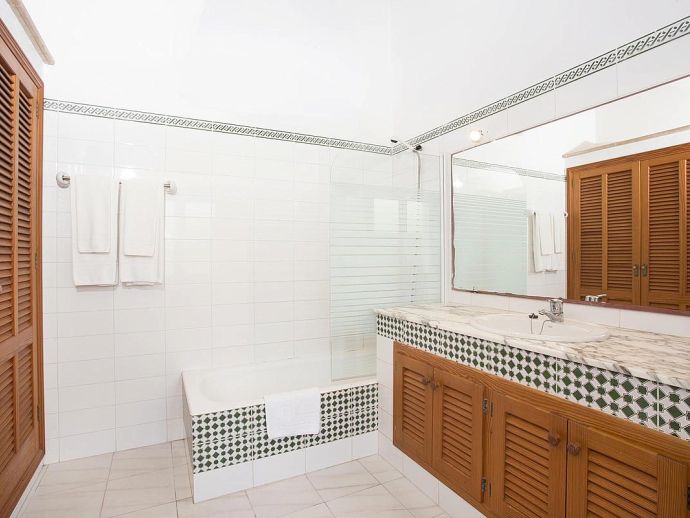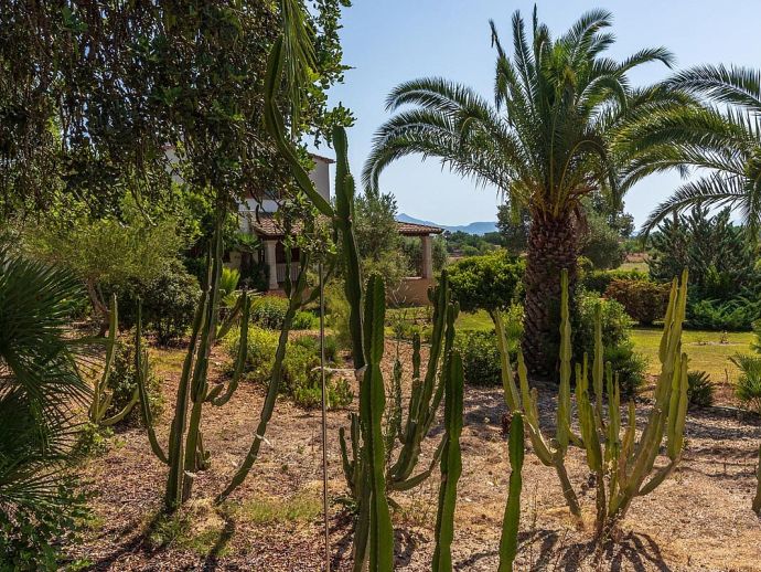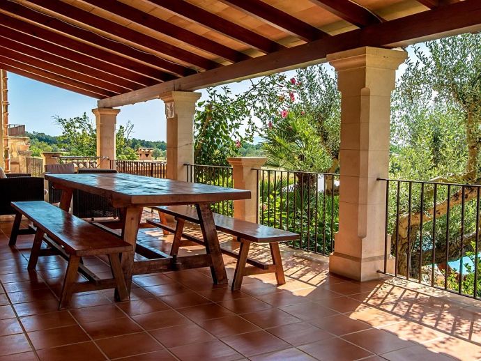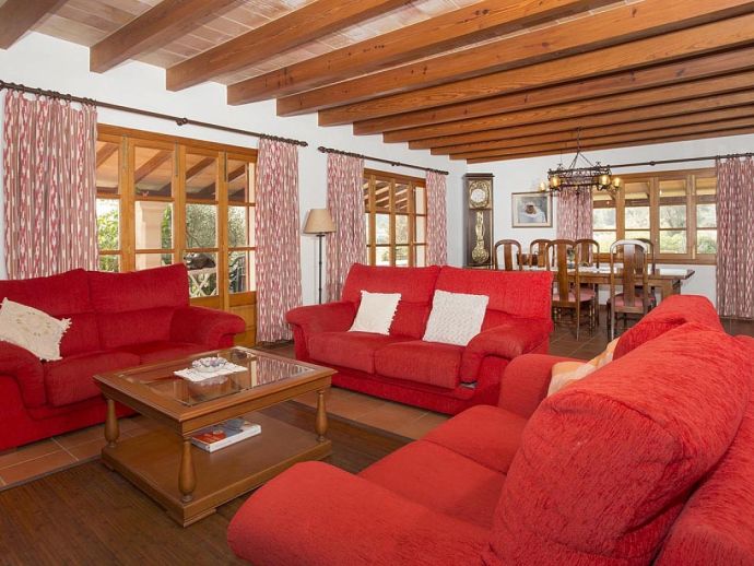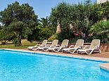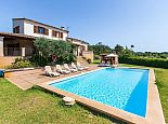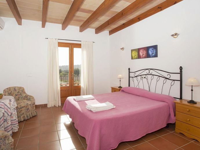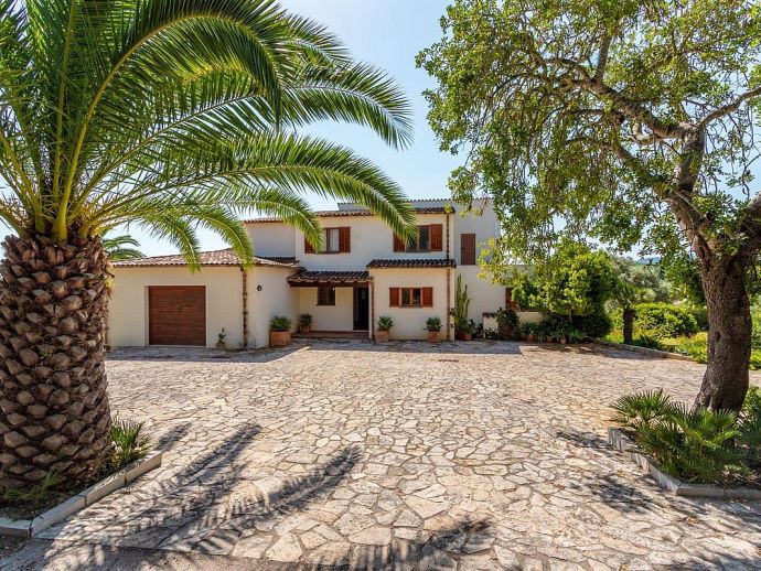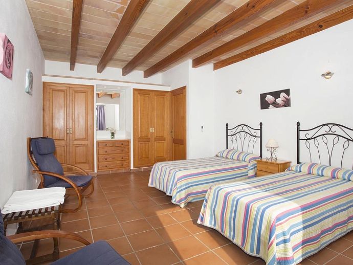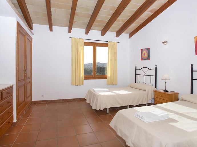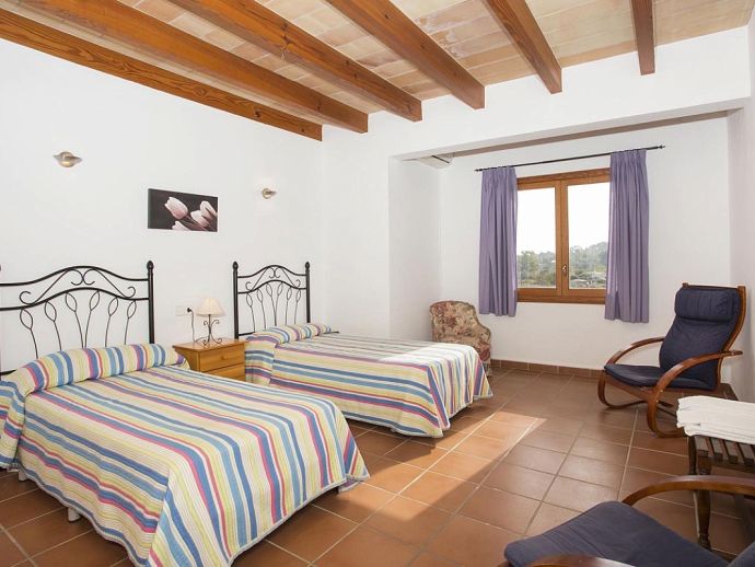 Casa Magalie with a private pool and a large garden is a 4-bedroom villa for 8 guests with an idyllic setting and a convenient location. Situated just 3 minutes from Pollenca golf course, less than 10 minutes drive to Pollenca old town and 15 minutes to Alcudia and the beautiful sandy beaches of Port de Pollenca, Platja d'Alcudia and Platja de Muro. The house has lovely views across the countryside, golf course, hills and pine forests to the mountains and the Monastery on top of the Puig de Maria. The interiors are typically Mallorcan in style with beamed ceilings, tiled floors and traditional furnishings that are distributed over 3 levels. On the ground level, there is a fully equipped kitchen with a breakfast table, a utility room with a pantry, a shower room and a lounge/dining room with an open fireplace, satellite TV, DVD player and access to the large L-shaped covered terrace. Stairs from the hall lead to the next level with a master bedroom, a twin bedroom and a bathroom. Both bedrooms have lovely views and the master has the added benefit of a private balcony. Continuing up the staircase to the third level, there is a further bathroom, two twin bedrooms and a landing area with beautiful views over the golf course and to the Monastery on top of the Puig de Maria. All bedrooms are air-conditioned/heated and have built-in wardrobes. Outside, the shady furnished terrace is a great place to relax and it's also gated to the steps leading down to the enchanting garden with ample lawn areas for children to play. A sun terrace with loungers surrounds an inviting private pool and to the side is a little barbeque pavilion with a brick-built barbecue, a Mallorcan sink and a food preparation space, perfect for lovers of grilled meals and al fresco dining. Casa Magalie is ideal for families/friends seeking a rural retreat with amazing views in a location close to the golf course, shops, restaurants, attractions and sandy beaches!