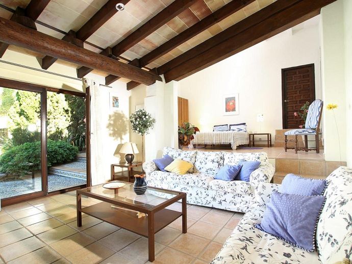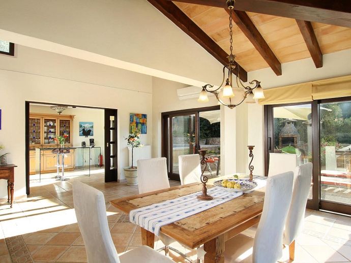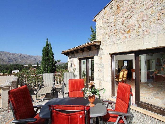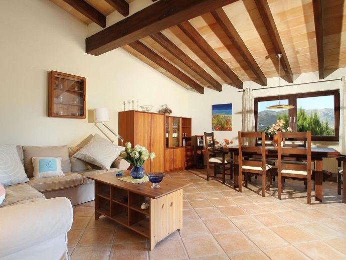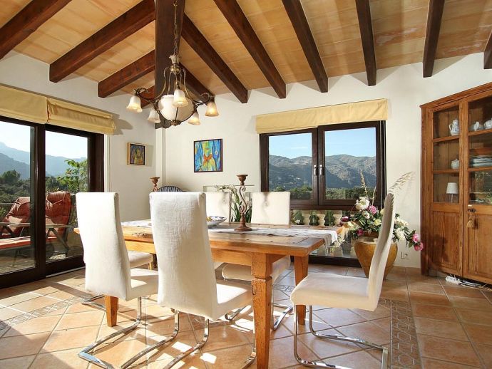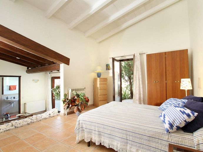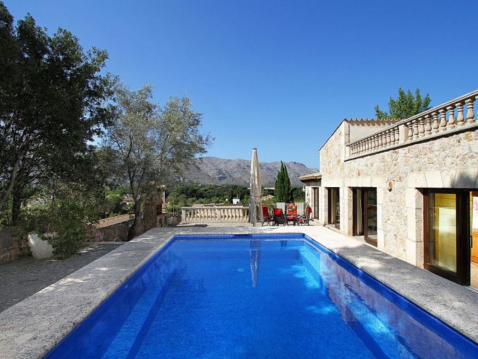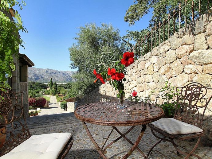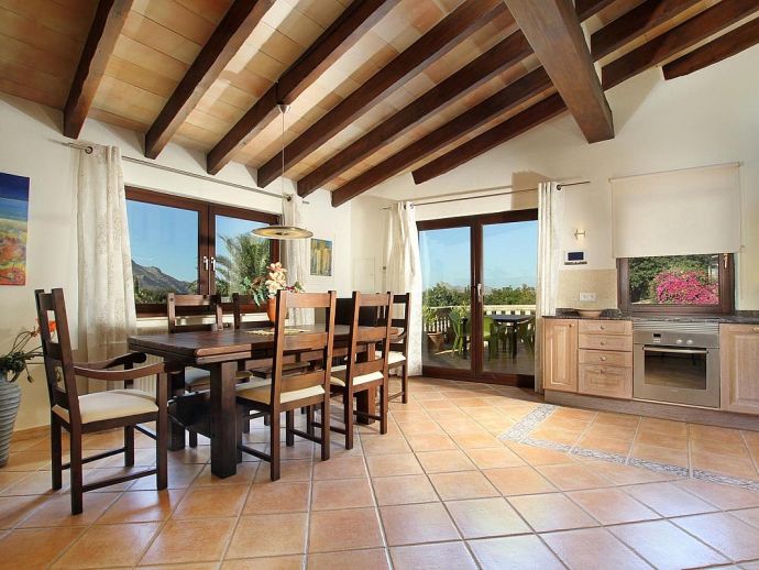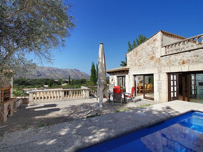 Finca Bougainvillea is an impressive holiday villa with a private pool, a great sauna, extensive gardens and a fantastic location. Situated on a wooded hillside with far-reaching views of the surrounding countryside and mountains yet only 5 minutes drive or bicycle ride to Old Town Pollenca with its excellent selection of shops and restaurants, whilst the beaches in the resorts of Cala San Vicente and Port de Pollenca are just 10 minutes by car. The property is for 8 guests with accommodation split between the main house and the annexe so ideal for families/friends wishing to holiday together and also have some privacy when required. The main house comprises a bright and spacious open plan lounge/dining area with panoramic views and walls decorated with beautiful artworks, painted by the owner. A modern and well-equipped kitchen that can be separated from the lounge by a sliding door. Two bedrooms, a double and a twin that share a large bathroom with sunken bath and a separate walk-in shower. The annexe is divided into two parts with an interconnecting door that can be either locked or un-locked to your preference. The first part has an open-plan furnished lounge/dining/kitchenette with patio doors and a terrace, a bedroom with 2 single beds and an en-suite shower room. The second part has a double bedroom, a separate shower room and a lounge area with comfortable sofas. Outside, the property is set within mature gardens with a large lawn, Bougainvillea and furnished terraces on different levels. In addition to the spectacular views, highlights include a private pool, a lovely sauna, alfresco dining, built-in barbecue and table tennis. Accessed via a sweeping drive lined with fruit trees, Finca Bougainvillea provides a private, idyllic retreat for relaxing holidays and a convenient location close to shops, restaurants, attractions and beaches!
