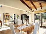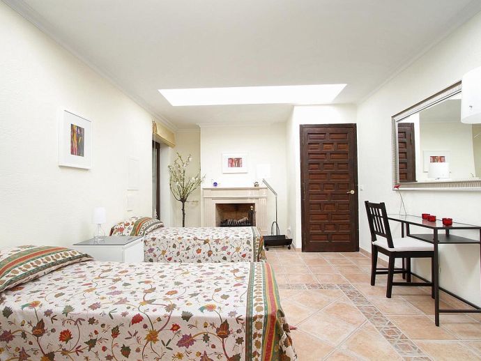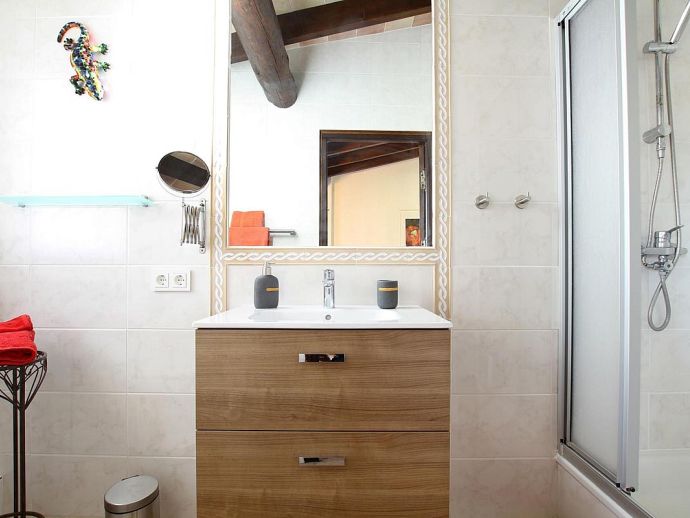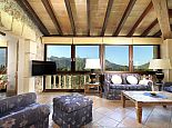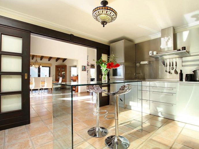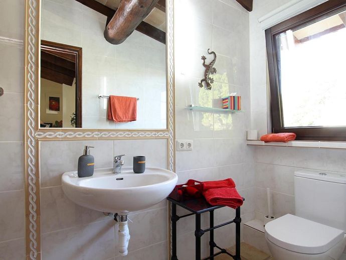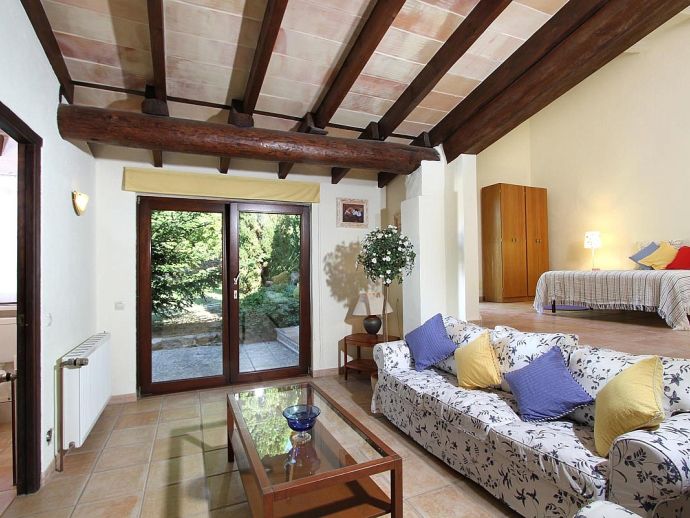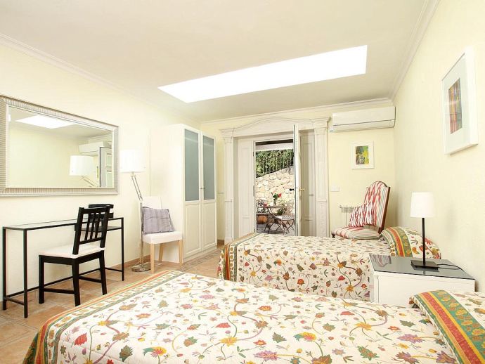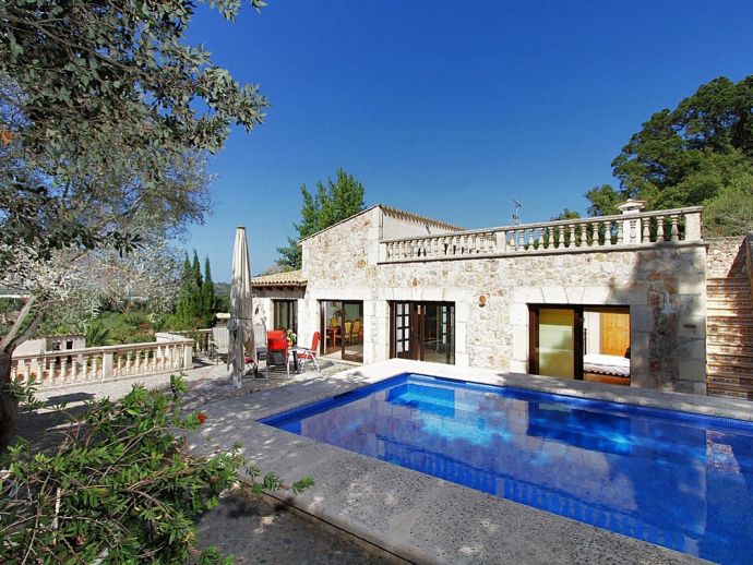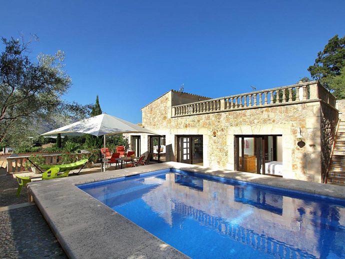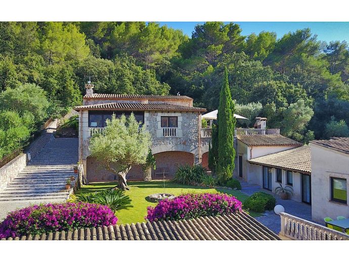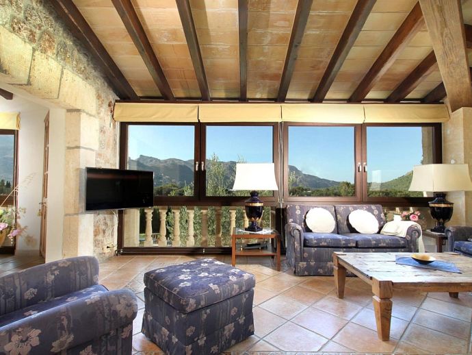 Finca Bougainvillea is an impressive holiday villa with a private pool, a great sauna, extensive gardens and a fantastic location. Situated on a wooded hillside with far-reaching views of the surrounding countryside and mountains yet only 5 minutes drive or bicycle ride to Old Town Pollenca with its excellent selection of shops and restaurants, whilst the beaches in the resorts of Cala San Vicente and Port de Pollenca are just 10 minutes by car. The property is for 8 guests with accommodation split between the main house and the annexe so ideal for families/friends wishing to holiday together and also have some privacy when required. The main house comprises a bright and spacious open plan lounge/dining area with panoramic views and walls decorated with beautiful artworks, painted by the owner. A modern and well-equipped kitchen that can be separated from the lounge by a sliding door. Two bedrooms, a double and a twin that share a large bathroom with sunken bath and a separate walk-in shower. The annexe is divided into two parts with an interconnecting door that can be either locked or un-locked to your preference. The first part has an open-plan furnished lounge/dining/kitchenette with patio doors and a terrace, a bedroom with 2 single beds and an en-suite shower room. The second part has a double bedroom, a separate shower room and a lounge area with comfortable sofas. Outside, the property is set within mature gardens with a large lawn, Bougainvillea and furnished terraces on different levels. In addition to the spectacular views, highlights include a private pool, a lovely sauna, alfresco dining, built-in barbecue and table tennis. Accessed via a sweeping drive lined with fruit trees, Finca Bougainvillea provides a private, idyllic retreat for relaxing holidays and a convenient location close to shops, restaurants, attractions and beaches!