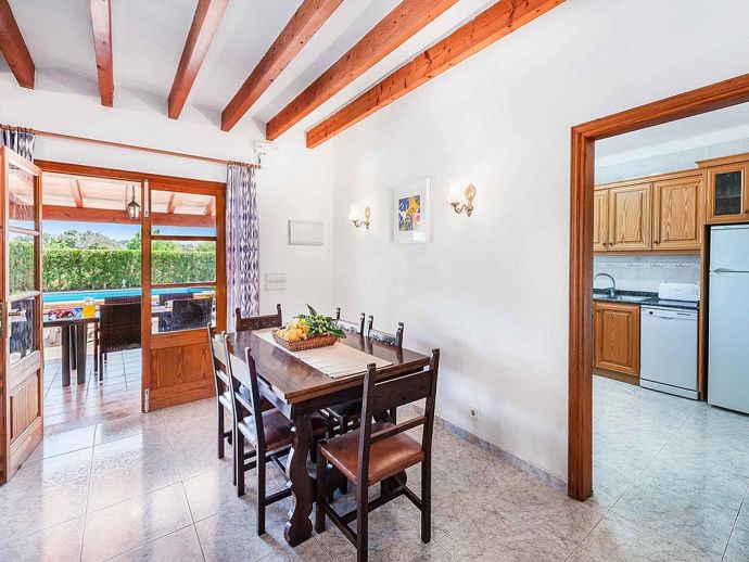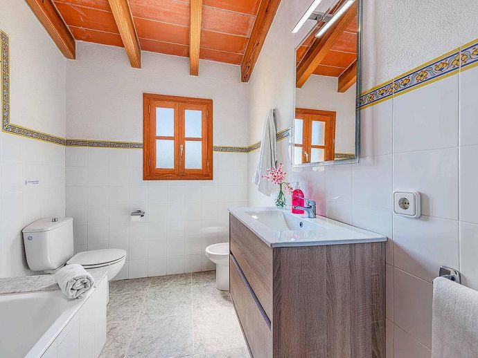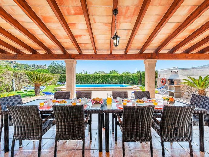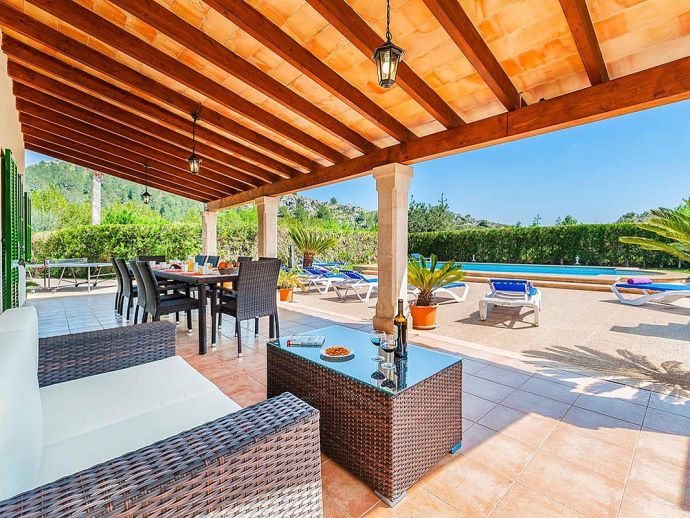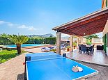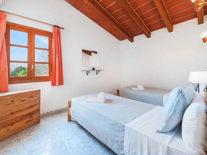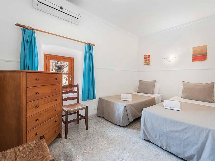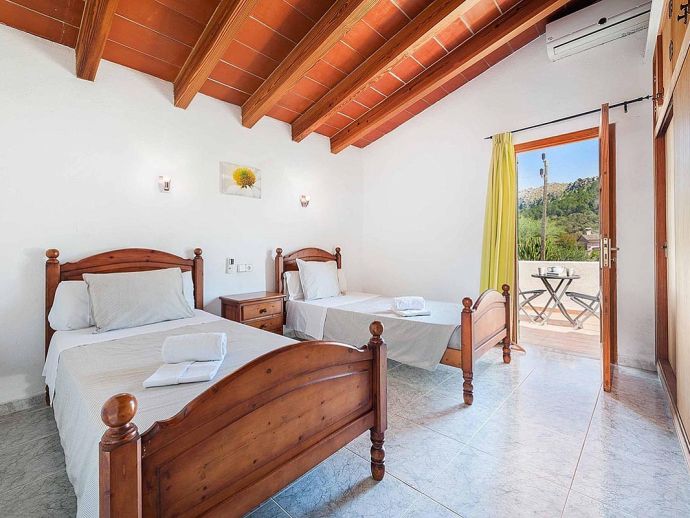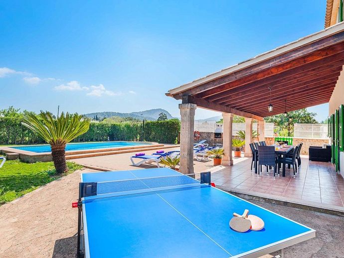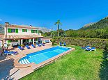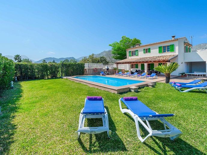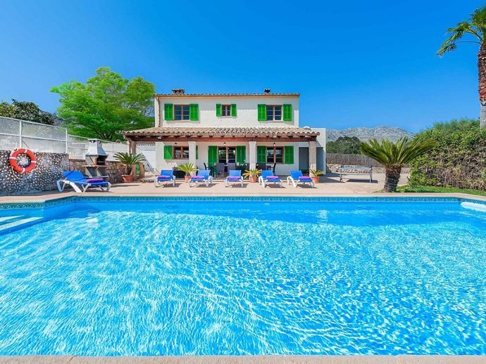 Casa Agustin with a private pool is a large family villa for 10 guests offering lovely mountain views, an idyllic setting and a convenient location. Situated between Pollenca, Port de Pollenca and Cala San Vicente gives you easy access to three fantastic resorts as well as a golf course in less than 10 minutes' drive. Set over two floors, the entrance leads into a large living/dining area, which has a wood-burner, comfortable sofas, a flat-screen, satellite TV, DVD player and Wi-Fi. The kitchen is separate, fully equipped with appliances and a small breakfast table. On this level, you will also find one bedroom, a twin, and a private shower room. Upstairs, there are four bright and spacious bedrooms (3 twins/1 double) and two shared bathrooms. All bedrooms benefit from air-conditioning and two of the upper-level rooms have terraces which boast fabulous views of the surrounding countryside and mountains. The villa is accessed via a driveway to a lovely garden with a lawn area backed with cypress trees and hedges providing privacy for lazy days under the Mallorcan sun. There is a large private pool with Roman steps and plenty of space for loungers on the surrounding paved terrace. A brick-built barbecue is provided and the covered terrace that extends along the length of the house is perfect for al fresco dining or relaxing in the shade. Casa Augustin is ideal for families/friends seeking a quiet countryside retreat that also offers easy access to shops, restaurants, attractions and beautiful beaches.