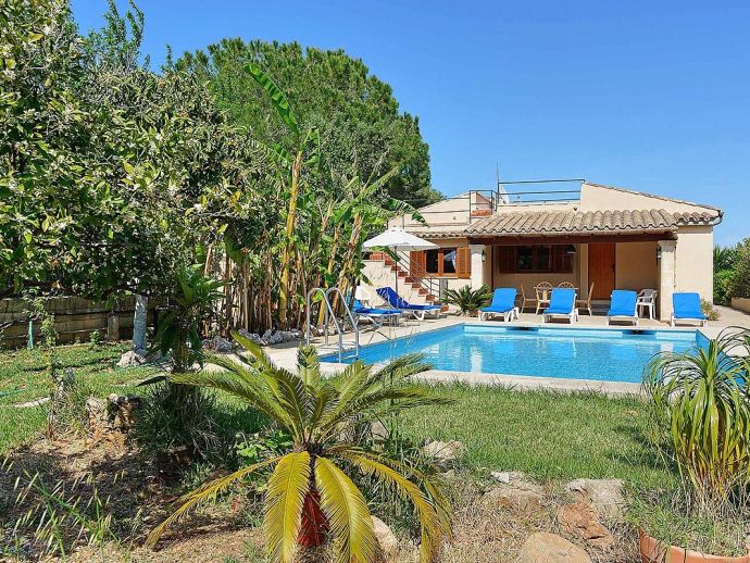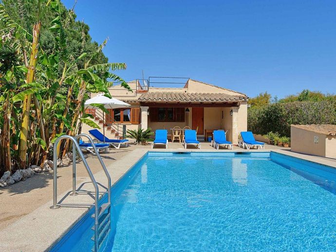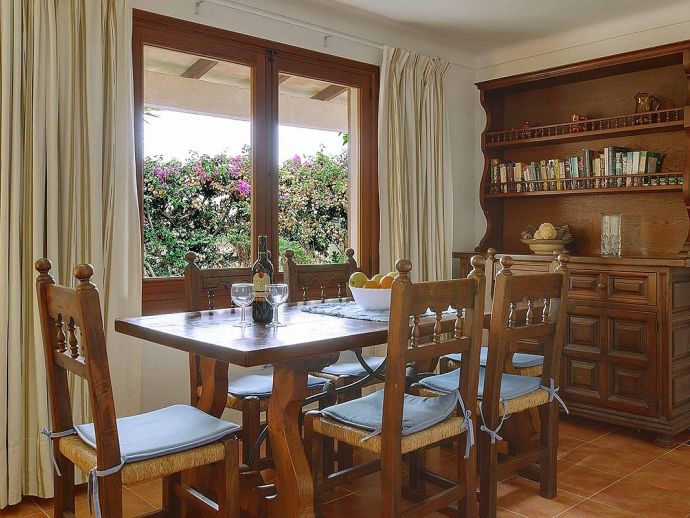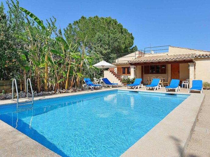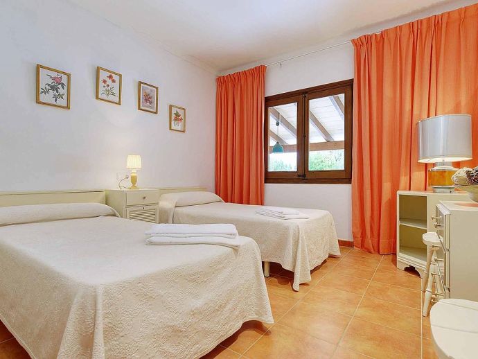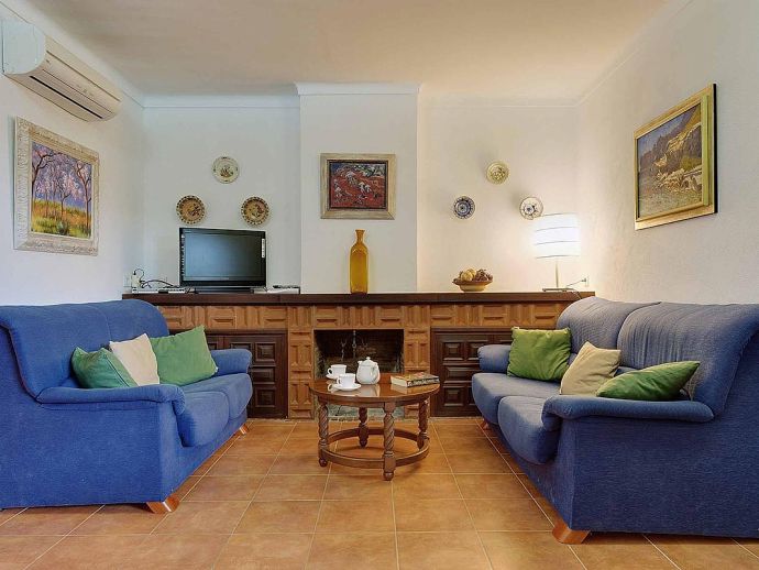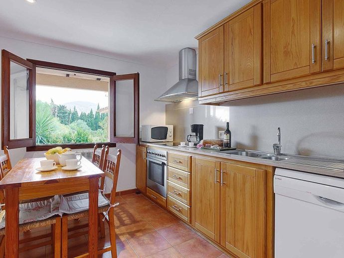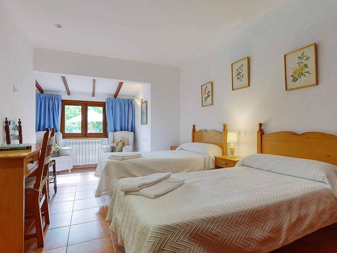 Casa Alonso with a private pool has an excellent location just 15 minutes walk to old town Pollenca and 10 minutes drive to the beach resorts of Port de Pollenca and Cala San Vicente. Nestled within the lush, green countryside with gently sloping hills as a backdrop the house has a peaceful hide-away vibe and sleeps up to 6 guests. The interiors are air-conditioned and decorated like a traditional Mallorcan home, with white walls, terracotta tiles, wooden furniture and natural linens. Distributed over one floor, there is a lounge/dining area, a separate fully equipped kitchen with a breakfast table and 3 bedrooms (twin beds), an en-suite shower room, and a second shared family bathroom. Outside, a covered dining terrace and a barbecue are provided for meals al fresco, from here external stairs lead to a terrace above with far-reaching views. Casa Alonso has a fenced garden, parking and a private swimming pool which are an added advantage for a property close to the town and is ideal for families looking for a relaxing holiday in a countryside setting close to shops, restaurants, attractions and beaches.