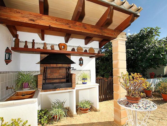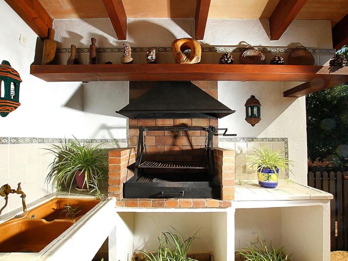 Covered outdoor kitchen/food preparation area, brick-built barbecue.