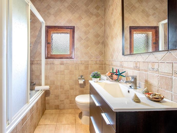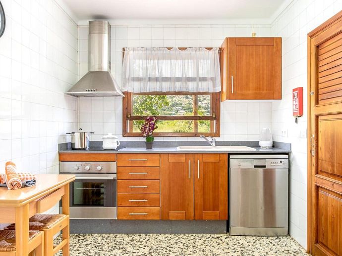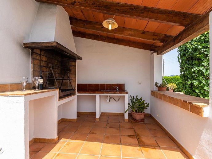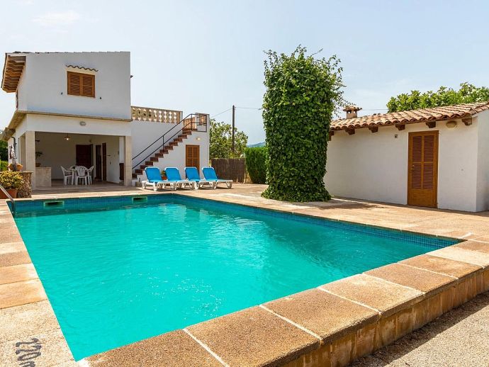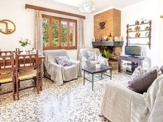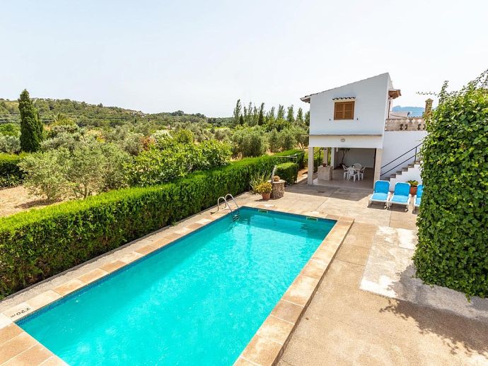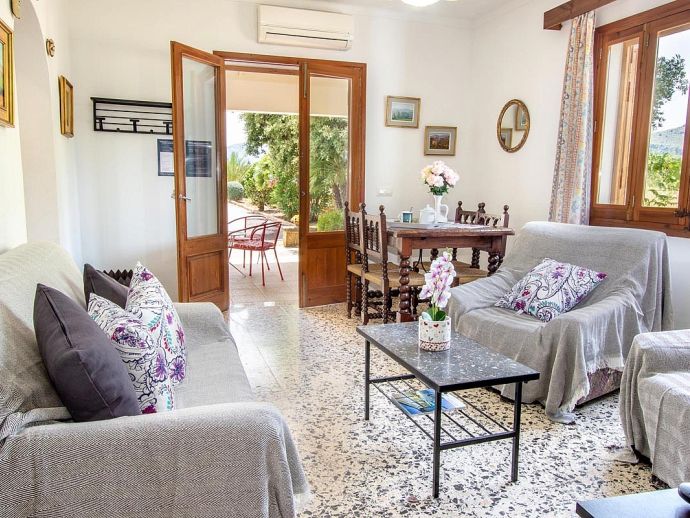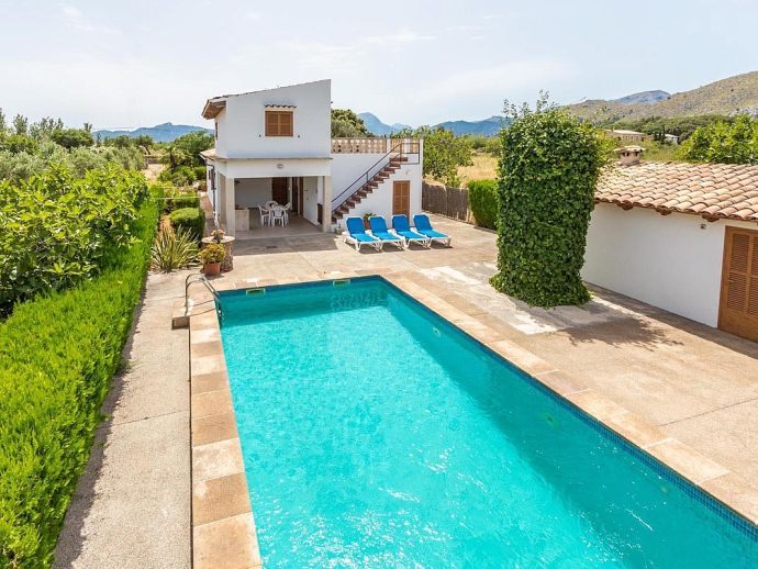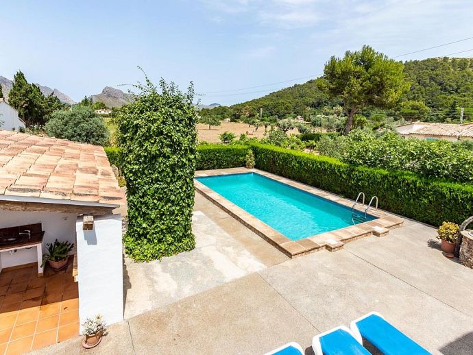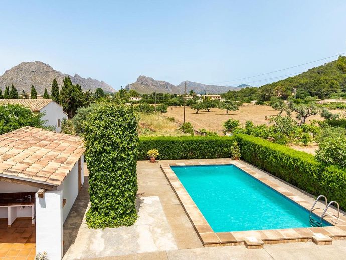 Casa Erica with a private pool is a comfortable holiday villa for 4 guests located in the pretty countryside just outside of Port de Pollenca. The villa offers a peaceful setting with lovely mountain views as well as easy access to a sandy beach resort (5 mins drive), old town Pollenca and Cala San Vicente (10 mins drive). The accommodation is across one level with interiors that are simply designed and decorated with white walls, tiled floors and dark wood furnishings. The lounge has an open fireplace, satellite TV, DVD player, a sofa, easy chairs and a dining table. There is a newly fitted kitchen equipped with a dishwasher, electric oven, ceramic hob and a fridge/freezer. The two bedrooms (1 x double/1 x twin) share a family bathroom and the double room has French doors out to the side terrace. Air-conditioning is provided in the bedrooms and the lounge. Outside, at the back of the property, you will find a great swimming pool surrounded by a terrace edged by hedgerows providing plenty of privacy for lazy days spent by the pool. A covered kitchen area with a built-in barbecue is a lovely place to cook and eat outside whilst enjoying the mountain views. Casa Erica would suit a small family or a couple seeking a quiet retreat in a location that's convenient to reach beaches, activities, shops and restaurants!
