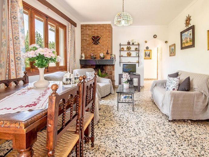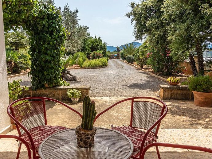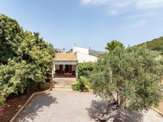 Plot 2587 m² - Driveway with mature trees, shrubs and oleanders to parking area at the front. Terraces at the back with views of the countryside and Tramuntana mountains.