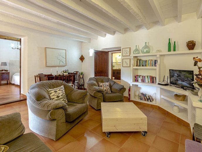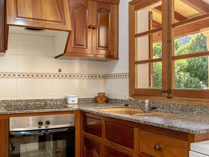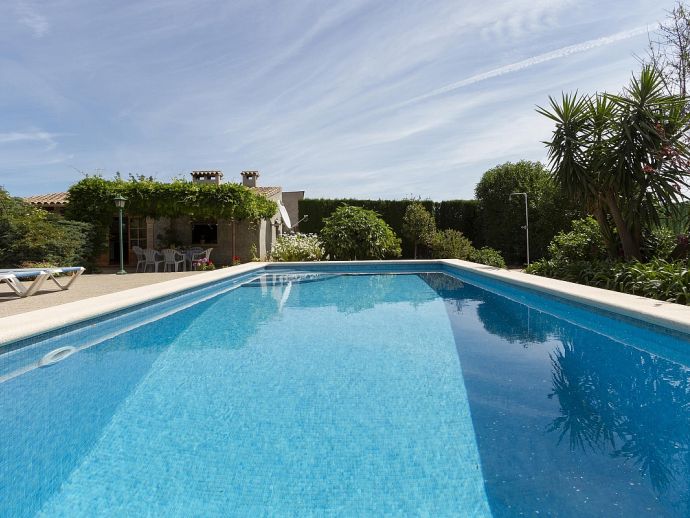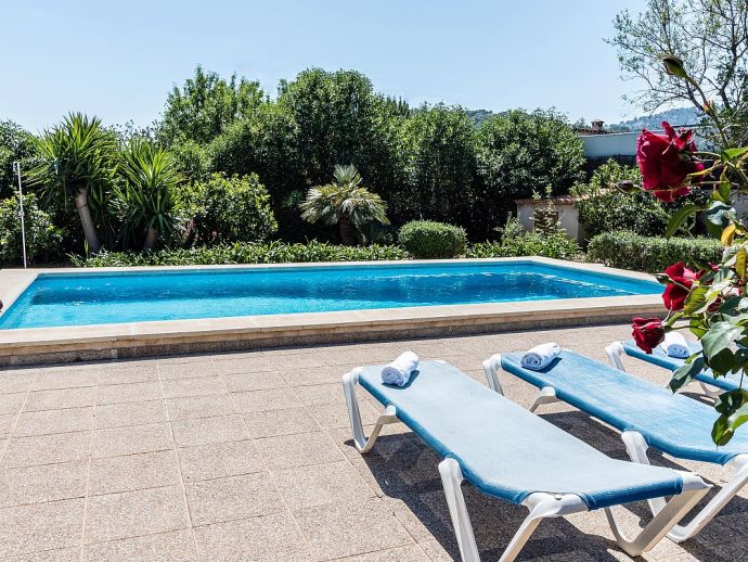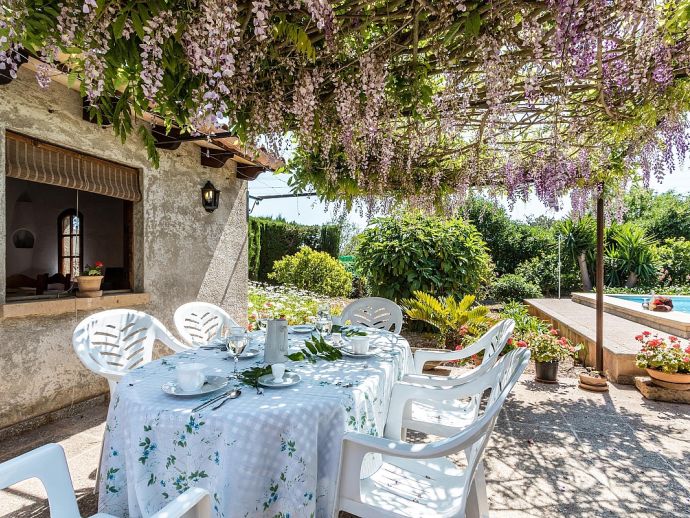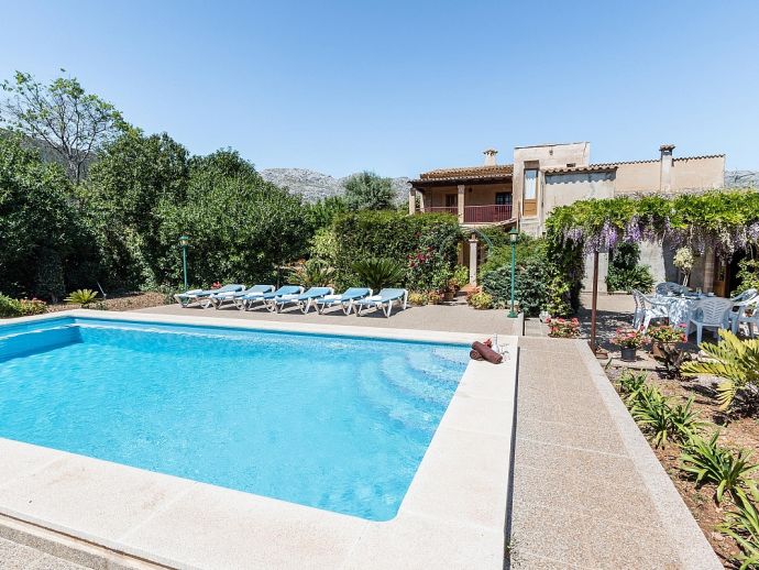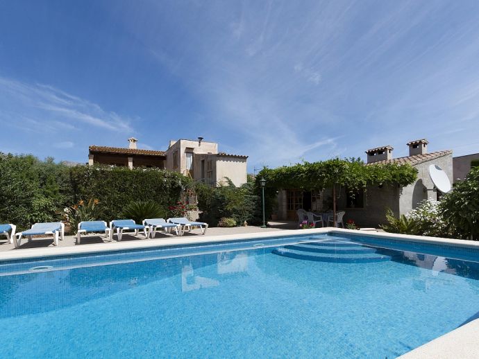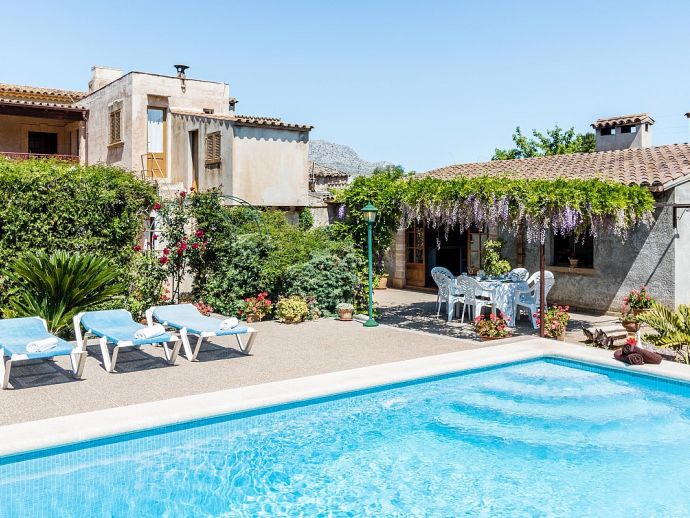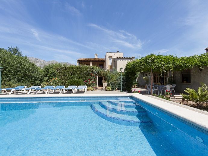 Casa Agustina with a private pool is a traditional Mallorquin style country house set off the main road that connects Pollensa and Port de Pollensa. This convenient location provides easy access to Old Town Pollensa, Pollensa Golf course and the beautiful beaches at Port de Pollensa and Cala San Vicente. The house sleeps 6 guests and consists of two floors with only the ground floor available to rent. Inside, the decoration is rustic in style with wood beam ceilings, tiled floors, white-washed walls and some antique furnishings. The accommodation comprises a lounge/dining room, 3 air-conditioned bedrooms, one double, two twins and a shared family bathroom. Through the outside terrace, a door leads into the kitchen which is fitted with all the necessary electrical appliances. Adjacent is a huge traditional kitchen/barbeque house equipped with work surfaces, a sink, dining furniture, fireplace and built-in barbecue and wood oven. A second exterior modern bathroom and utility area with laundry facilities complete the house. Outside, an established garden and a sun terrace with loungers surround a private swimming pool, perfect for lazy days relaxing in the sunshine. Casa Agustina is a great family retreat offering spacious accommodation close to shops, restaurants and beaches!