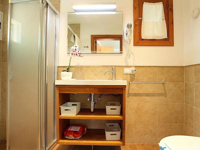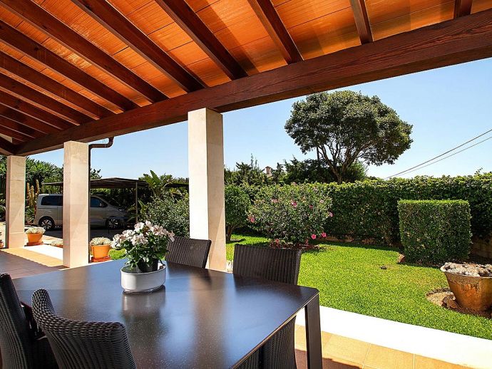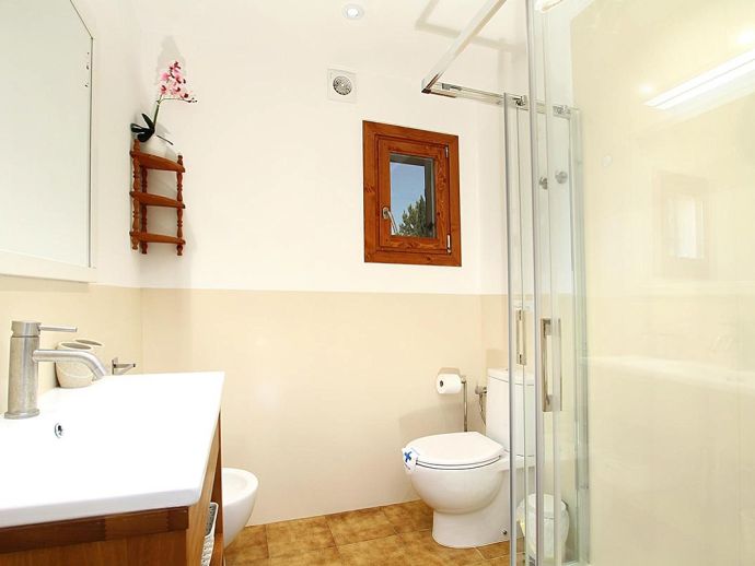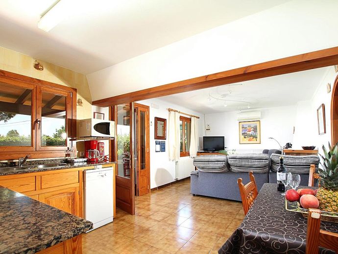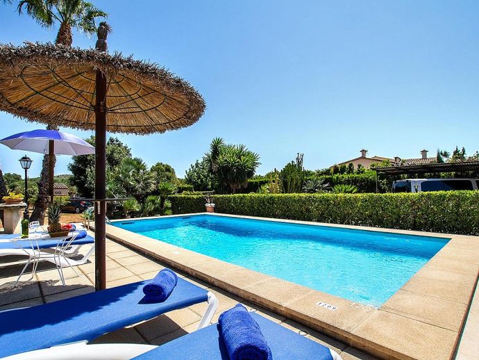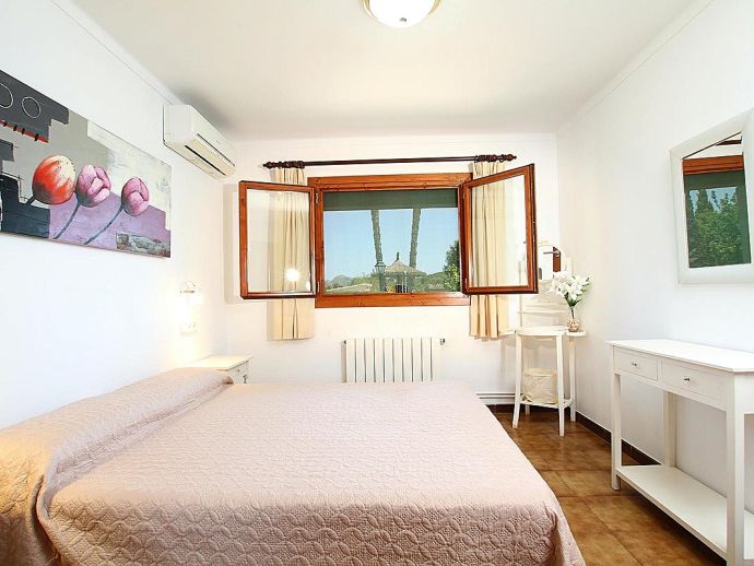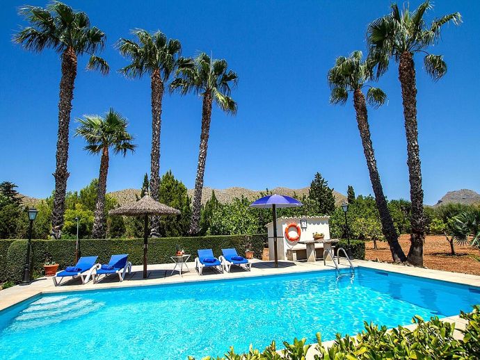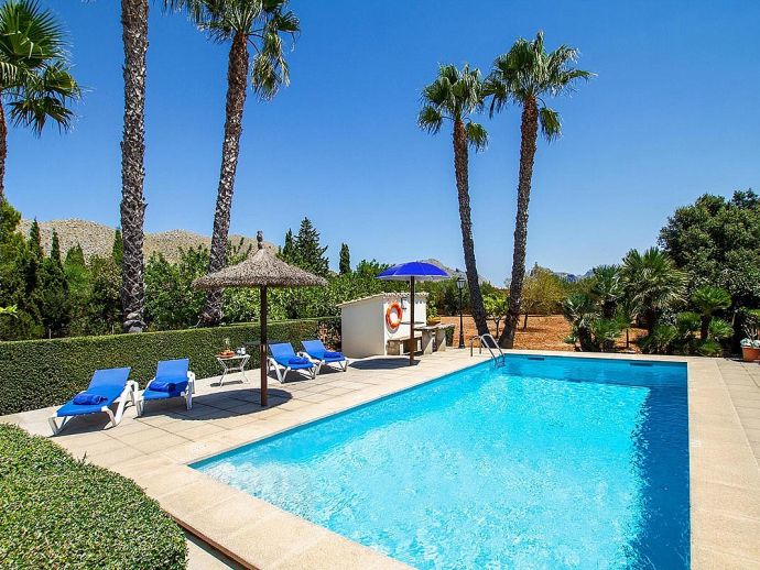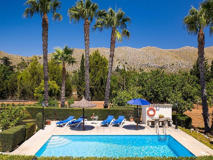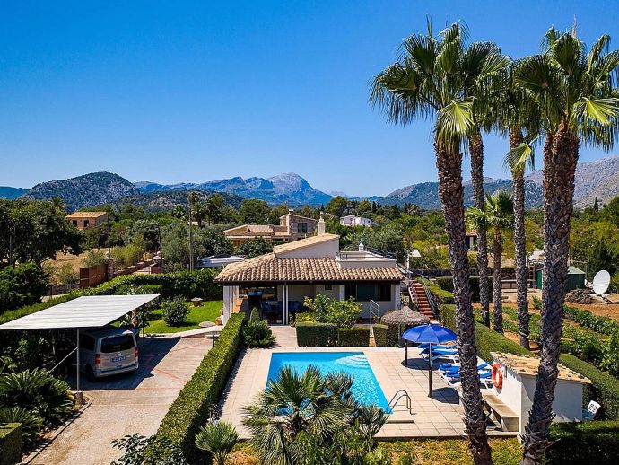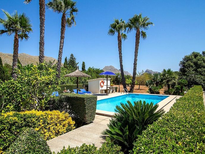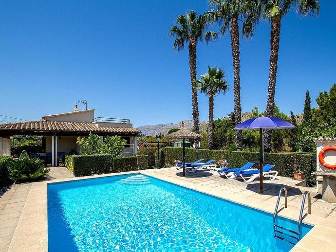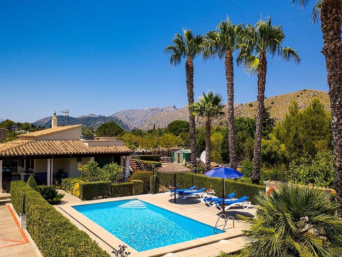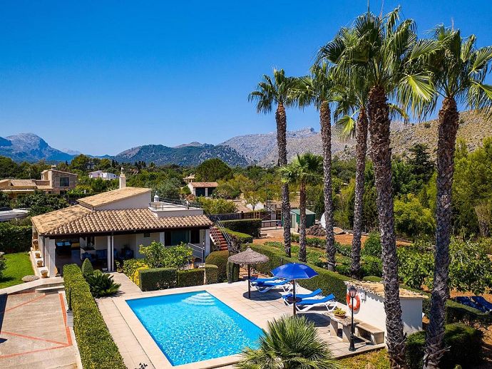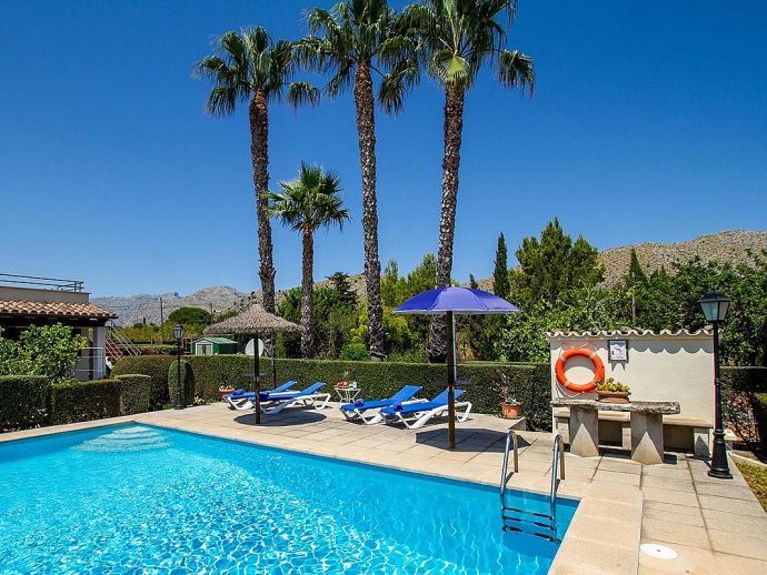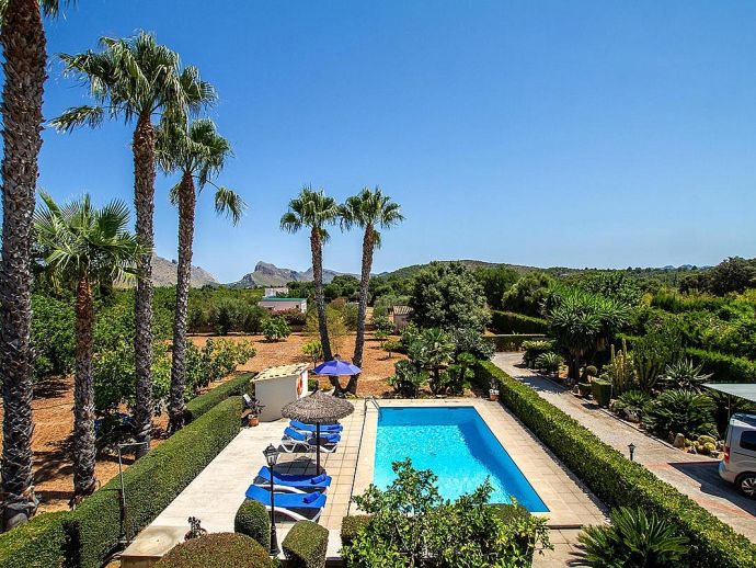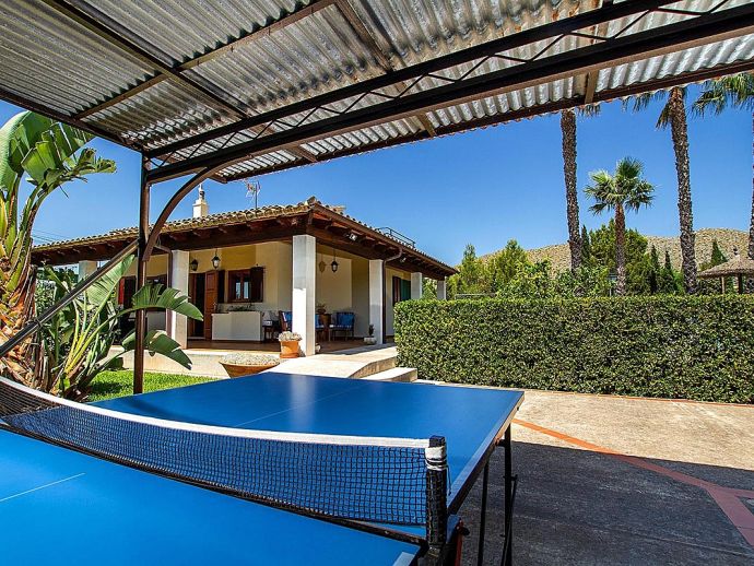 Villa Pamela with a private pool is a single-storey villa with mountain views situated in the peaceful and beautiful countryside between Pollenca and Port de Pollenca. From this convenient location, you have very easy and quick access to both resorts (10 minutes by car), a beautiful coastline, great beaches and a diversity of culture, shops and restaurants. The villa sleeps 4 guests and is air-conditioned throughout with free Wi-Fi and all modern amenities provided. Inside is comfortably furnished and comprises an open plan living space with a fully equipped kitchen, dining table/chairs and lounge with patio doors out to the terrace/garden. Two bedrooms, one double and one twin with an en-suite shower room and a further bathroom with shower. The house is set within lovely, mature gardens which are well-maintained by the owners and surrounded by fig and almond orchards. There is an inviting private pool, a sun terrace with loungers, table tennis, a built-in barbecue and a covered veranda/dining terrace, a perfect spot for meals al fresco and relaxing in this peaceful area. Villa Pamela is ideal for a couple or a small family with children seeking a countryside location that's within easy reach of shops, restaurants, attractions and beaches.