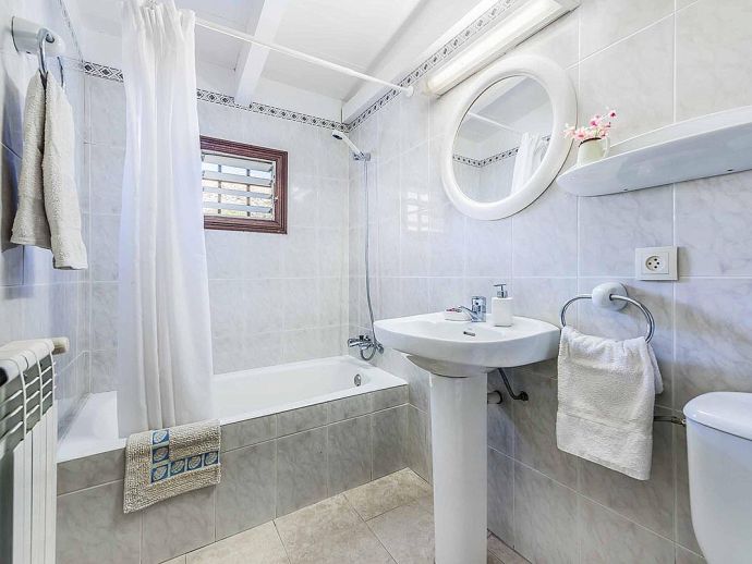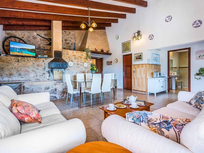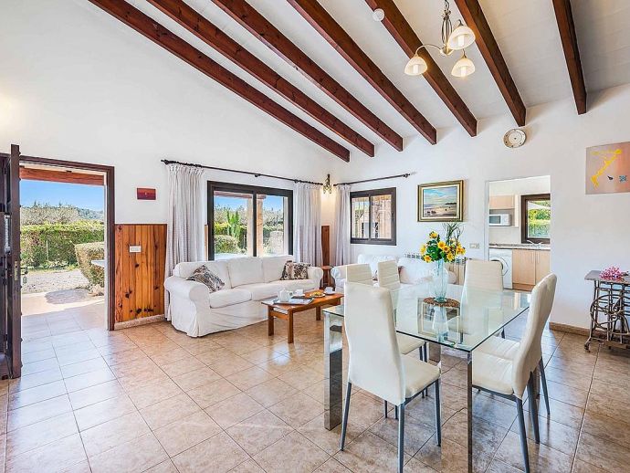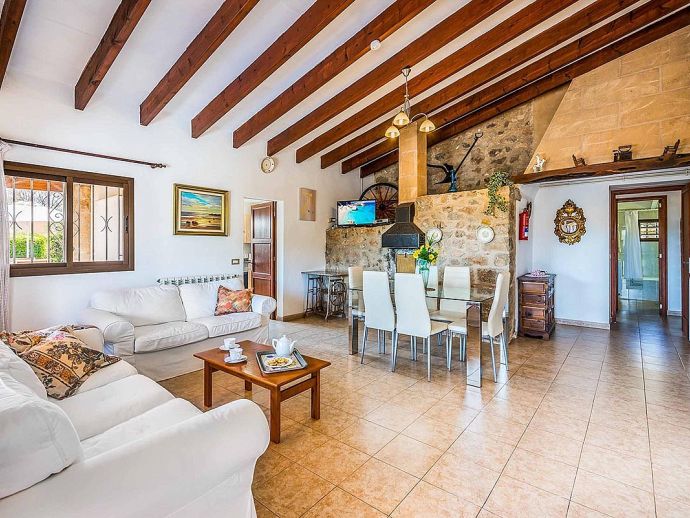 Casa Magda with a private pool is a lovely detached holiday villa for 6 guests located at the foot of the private El Vila Estate just outside of Port de Pollensa. The villa offers fabulous views over the El Vila area and the Tramuntana mountains as well as easy access to the popular sandy beach resort (5 mins drive), old town Pollensa and Cala San Vicente (10 mins drive). Inside, all the accommodation is on ground level and comprises, an entrance to the open plan lounge and dining area which is filled with character from the original beamed and tile ceiling through to the stone internal wall. A kitchen, fully equipped with conveniences including a dishwasher, washing machine, microwave, ceramic hob and oven with extractor fan and a fridge freezer. Three bedrooms, one double and two twins all with air-conditioning (on a timer), one full bathroom and a shower room with low access to the shower. Outside, you will find an inviting swimming pool surrounded by a terrace and a lawn edged with hedgerows that provide plenty of privacy for lazy days spent by the pool. A covered dining terrace with a built-in barbecue, perfect for grilled meals al fresco whilst enjoying the mountain views. Casa Magda is an ideal choice for families/friends who love outdoor space and views but also want to be within easy reach of the facilities Port de Pollensa has to offer including the famous Pine Walk and sandy beach.