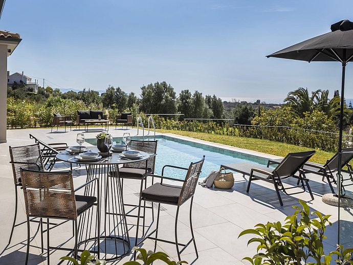 A predominantly West facing aspect keeps the private pool basking in sunshine all day long and allows the adjacent terrace to offer front row seats for those spectacular Mediterranean sunsets.