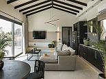 A combination of panoramic windows and large, sliding glass doors ensures the interior remains bright and welcoming, the palpable sense of space further enhanced by an impressive vaulted beamed ceiling in the living area. Furnishings, fabrics, fixtures and fittings are all stylish, tastefully chosen and perfectly colour-coordinated around a soothing palette of taupe, beige and pale magnolia.