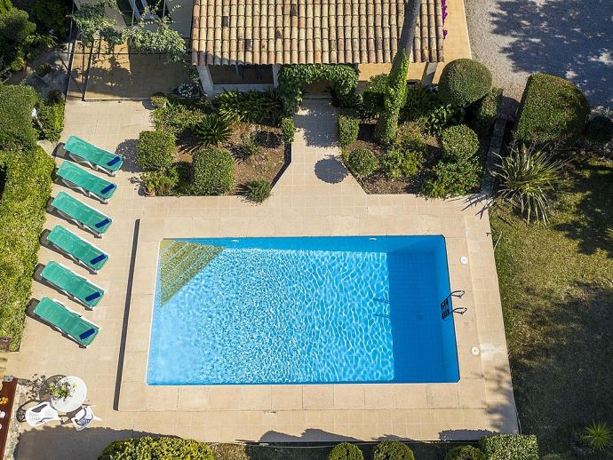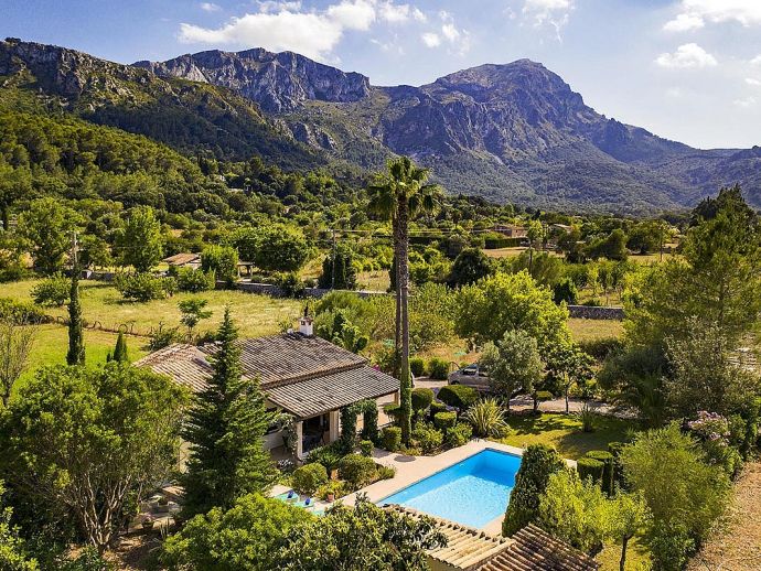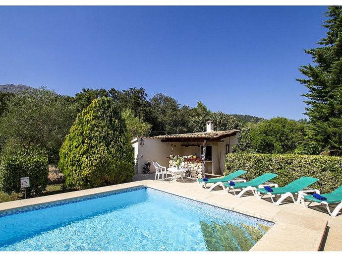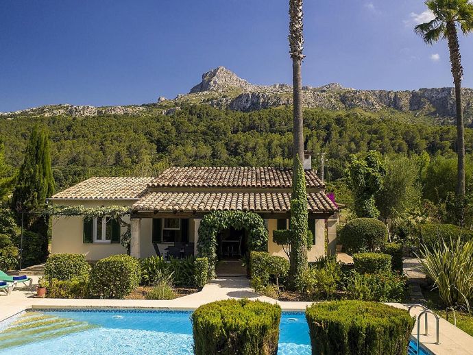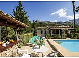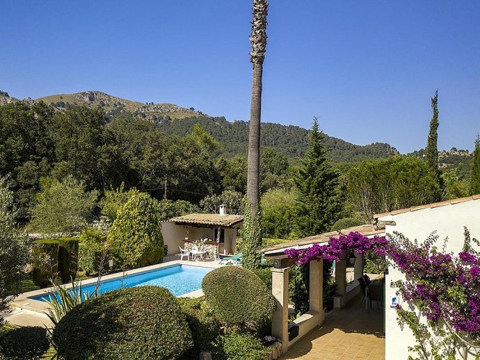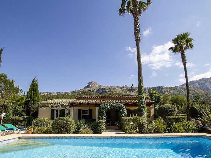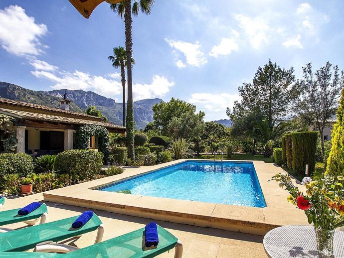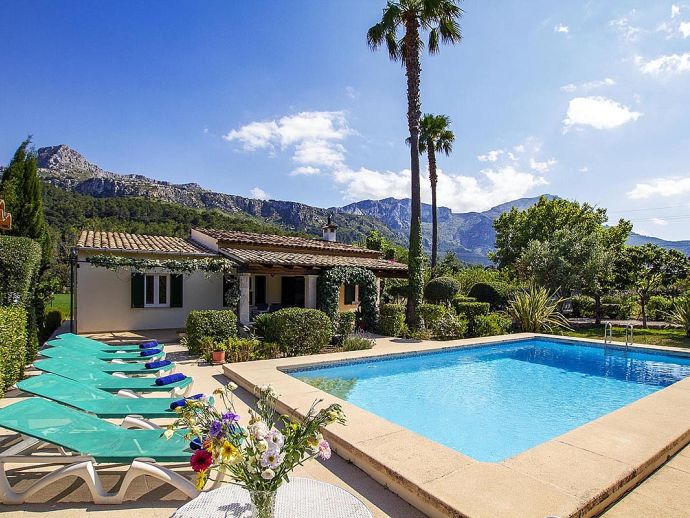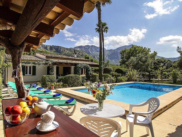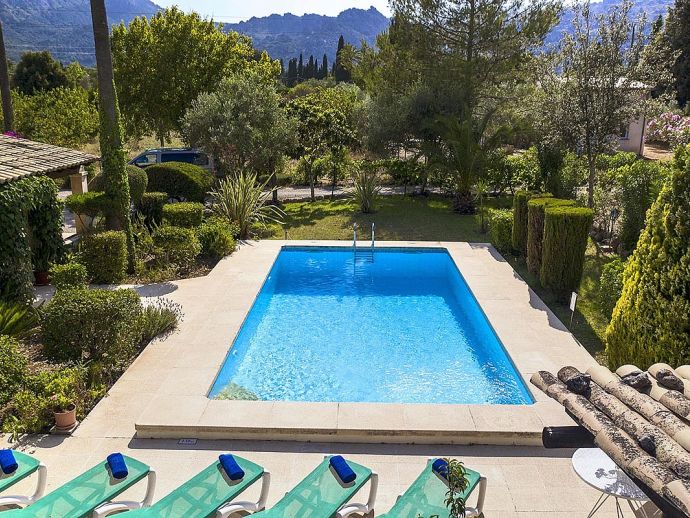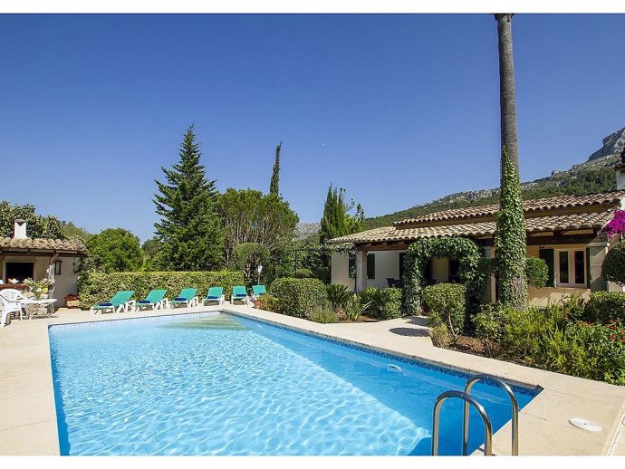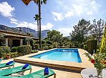 Villa Abigail with a private pool is a recently renewed holiday villa that occupies a prime location, situated in the beautiful Vall den Marc in the heart of the Pollenca countryside with an impressive backdrop of the Tramuntana mountain range. This peaceful and idyllic setting is approximately 10 minutes drive from old town Pollenca offering a variety of restaurants and shops, whilst the beaches and amenities of Port de Pollenca and Cala San Vicente are 15/20 minutes drive. This single-storey villa has been tastefully renovated and decorated to accommodate 6 guests and comprises an open plan living space with a lounge, dining area and fitted kitchen, three air-conditioned bedrooms and two bathrooms. Outside, the mature gardens are well-maintained and include two striking palm trees, a private pool, poolside shower, sun terrace with loungers, a covered barbecue area and cool shaded terraces that provide spectacular views and atmospheric corners for outside dining or simply relaxing. Villa Abigail is an attractive property with stunning views and would suit families or friends seeking a peaceful countryside location whilst still being within close proximity to shops, restaurants and beaches!