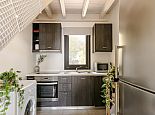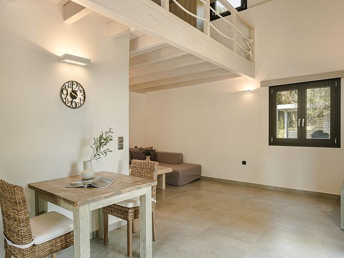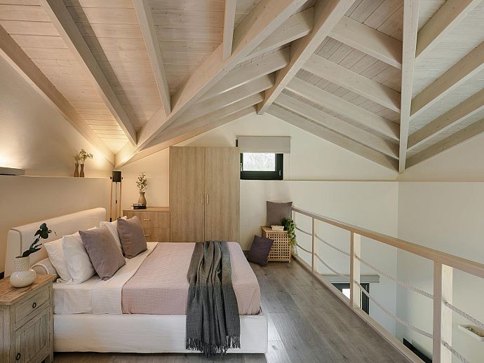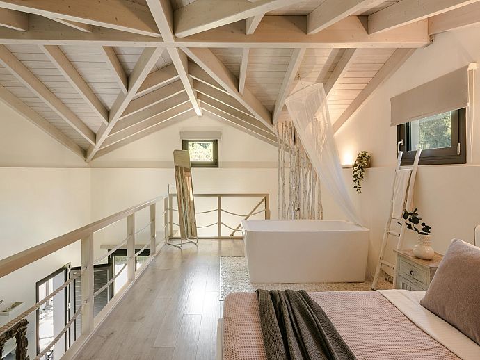 Equally welcoming, the air-conditioned, open-plan interior is furnished with care and decorated in soft, soothing pastel shades. Attractive, slate-grey coloured flooring, substantive roof beams, and an expansive mezzanine/bedroom with free-standing bathtub keep things easy on the eye and further evidence the owner’s deft, creative touch.