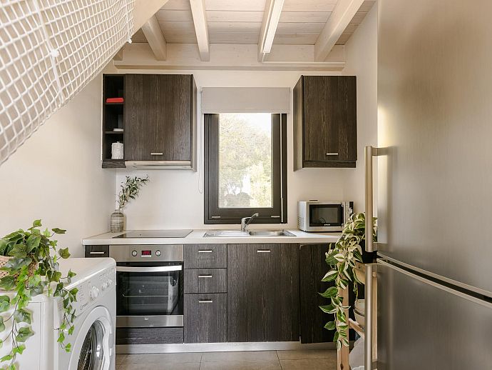 Ground Floor: Open plan living/dining room (Sat TV, DVD, WiFi) with doors to pool terrace. Kitchen (oven, microwave, dishwasher, washing machine). Shower room. Open tread wooden staircase to...