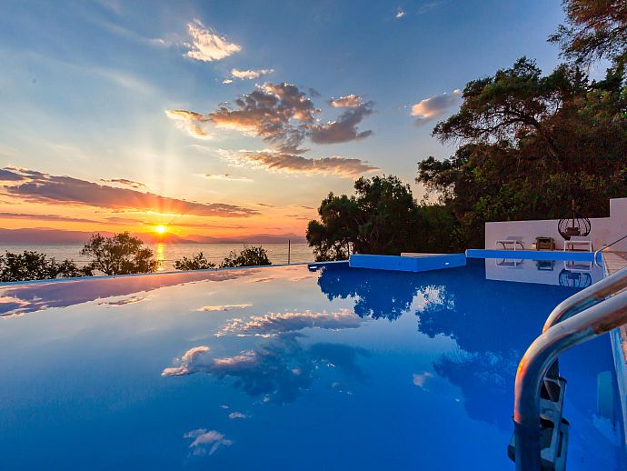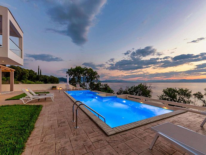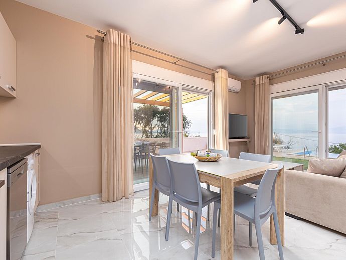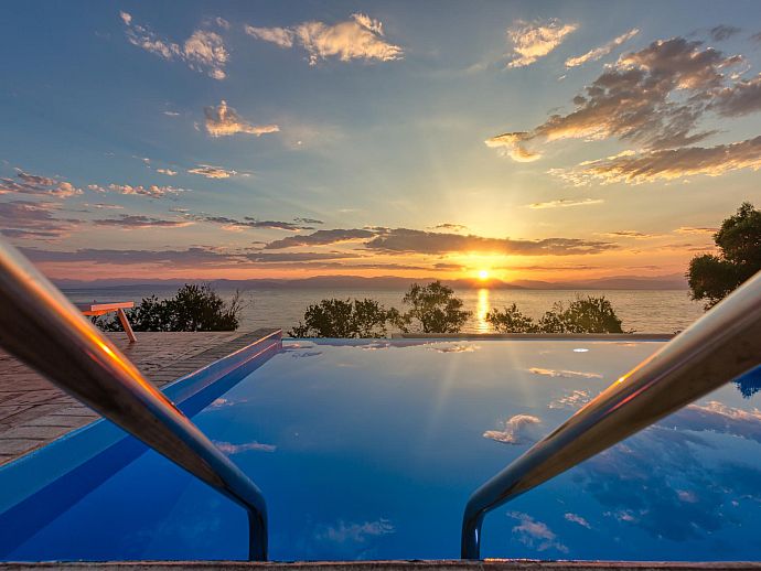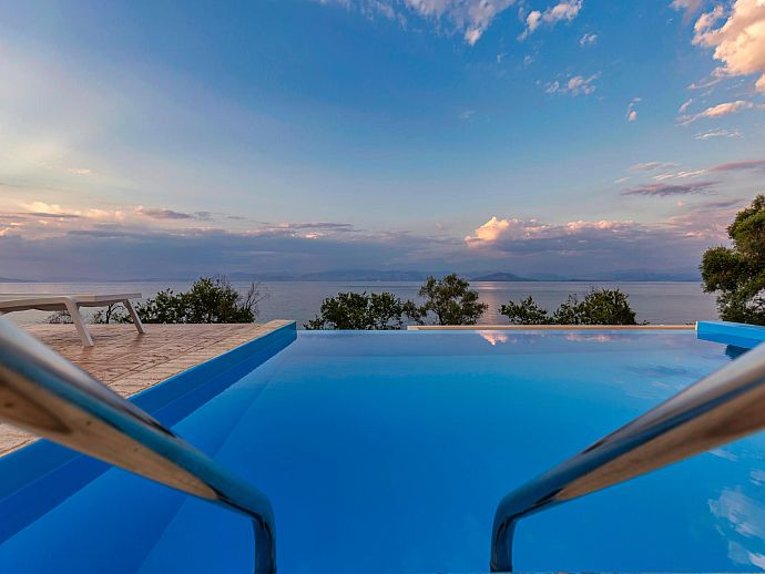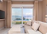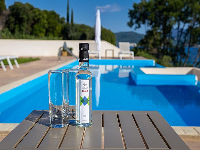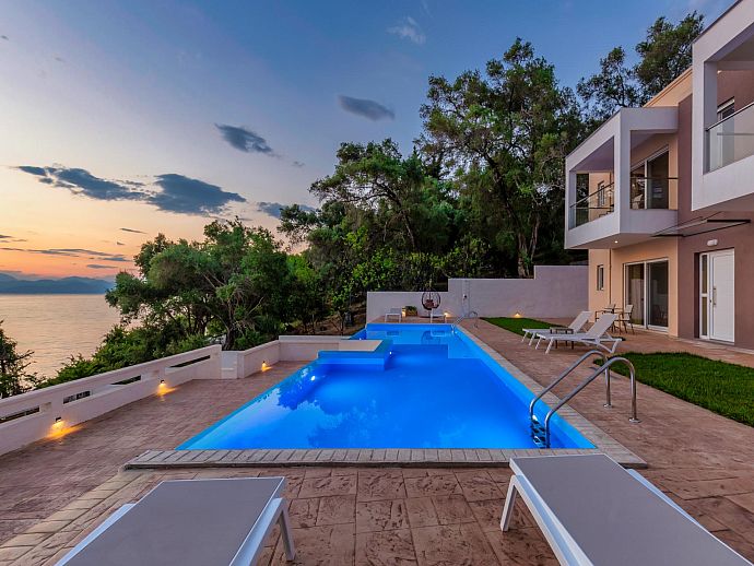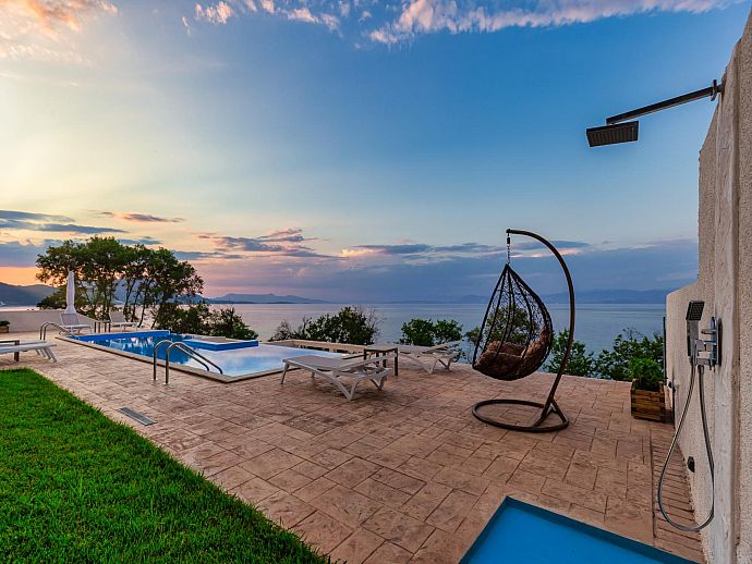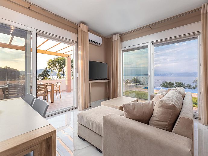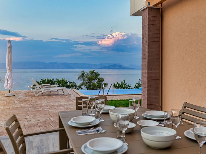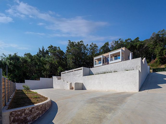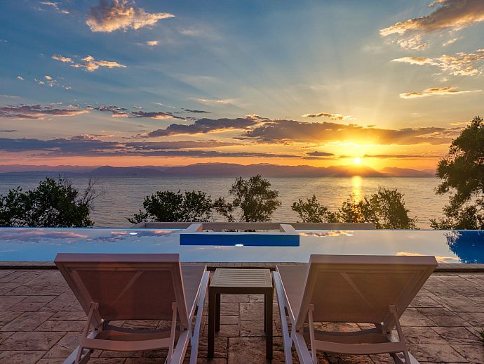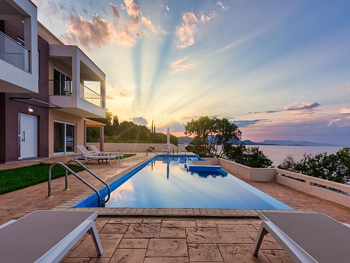 Undoubtedly this is a coveted location and the considerate local owners of Orizontas have gone out of their way to ensure that the benefits are fully maximised hence guests have at their disposal a gorgeous sweeping (suntrap!) terrace, a separate part-shaded dining terrace, much longer than average private swimming pool, natural foliage borders on either side of the property and direct sight of those remarkable 180°+ views from all the principal rooms via tall patio doors on the ground floor and glass-fronted balconies on the first floor.