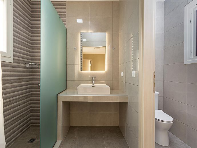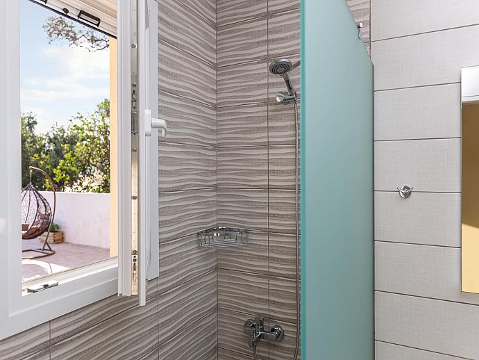 First Floor: Double bedroom (A/C) with en suite shower room and balcony. Twin bedroom (A/C) with en suite shower room and balcony.