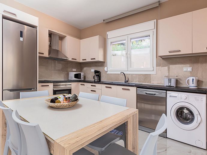 Ground Floor: Open plan living/dining room (Smart TV, WiFi, A/C) with doors to pool terrace and doors to dining terrace. Kitchen (oven, microwave, dishwasher, washing machine). Twin bedroom (A/C) with en suite shower room and doors to terrace. Cloakroom.