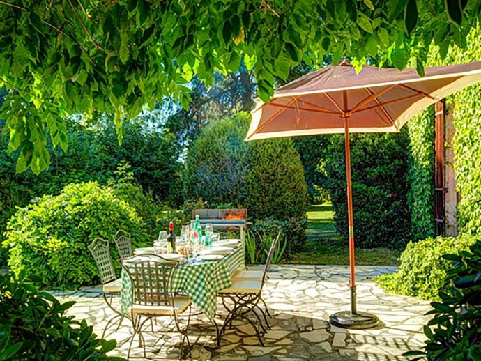 Outside: Enclosed mature grounds of garden, variety of trees, covered and open terraces. Barbecue. Table tennis. Private parking.