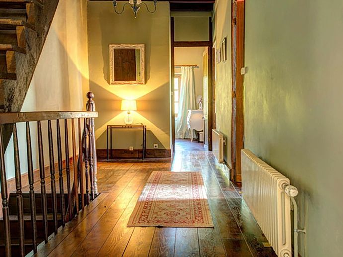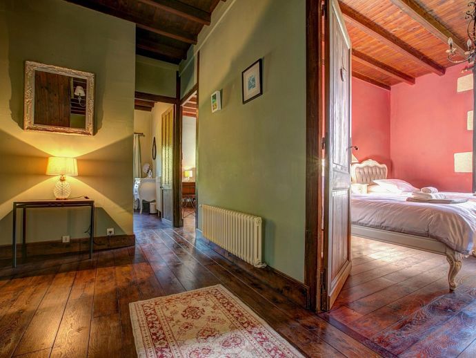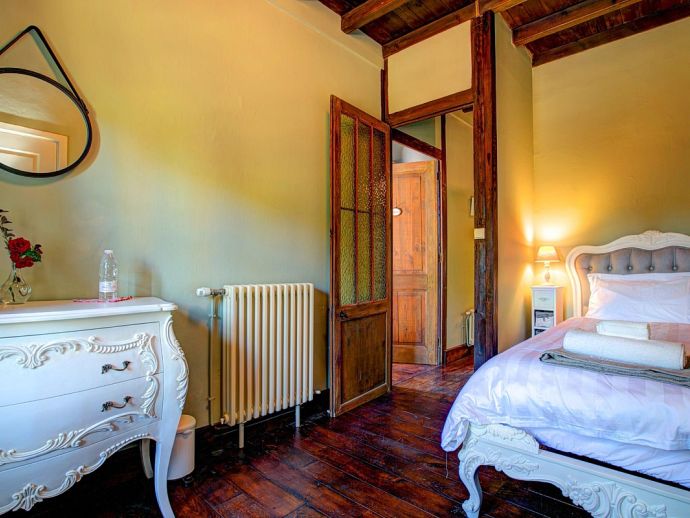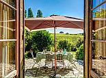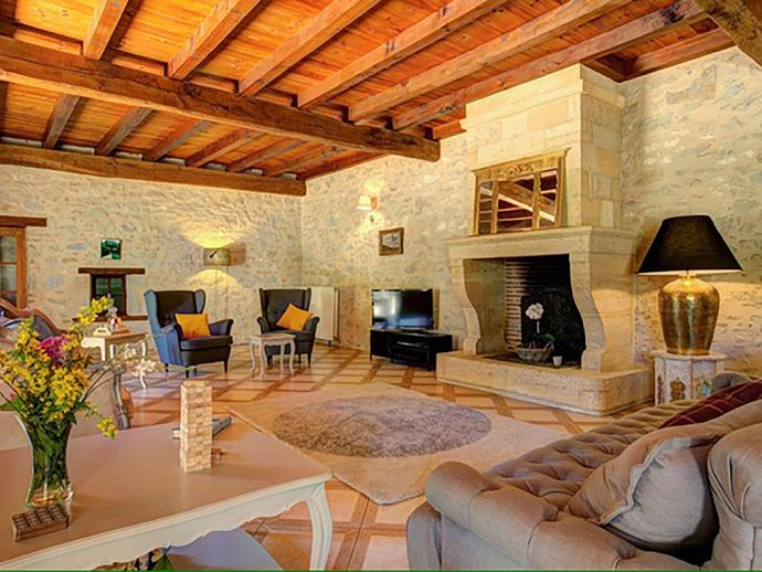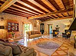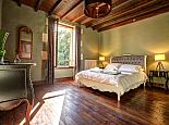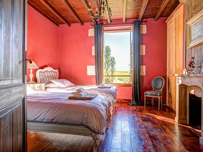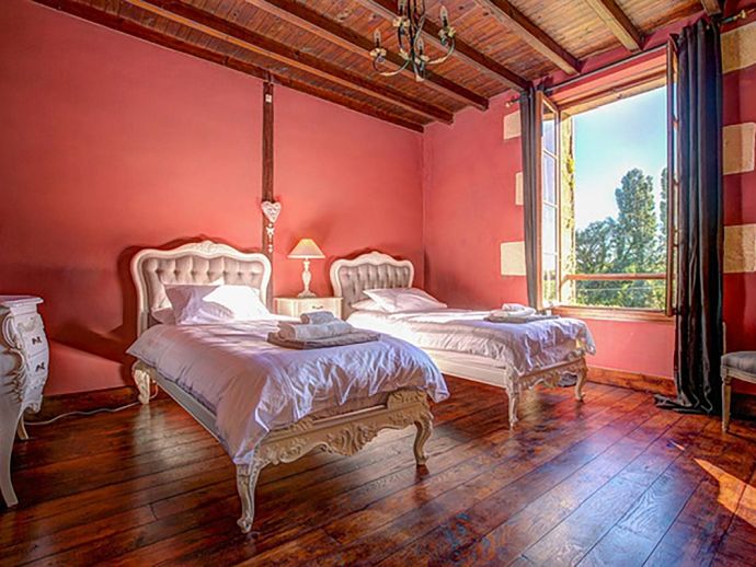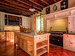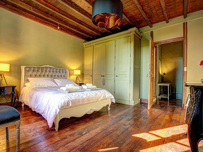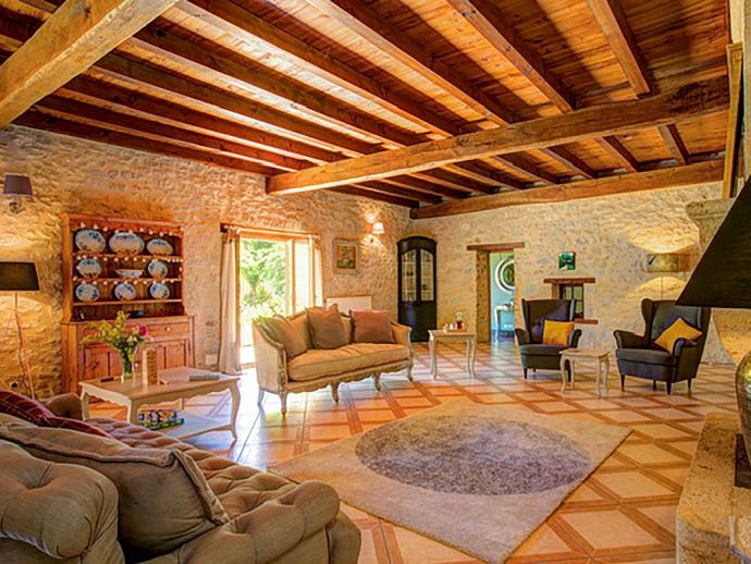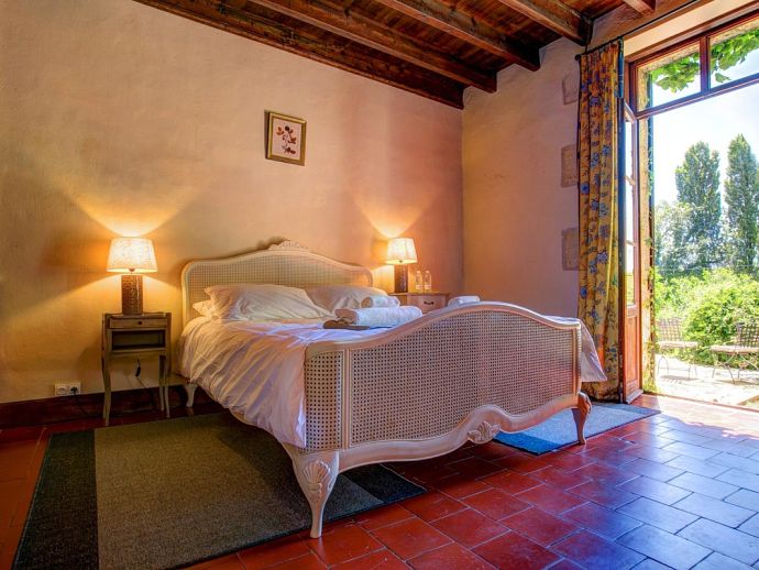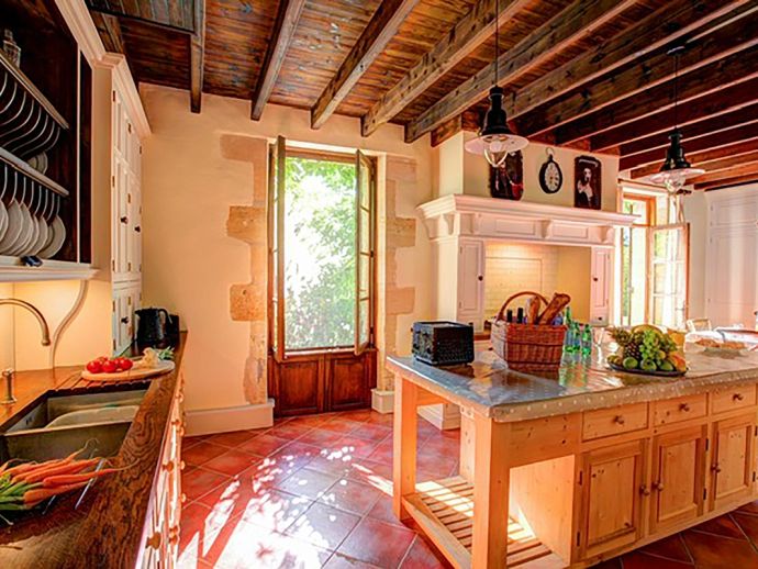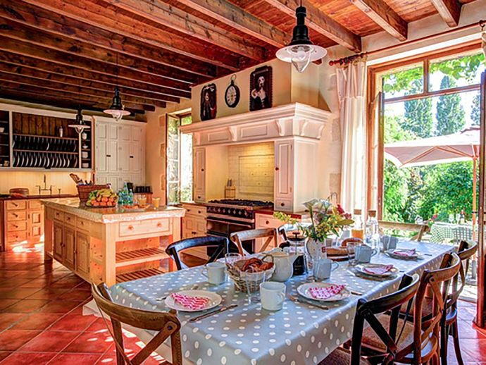 Relaxed, elegant living is the hallmark of French country style and can be found in abundance at La Levaille, imbued with a shot of glamour. High ceilings and dark wood floors are a classic backdrop to the ornate, baroque style bed furniture in the roomy bedrooms. The generous living room is furnished with elegant sofas and contemporary lighting, with exposed stone walls adding character. And finally, the kitchen/dining room has beautiful wood cabinets, an impressive range oven and French doors that lead out to the dining terrace.
